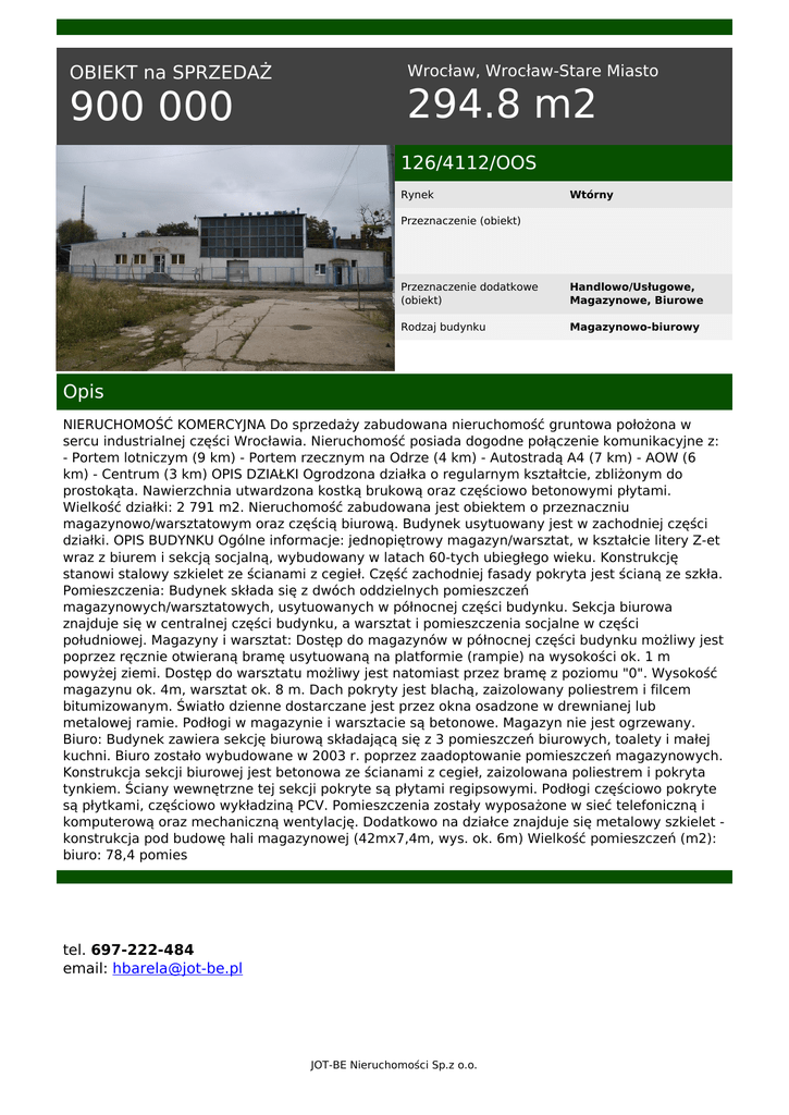 OBIEKT na SPRZEDAŻ 900 000 Wrocław, Wrocław-Stare Miasto 294.8 m2 126/4112/OOS Rynek Wtórny Przeznaczenie (obiekt) Przeznaczenie dodatkowe (obiekt) Handlowo/Usługowe, Magazynowe, Biurowe Rodzaj budynku Magazynowo-biurowy Opis NIERUCHOMOŚĆ KOMERCYJNA Do sprzedaży zabudowana nieruchomość gruntowa położona w sercu industrialnej części Wrocławia. Nieruchomość posiada dogodne połączenie komunikacyjne z: - Portem lotniczym (9 km) - Portem rzecznym na Odrze (4 km) - Autostradą A4 (7 km) - AOW (6 km) - Centrum (3 km) OPIS DZIAŁKI Ogrodzona działka o regularnym kształtcie, zbliżonym do prostokąta. Nawierzchnia utwardzona kostką brukową oraz częściowo betonowymi płytami. Wielkość działki: 2 791 m2. Nieruchomość zabudowana jest obiektem o przeznaczniu magazynowo/warsztatowym oraz częścią biurową. Budynek usytuowany jest w zachodniej części działki. OPIS BUDYNKU Ogólne informacje: jednopiętrowy magazyn/warsztat, w kształcie litery Z-et wraz z biurem i sekcją socjalną, wybudowany w latach 60-tych ubiegłego wieku. Konstrukcję stanowi stalowy szkielet ze ścianami z cegieł. Część zachodniej fasady pokryta jest ścianą ze szkła. Pomieszczenia: Budynek składa się z dwóch oddzielnych pomieszczeń magazynowych/warsztatowych, usytuowanych w północnej części budynku. Sekcja biurowa znajduje się w centralnej części budynku, a warsztat i pomieszczenia socjalne w części południowej. Magazyny i warsztat: Dostęp do magazynów w północnej części budynku możliwy jest poprzez ręcznie otwieraną bramę usytuowaną na platformie (rampie) na wysokości ok. 1 m powyżej ziemi. Dostęp do warsztatu możliwy jest natomiast przez bramę z poziomu "0". Wysokość magazynu ok. 4m, warsztat ok. 8 m. Dach pokryty jest blachą, zaizolowany poliestrem i filcem bitumizowanym. Światło dzienne dostarczane jest przez okna osadzone w drewnianej lub metalowej ramie. Podłogi w magazynie i warsztacie są betonowe. Magazyn nie jest ogrzewany. Biuro: Budynek zawiera sekcję biurową składającą się z 3 pomieszczeń biurowych, toalety i małej kuchni. Biuro zostało wybudowane w 2003 r. poprzez zaadoptowanie pomieszczeń magazynowych. Konstrukcja sekcji biurowej jest betonowa ze ścianami z cegieł, zaizolowana poliestrem i pokryta tynkiem. Ściany wewnętrzne tej sekcji pokryte są płytami regipsowymi. Podłogi częściowo pokryte są płytkami, częściowo wykładziną PCV. Pomieszczenia zostały wyposażone w sieć telefoniczną i komputerową oraz mechaniczną wentylację. Dodatkowo na działce znajduje się metalowy szkielet konstrukcja pod budowę hali magazynowej (42mx7,4m, wys. ok. 6m) Wielkość pomieszczeń (m2): biuro: 78,4 pomies tel. 697-222-484 email: [email protected] JOT-BE Nieruchomości Sp.z o.o. Powered by TCPDF (www.tcpdf.org)