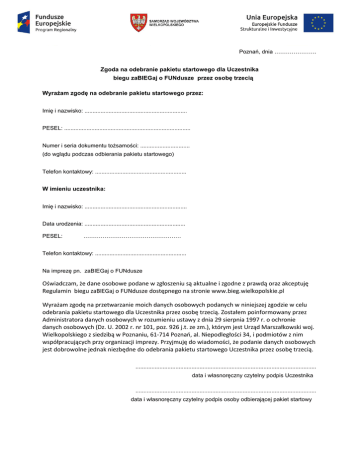 Poznań, dnia …………………. Zgoda na odebranie pakietu startowego dla Uczestnika biegu zaBIEGaj o FUNdusze przez osobę trzecią Wyrażam zgodę na odebranie pakietu startowego przez: Imię i nazwisko: ................................................................ PESEL: ............................................................................... Numer i seria dokumentu tożsamości: ............................... (do wglądu podczas odbierania pakietu startowego) Telefon kontaktowy: ......................................................... W imieniu uczestnika: Imię i nazwisko: ................................................................ Data urodzenia: ............................................................... PESEL: …………………………………………… Telefon kontaktowy: ......................................................... Na imprezę pn. zaBIEGaj o FUNdusze Oświadczam, że dane osobowe podane w zgłoszeniu są aktualne i zgodne z prawdą oraz akceptuję Regulamin biegu zaBIEGaj o FUNdusze dostępnego na stronie www.bieg.wielkopolskie.pl Wyrażam zgodę na przetwarzanie moich danych osobowych podanych w niniejszej zgodzie w celu odebrania pakietu startowego dla Uczestnika przez osobę trzecią. Zostałem poinformowany przez Administratora danych osobowych w rozumieniu ustawy z dnia 29 sierpnia 1997 r. o ochronie danych osobowych (Dz. U. 2002 r. nr 101, poz. 926 j.t. ze zm.), którym jest Urząd Marszałkowski woj. Wielkopolskiego z siedzibą w Poznaniu, 61-714 Poznań, al. Niepodległości 34, i podmiotów z nim współpracujących przy organizacji imprezy. Przyjmuję do wiadomości, że podanie danych osobowych jest dobrowolne jednak niezbędne do odebrania pakietu startowego Uczestnika przez osobę trzecią. ................................................................................................................. data i własnoręczny czytelny podpis Uczestnika ................................................................................................................. data i własnoręczny czytelny podpis osoby odbierającej pakiet startowy