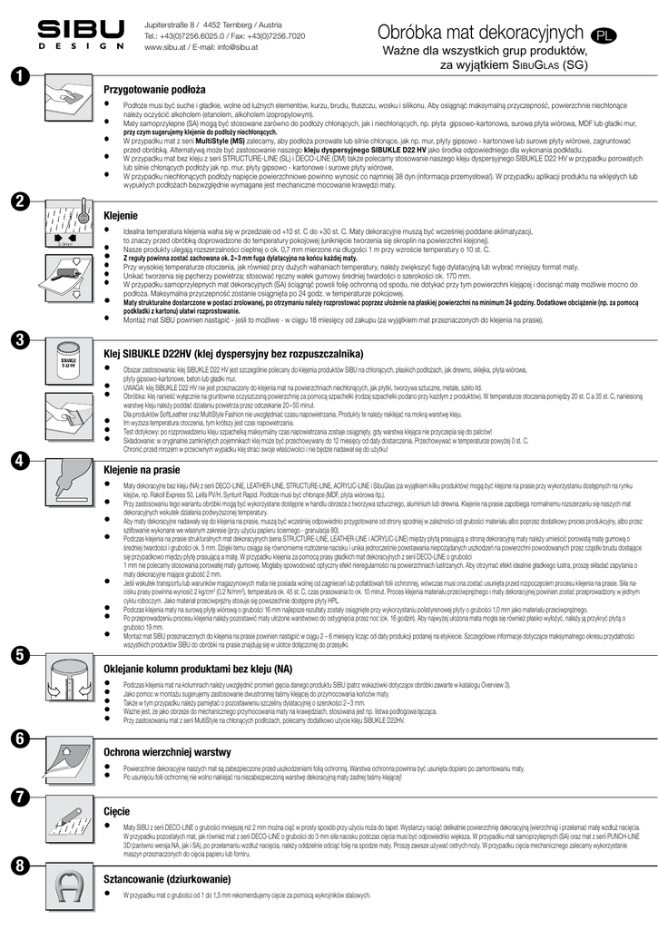 Jupiterstraße 8 / 4452 Ternberg / Austria Tel.: +43(0)7256.6025.0 / Fax: +43(0)7256.7020 www.sibu.at / E-mail: [email protected] 1 2 • • • • • • • • • • • • • • • Maty dekoracyjne bez kleju (NA) z serii DECO-LINE, LEATHER-LINE, STRUCTURE-LINE, ACRYLIC-LINE i SibuGlas (za wyjątkiem kilku produktów) mogą być klejone na prasie przy wykorzystaniu dostępnych na rynku klejów, np. Rakoll Express 50, Leifa PV/H, Synturit Rapid. Podłoże musi być chłonące (MDF, płyta wiórowa itp.). Przy zastosowaniu tego wariantu obróbki mogą być wykorzystane dostępne w handlu obrzeża z tworzywa sztucznego, aluminium lub drewna. Klejenie na prasie zapobiega normalnemu rozszerzaniu się naszych mat dekoracyjnych wskutek działania podwyższonej temperatury. Aby maty dekoracyjne nadawały się do klejenia na prasie, muszą być wcześniej odpowiednio przygotowane od strony spodniej w zależności od grubości materiału albo poprzez dodatkowy proces produkcyjny, albo przez szlifowanie wykonane we własnym zakresie (przy użyciu papieru ściernego - granulacja 80). Podczas klejenia na prasie strukturalnych mat dekoracyjnych (seria STRUCTURE-LINE, LEATHER-LINE i ACRYLIC-LINE) między płytą prasującą a stroną dekoracyjną maty należy umieścić porowatą matę gumową o średniej twardości i grubości ok. 5 mm. Dzięki temu osiąga się równomierne rozłożenie nacisku i unika jednocześnie powstawania niepożądanych uszkodzeń na powierzchni powodowanych przez cząstki brudu dostające się przypadkowo między płytę prasującą a matę. W przypadku klejenia za pomocą prasy gładkich mat dekoracyjnych z serii DECO-LINE o grubości 1 mm nie polecamy stosowania porowatej maty gumowej. Mogłaby spowodować optyczny efekt nieregularności na powierzchniach lustrzanych. Aby otrzymać efekt idealnie gładkiego lustra, proszę składać zapytania o maty dekoracyjne mające grubość 2 mm. Jeśli wskutek transportu lub warunków magazynowych mata nie posiada wolnej od zagnieceń lub pofałdowań folii ochronnej, wówczas musi ona zostać usunięta przed rozpoczęciem procesu klejenia na prasie. Siła nacisku prasy powinna wynosić 2 kg/cm2 (0,2 N/mm2), temperatura ok. 45 st. C, czas prasowania to ok. 10 minut. Proces klejenia materiału przeciwprężnego i maty dekoracyjnej powinien zostać przeprowadzony w jednym cyklu roboczym. Jako materiał przeciwprężny stosuje się powszechnie dostępne płyty HPL. Podczas klejenia maty na surową płytę wiórową o grubości 16 mm najlepsze rezultaty zostały osiągnięte przy wykorzystaniu polistyrenowej płyty o grubości 1,0 mm jako materiału przeciwprężnego. Po przeprowadzeniu procesu klejenia należy pozostawić maty ułożone warstwowo do ostygnięcia przez noc (ok. 16 godzin). Aby najwyżej ułożona mata mogła się również płasko wyłożyć, należy ją przykryć płytą o grubości 19 mm. Montaż mat SIBU przeznaczonych do klejenia na prasie powinien nastąpić w ciągu 2 – 6 miesięcy licząc od daty produkcji podanej na etykiecie. Szczegółowe informacje dotyczące maksymalnego okresu przydatności wszystkich produktów SIBU do obróbki na prasie znajdują się w ulotce dołączonej do przesyłki. Podczas klejenia mat na kolumnach należy uwzględnić promień gięcia danego produktu SIBU (patrz wskazówki dotyczące obróbki zawarte w katalogu Overview 3). Jako pomoc w montażu sugerujemy zastosowanie dwustronnej taśmy klejącej do przymocowania końców maty. Także w tym przypadku należy pamiętać o pozostawieniu szczeliny dylatacyjnej o szerokości 2 – 3 mm. Ważne jest, że jako obrzeże do mechanicznego przymocowania maty na krawędziach, stosowana jest np. listwa podłogowa łącząca. Przy zastosowaniu mat z serii MultiStyle na chłonących podłożach, polecamy dodatkowo użycie kleju SIBUKLE D22HV. Ochrona wierzchniej warstwy • • Powierzchnie dekoracyjne naszych mat są zabezpieczone przed uszkodzeniami folią ochronną. Warstwa ochronna powinna być usunięta dopiero po zamontowaniu maty. Po usunięciu folii ochronnej nie wolno naklejać na niezabezpieczoną warstwę dekoracyjną maty żadnej taśmy klejącej! Cięcie • 8 Obszar zastosowania: klej SIBUKLE D22 HV jest szczególnie polecany do klejenia produktów SIBU na chłonących, płaskich podłożach, jak drewno, sklejka, płyta wiórowa, płyty gipsowo-kartonowe, beton lub gładki mur. UWAGA: klej SIBUKLE D22 HV nie jest przeznaczony do klejenia mat na powierzchniach niechłonących, jak płytki, tworzywa sztuczne, metale, szkło itd. Obróbka: klej nanieść wyłącznie na gruntownie oczyszczoną powierzchnię za pomocą szpachelki (rodzaj szpachelki podano przy każdym z produktów). W temperaturze otoczenia pomiędzy 20 st. C a 35 st. C, naniesioną warstwę kleju należy poddać działaniu powietrza przez odczekanie 20 – 50 minut. Dla produktów SoftLeather oraz MultiStyle Fashion nie uwzględniać czasu napowietrzania. Produkty te należy naklejać na mokrą warstwę kleju. Im wyższa temperatura otoczenia, tym krótszy jest czas napowietrzania. Test dotykowy: po rozprowadzeniu kleju szpachelką maksymalny czas napowietrzania zostaje osiągnięty, gdy warstwa klejąca nie przyczepia się do palców! Składowanie: w oryginalnie zamkniętych pojemnikach klej może być przechowywany do 12 miesięcy od daty dostarczenia. Przechowywać w temperaturze powyżej 0 st. C. Chronić przed mrozem w przeciwnym wypadku klej straci swoje właściwości i nie będzie nadawał się do użytku! Oklejanie kolumn produktami bez kleju (NA) • • • • • 7 Idealna temperatura klejenia waha się w przedziale od +10 st. C do +30 st. C. Maty dekoracyjne muszą być wcześniej poddane aklimatyzacji, to znaczy przed obróbką doprowadzone do temperatury pokojowej (uniknięcie tworzenia się skroplin na powierzchni klejonej). Nasze produkty ulegają rozszerzalności cieplnej o ok. 0,7 mm mierzone na długości 1 m przy wzroście temperatury