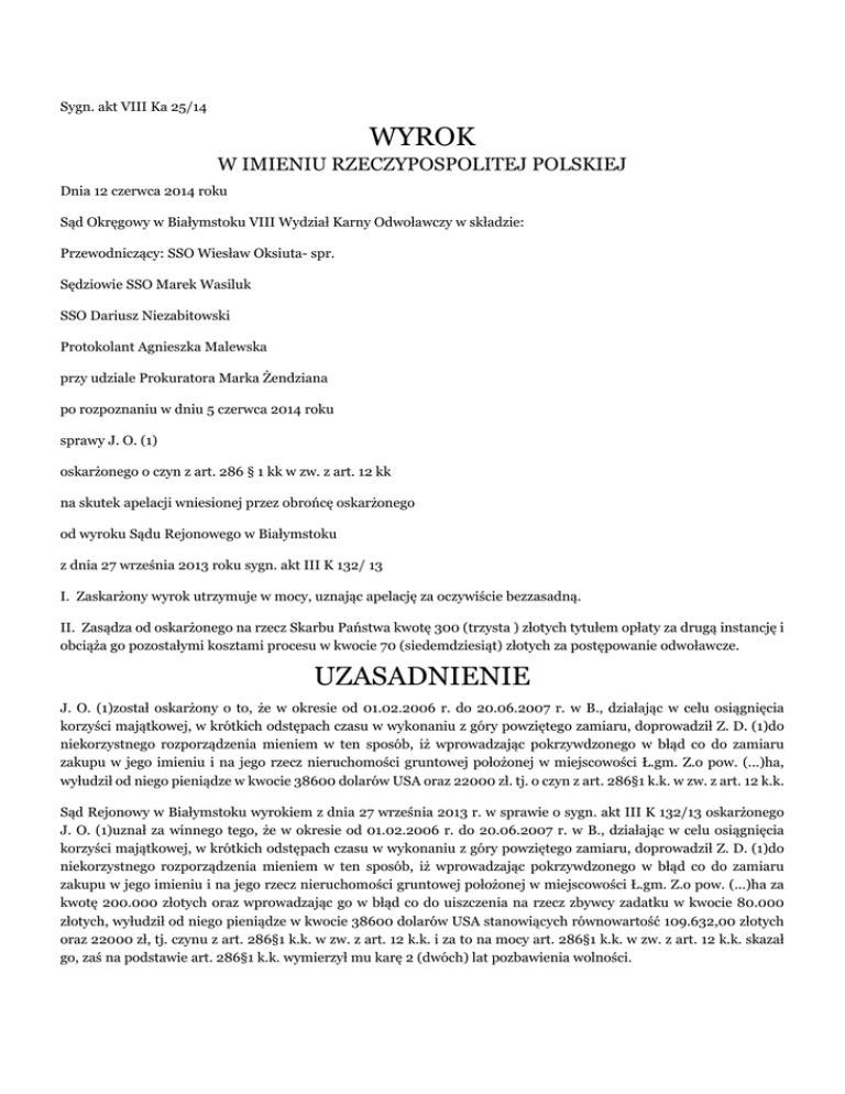 Sygn. akt VIII Ka 25/14 WYROK W IMIENIU RZECZYPOSPOLITEJ POLSKIEJ Dnia 12 czerwca 2014 roku Sąd Okręgowy w Białymstoku VIII Wydział Karny Odwoławczy w składzie: Przewodniczący: SSO Wiesław Oksiuta- spr. Sędziowie SSO Marek Wasiluk SSO Dariusz Niezabitowski Protokolant Agnieszka Malewska przy udziale Prokuratora Marka Żendziana po rozpoznaniu w dniu 5 czerwca 2014 roku sprawy J. O. (1) oskarżonego o czyn z art. 286 § 1 kk w zw. z art. 12 kk na skutek apelacji wniesionej przez obrońcę oskarżonego od wyroku Sądu Rejonowego w Białymstoku z dnia 27 września 2013 roku sygn. akt III K 132/ 13 I. Zaskarżony wyrok utrzymuje w mocy, uznając apelację za oczywiście bezzasadną. II. Zasądza od oskarżonego na rzecz Skarbu Państwa kwotę 300 (trzysta ) złotych tytułem opłaty za drugą instancję i obciąża go pozostałymi kosztami procesu w kwocie 70 (siedemdziesiąt) złotych za postępowanie odwoławcze. UZASADNIENIE J. O. (1)został oskarżony o to, że w okresie od 01.02.2006 r. do 20.06.2007 r. w B., działając w celu osiągnięcia korzyści majątkowej, w krótkich odstępach czasu w wykonaniu z góry powziętego zamiaru, doprowadził Z. D. (1)do niekorzystnego rozporządzenia mieniem w ten sposób, iż wprowadzając pokrzywdzonego w błąd co do zamiaru zakupu w jego imieniu i na jego rzecz nieruchomości gruntowej położonej w miejscowości Ł.gm. Z.o pow. (...)ha, wyłudził od niego pieniądze w kwocie 38600 dolarów USA oraz 22000 zł. tj. o czyn z art. 286§1 k.k. w zw. z art. 12 k.k. Sąd Rejonowy w Białymstoku wyrokiem z dnia 27 września 2013 r. w sprawie o sygn. akt III K 132/13 oskarżonego J. O. (1)uznał za winnego tego, że w okresie od 01.02.2006 r. do 20.06.2007 r. w B., działając w celu osiągnięcia korzyści majątkowej, w krótkich odstępach czasu w wykonaniu z góry powziętego zamiaru, doprowadził Z. D. (1)do niekorzystnego rozporządzenia mieniem w ten sposób, iż wprowadzając pokrzywdzonego w błąd co do zamiaru zakupu w jego imieniu i na jego rzecz nieruchomości gruntowej położonej w miejscowości Ł.gm. Z.o pow. (...)ha za kwotę 200.000 złotych oraz wprowadzając go w błąd co do uiszczenia na rzecz zbywcy zadatku w kwocie 80.000 złotych, wyłudził od niego pieniądze w kwocie 38600 dolarów USA stanowiących równowartość 109.632,00 złotych oraz 22000 zł, tj. czynu z art. 286§1 k.k. w zw. z art. 12 k.k. i za to na mocy art. 286§1 k.k. w zw. z art. 12 k.k. skazał go, zaś na podstawie art. 286§1 k.k. wymierzył mu karę 2 (dwóch) lat pozbawienia wolności. Na mocy art. 46§1 k.k. orzekł wobec oskarżonego środek karny w postaci obowiązku naprawienia w całości szkody spowodowanej przestępstwem poprzez zapłatę na rzecz pokrzywdzonego Z. D. (1) kwoty 131.632,00 (sto trzydzieści jeden tysięcy sześćset trzydzieści dwa) złotych. Zasądził od oskarżonego J. O. (1) na rzecz oskarżyciela posiłkowego Z. D. (1) kwotę 756,00 (siedemset pięćdziesiąt sześć) złotych tytułem kosztów zastępstwa procesowego. Zasądził od oskarżonego na rzecz Skarbu Państwa tytułem opłaty kwotę 300 (trzysta) złotych oraz obciążył go pozostałymi kosztami sądowymi w kwocie 625,21 (sześćset dwadzieścia pięć i 21/100) złotych. Powyższy wyrok, na podstawie art. 425 k.p.k. i art. 444 k.p.k. zaskarżył w całości obrońca oskarżonego i na mocy art. 427§1 i 2 k.p.k. oraz art. 438 pkt. 2 i 3 k.p.k. wyrokowi temu zarzucił: 1/ obrazę przepisów postępowania, mającą wpływ na treść orzeczenia, a mianowicie art. 442§3 k.p.k. poprzez niezastosowanie się do wytycznych Sądu Odwoławczego i nieustalenie istotnych kwestii mających znaczenie dla rozstrzygnięcia sprawy, a mianowicie: a/ powodów przekazania oskarżonemu równowartości kilkudziesięciu tysięcy złotych na ponad półtora roku przed potencjalną transakcją zakupu nieruchomości, b/ okoliczności przekazania pokrzywdzonemu kwoty 10.000 dolarów USA za pośrednictwem W. K. w 2008 r. z tytułu zaliczki na poczet zakupu nieruchomości w miejscowości Ł., II/ błąd w ustaleniach faktycznych, mający wpływ na treść orzeczenia, a polegający na przyjęciu, że: a/ Z. D. (1)na początku 2006 r. podjął decyzję o zakupie działki budowlanej na terytorium P.podczas gdy pokrzywdzony w swoich zeznaniach wskazywał, że „na przełomie roku 2006 i 2007 postanowił kupić nieruchomość wP.”, a zeznania te znajdują potwierdzenie w zgromadzonym materialne dowodowym, tj. w zeznaniach D.i wyjaśnieniach oskarżonego, b/ oskarżony działał w warunkach czynu ciągłego w okresie od 1.02.2006 r. do 29.08.2007 r. podczas gdy ze zgromadzonego materiału dowodowego wynika, że rozmowy w sprawie zakupu działki rozpoczęły się dopiero na przełomie roku 2006 i 2007, na co wskazuje między innymi upoważnienie do nabycia nieruchomości opatrzone datą 12.06.2007 r. oraz zeznania G. K. (1) i początkowe zeznania Z. D. (1) oraz Z. D. (2), ponadto oskarżony nie mógł działać w wykonaniu z góry powziętego wprowadzenia w błąd Z. D. (1) co do faktu zakupu na jego rzecz nieruchomości, ponieważ od początku podejmował on działania mające na celu sfinalizowanie pomiędzy stronami transakcji, między innymi negocjował cenę i warunki zakupu z G. K. (1) i podjął się pomocy w uzyskaniu zgody na sprzedaż działki przez małoletnią J. O. (2), c/ oskarżony wyłudził od Z. D. (1) kwotę 38.600 dolarów amerykańskich 22.000 złotych, podczas gdy ze zgromadzonego materiału dowodowego w sposób jednoznaczny wynika jedynie, że oskarżony otrzymał od Z. D. (1) na działki kwotę 10.000 dolarów amerykańskich, która to kwota została następnie pokrzywdzonemu w całości zwrócona, d/ polegającą na przyjęciu, że oskarżony otrzymał od Z. D. (1) w ramach rozliczeń związanych z zakupem działki samochód marki L. (...), podczas gdy materiał dowodowy nie wskazuje, aby samochód ten był przedmiotem rozporządzenia majątkiem pokrzywdzonego w