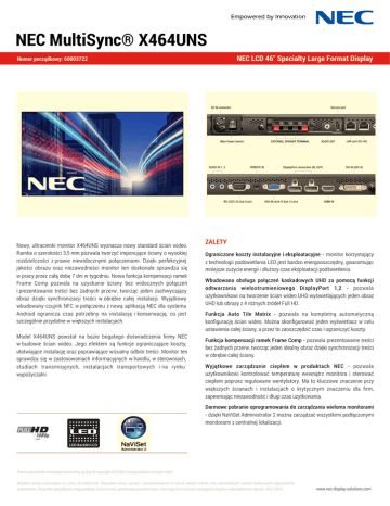 NEC MultiSync® X464UNS NEC LCD 46" Specialty Large Format Display Numer porządkowy: 60003722 Nowy, ultracienki monitor X464UNS wyznacza nowy standard ścian wideo. Ramka o szerokości 3,5 mm pozwala tworzyć imponujące ściany o wysokiej rozdzielczości z prawie niewidocznymi połączeniami. Dzięki perfekcyjnej jakości obrazu oraz niezawodności monitor ten doskonale sprawdza się w pracy przez całą dobę 7 dni w tygodniu. Nowa funkcja kompensacji ramek Frame Comp pozwala na uzyskanie ściany bez widocznych połączeń i prezentowanie treści bez żadnych przerw, tworząc jeden zachwycający obraz dzięki synchronizacji treści w obrębie całej instalacji. Wyjątkowy wbudowany czujnik NFC w połączeniu z nową aplikacją NEC dla systemu Android ogranicza czas potrzebny na instalację i konserwację, co jest szczególnie przydatne w większych instalacjach. Model X464UNS powstał na bazie bogatego doświadczenia firmy NEC w budowie ścian wideo. Jego efektem są funkcje ograniczające koszty, ułatwiające instalację oraz poprawiające wizualny odbiór treści. Monitor ten sprawdza się w zastosowaniach informacyjnych w handlu, w sterowniach, studiach transmisyjnych, instalacjach transportowych i na rynku wypożyczalni. ZALETY Ograniczone koszty instalacyjne i eksploatacyjne - monitor korzystający z technologii podświetlania LED jest bardzo energooszczędny, gwarantując mniejsze zużycie energii i dłuższy czas eksploatacji podświetlenia. Wbudowana obsługa połączeń kaskadowych UHD za pomocą funkcji odtwarzania wielostrumieniowego DisplayPort 1,2 - pozwala użytkownikowi na tworzenie ścian wideo UHD wyświetlających jeden obraz UHD lub obrazy z 4 różnych źródeł Full HD. Funkcja Auto Tile Matrix - pozwala na kompletną automatyczną konfigurację ścian wideo. Można skonfigurować jeden wyświetlacz w celu ustawienia całej ściany, a przez to zaoszczędzić czas i ograniczyć koszty. Funkcja kompensacji ramek Frame Comp - pozwala prezentowanie treści bez żadnych przerw, tworząc jeden idealny obraz dzięki synchronizacji treści w obrębie całej ściany. Wyjątkowe zarządzanie ciepłem w produktach NEC - pozwala użytkownikowi kontrolować temperaturę wewnątrz monitora i sterować ciepłem poprzez regulowane wentylatory. Ma to kluczowe znaczenie przy większych ścianach i instalacjach o krytycznym znaczeniu dla firm, zapewniając niezawodność i długi czas użytkowania. Darmowe pobranie oprogramowania do zarządzania wieloma monitorami - dzięki NaViSet Administrator 2 można zarządzać wszystkimi podłączonymi monitorami z centralnej lokalizacji. Prawa autorskie do niniejszego dokumentu są przy © copyright 2015 NEC Display Solutions Europe GmbH. Wszelkie prawa zastrzeżone na rzecz ich właścicieli. Wszystkie nazwy sprzętu i oprogramowania to nazwy własne marek i/lub zastrzeżonych znaków towarowych odpowiednich producentów. Wszystkie specyfikacje mogą podlegać zmianom bez uprzedniego powiadamiania. Zastrzega się możliwość wystąpienia błędów i niekompletności danych. 08.07.2015 www.nec-display-solutions.com NEC MultiSync® X464UNS - Dane techniczne Rodzaj panelu S-PVA TFT z bezspośrednim białym podświetleniem LED backlight Użyteczna powierzchnia [cale/cm] 1,018.1 x 572.7 Wielkość ekranu [cale/cm] 46 / 116.8 Proporcje obrazu 16:9 Jasność [cd/m²] 500, (700 max) Kontrast 3500:1 Kąty widzenia [°] 178 poziomo / 178 pionowo (CR 10:1) Czas reakcji [ms] 8 Częstotliwość odświeżania obrazu [Hz] 60 Haze Level [%] 44 Obsługiwana orientacja obrazu Ekranem do góry; Pionowa; Pozioma Częstotliwość pozioma [kHz] 31.5 - 91.1 Częstotliwość pionowa [Hz] 50 - 85 Rozdzielczość natywna 1920 x 1080 przy 60 Hz Obsługa na złączach DisplayPort i HDMI 3840 x 2160 (24/30 Hz); 1920 x 1080; 1600 x 1200; 1360 x 768; 1280 x 1024; 1280 x 768; 1080i; 1080p; 1024 x 768; 800 x 600; 720p (50/60 Hz); 640 x 480; 576p (50 Hz); 480p (60 Hz) Obsługa tylko na złączu HDMI 4096 x 2160 (24 Hz); 3840 x 2160 (25 Hz); 1360 x 768; 576i (50 Hz); 480i (60 Hz) Wejścia wideo analogowe 1 x D-sub 15 pin Wejścia wideo cyfrowe 1 x DisplayPort (HDCP); 1 x DVI-D (z HDCP); 1 x HDMI (HDCP) Wejścia audio analogowe 2 x 3,5 mm jack Wejścia audio cyfrowe 1 x HDMI; 1 x Interfejs DisplayPort Kontrola wejścia przewód zdalnego sterowania (jack 3,5 mm); RS232; Sieć LAN 100 Mbit Wyjścia wideo cyfrowe Wyjścia DisplayPort x 1 (złącze przelotowe: DisplayPort, DVI-D, HDMI, gniazda rozszerzeń interfejsów, OPS) Wyjścia audio analogowe 3,5mm jack Kontrola wyjścia Sieć LAN 100 Mbit Funkcje pilota LAN z SNMP; RS-232C (9-pin D-sub) Input; Zdalne sterowanie przez podczerwień (czujnik wewn./zewn. (opcjonalnie)) Rodzaj slot Open Pluggable Specification (Standard NEC / Intel OPS) Prąd rozruchowy [A] max. 10 Pobór mocy [W] max. 61 Napięcie/Prąd [V/A] 16/4 GNIAZDO ROZSZERZEŃ INTERFEJSÓW Technologia zastosowana w gniazdach rozszerzenie interfejsu analogowego i cyfrowego (standard NEC) CZUJNIKI Czujnik natężenia oświetlenia w otoczeniu Opcjonalny, możliwość programowania uruchamianych działań Czujnik obecności człowieka Opcjonalny, zewnętrzny, zasięg 4–5 m, z możliwością programowania uruchamianych działań Czujnik temperatury Wbudowany, liczba czujników: 3, z możliwością programowania uruchamianych działań Czujnik NFC Wbudowany, zasięg 2 cm, wymagana darmowa aplikacja NEC dla systemu Android Pobór mocy [W] 120 wysyłka; 255 (maks.) Tryb Power Save [W] < 0,5 (tryb czuwania EKO); < 1 Zarządzanie energią VESA DPMS Temperatura otoczenia podczes pracy [°C] +0 to +40 Wilgotność otoczenia podczas pracy [%] 20 to 80 Wymiary [mm] Bez nóżek: 1 022 x 576,6 x 101,3 Waga [kg] Bez nóżek: 20,4 Szerokość ramki [mm] 1,2 (dół/prawa); 2.3 top/left; 3.5; Odległość między dwoma sąsiednimi ekranami 3,7 Mocowanie VESA [mm] 300 x 300 (FDMI); 4 otwory; śruby M6 Cechy Specjalne Automatyczne ostrzeżenie e-mail; Automatyczne przypisanie ID; Funkcja 