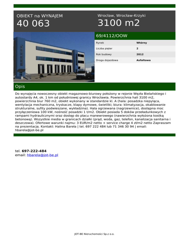 OBIEKT na WYNAJEM 40 063 Wrocław, Wrocław-Krzyki 3100 m2 69/4112/OOW Rynek Wtórny Liczba pięter 2 Rok budowy 2012 Droga dojazdowa Asfaltowa Opis Do wynajęcia nowoczesny obiekt magaznowo-biurowy położony w rejonie Węzła Bielańskiego i autostardy A4, ok. 1 km od południowej granicy Wrocławia. Powierzchnia hali 3100 m2, powierzchnia biur 760 m2, obiekt wykonany w standardzie kl. A (hala: posadzka niepyląca, wentylacja mechaniczna, tryskacze, klapy dymowe, świetliki; biura: klimatyzacja, okablowanie strukturalne, sufity podwieszane, wykładzina). Hala ogrzewana (nagrzewnice), dostępna moc przyłączeniowa 100 kW, nośność posadzki 1 t/m2. Obiekt posiada 5 doków przeładunkowych z rampami hydraulicznymi oraz dostęp do placu manewrowego (nawierzchnia wyłożona kostką betonową). Wszystkie media w granicach działki (prąd, woda, gaz, telefon, kanalizacja sanitarna i deszczowa). Ofertowe warunki najmu: 3 EUR/m2 netto + service charge 4 zł/m2 netto Zapraszam na prezentację. Kontakt: Halina Bareła | tel. 697 222 484 lub 71 346 30 94 | email: [email protected] tel. 697-222-484 email: [email protected] JOT-BE Nieruchomości Sp.z o.o. Powered by TCPDF (www.tcpdf.org)