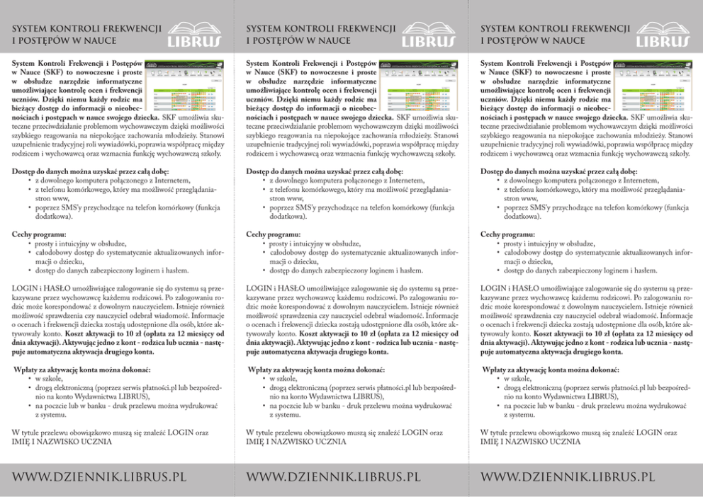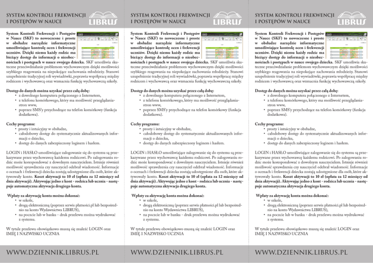 SYSTEM KONTROLI FREKWENCJI I POSTĘPÓW W NAUCE SYSTEM KONTROLI FREKWENCJI I POSTĘPÓW W NAUCE SYSTEM KONTROLI FREKWENCJI I POSTĘPÓW W NAUCE System Kontroli Frekwencji i Postępów w Nauce (SKF) to nowoczesne i proste w obsłudze narzędzie informatyczne umożliwiające kontrolę ocen i frekwencji uczniów. Dzięki niemu każdy rodzic ma bieżący dostęp do informacji o nieobecnościach i postępach w nauce swojego dziecka. SKF umożliwia skuteczne przeciwdziałanie problemom wychowawczym dzięki możliwości szybkiego reagowania na niepokojące zachowania młodzieży. Stanowi uzupełnienie tradycyjnej roli wywiadówki, poprawia współpracę między rodzicem i wychowawcą oraz wzmacnia funkcję wychowawczą szkoły. System Kontroli Frekwencji i Postępów w Nauce (SKF) to nowoczesne i proste w obsłudze narzędzie informatyczne umożliwiające kontrolę ocen i frekwencji uczniów. Dzięki niemu każdy rodzic ma bieżący dostęp do informacji o nieobecnościach i postępach w nauce swojego dziecka. SKF umożliwia skuteczne przeciwdziałanie problemom wychowawczym dzięki możliwości szybkiego reagowania na niepokojące zachowania młodzieży. Stanowi uzupełnienie tradycyjnej roli wywiadówki, poprawia współpracę między rodzicem i wychowawcą oraz wzmacnia funkcję wychowawczą szkoły. System Kontroli Frekwencji i Postępów w Nauce (SKF) to nowoczesne i proste w obsłudze narzędzie informatyczne umożliwiające kontrolę ocen i frekwencji uczniów. Dzięki niemu każdy rodzic ma bieżący dostęp do informacji o nieobecnościach i postępach w nauce swojego dziecka. SKF umożliwia skuteczne przeciwdziałanie problemom wychowawczym dzięki możliwości szybkiego reagowania na niepokojące zachowania młodzieży. Stanowi uzupełnienie tradycyjnej roli wywiadówki, poprawia współpracę między rodzicem i wychowawcą oraz wzmacnia funkcję wychowawczą szkoły. Dostęp do danych można uzyskać przez całą dobę: • z dowolnego komputera połączonego z Internetem, • z telefonu komórkowego, który ma możliwość przeglądaniastron www, • poprzez SMS’y przychodzące na telefon komórkowy (funkcja dodatkowa). Dostęp do danych można uzyskać przez całą dobę: • z dowolnego komputera połączonego z Internetem, • z telefonu komórkowego, który ma możliwość przeglądaniastron www, • poprzez SMS’y przychodzące na telefon komórkowy (funkcja dodatkowa). Dostęp do danych można uzyskać przez całą dobę: • z dowolnego komputera połączonego z Internetem, • z telefonu komórkowego, który ma możliwość przeglądaniastron www, • poprzez SMS’y przychodzące na telefon komórkowy (funkcja dodatkowa). Cechy programu: • prosty i intuicyjny w obsłudze, • całodobowy dostęp do systematycznie aktualizowanych informacji o dziecku, • dostęp do danych zabezpieczony loginem i hasłem. Cechy programu: • prosty i intuicyjny w obsłudze, • całodobowy dostęp do systematycznie aktualizowanych informacji o dziecku, • dostęp do danych zabezpieczony loginem i hasłem. Cechy programu: • prosty i intuicyjny w obsłudze, • całodobowy dostęp do systematycznie aktualizowanych informacji o dziecku, • dostęp do danych zabezpieczony loginem i hasłem. LOGIN i HASŁO umożliwiające zalogowanie się do systemu są przekazywane przez wychowawcę każdemu rodzicowi. Po zalogowaniu rodzic może korespondować z dowolnym nauczycielem. Istnieje również możliwość sprawdzenia czy nauczyciel odebrał wiadomość. Informacje o ocenach i frekwencji dziecka zostają udostępnione dla osób, które aktywowały konto. Koszt aktywacji to 10 zł (opłata za 12 miesięcy od dnia aktywacji). Aktywując jedno z kont - rodzica lub ucznia - następuje automatyczna aktywacja drugiego konta. LOGIN i HASŁO umożliwiające zalogowanie się do systemu są przekazywane przez wychowawcę każdemu rodzicowi. Po zalogowaniu rodzic może korespondować z dowolnym nauczycielem. Istnieje również możliwość sprawdzenia czy nauczyciel odebrał wiadomość. Informacje o ocenach i frekwencji dziecka zostają udostępnione dla osób, które aktywowały konto. Koszt aktywacji to 10 zł (opłata za 12 miesięcy od dnia aktywacji). Aktywując jedno z kont - rodzica lub ucznia - następuje automatyczna aktywacja drugiego konta. LOGIN i HASŁO umożliwiające zalogowanie się do systemu są przekazywane przez wychowawcę każdemu rodzicowi. Po zalogowaniu rodzic może korespondować z dowolnym nauczycielem. Istnieje również możliwość sprawdzenia czy nauczyciel odebrał wiadomość. Informacje o ocenach i frekwencji dziecka zostają udostępnione dla osób, które aktywowały konto. Koszt aktywacji to 10 zł (opłata za 12 miesięcy od dnia aktywacji). Aktywując jedno z kont - rodzica lub ucznia - następuje automatyczna aktywacja drugiego konta. Wpłaty za aktywację konta można dokonać: • w szkole, • drogą elektroniczną (poprzez serwis płatności.pl lub bezpośrednio na konto Wydawnictwa LIBRUS), • na poczcie lub w banku - druk przelewu można wydrukować z systemu. Wpłaty za aktywację konta można dokonać: • w szkole, • drogą elektroniczną (poprzez serwis płatności.pl lub bezpośrednio na konto Wydawnictwa LIBRUS), • na poczcie lub w banku - druk przelewu można wydrukować z systemu. Wpłaty za aktywację konta można dokonać: • w szkole, • drogą elektroniczną (poprzez serwis płatności.pl lub bezpośrednio na konto Wydawnictwa LIBRUS), • na poczcie lub w banku - druk przelewu można wydrukować z systemu. W tytule przelewu obowiązkowo muszą się znaleźć LOGIN oraz IMIĘ I NAZWISKO UCZNIA W tytule przelewu obowiązkowo muszą się znaleźć LOGIN oraz IMIĘ I NAZWISKO UCZNIA W tytule przelewu obowiązkowo muszą się znaleźć LOGIN oraz IMIĘ I NAZWISKO UCZNIA www.dziennik.librus.pl www.dziennik.librus.pl www.dziennik.librus.pl
