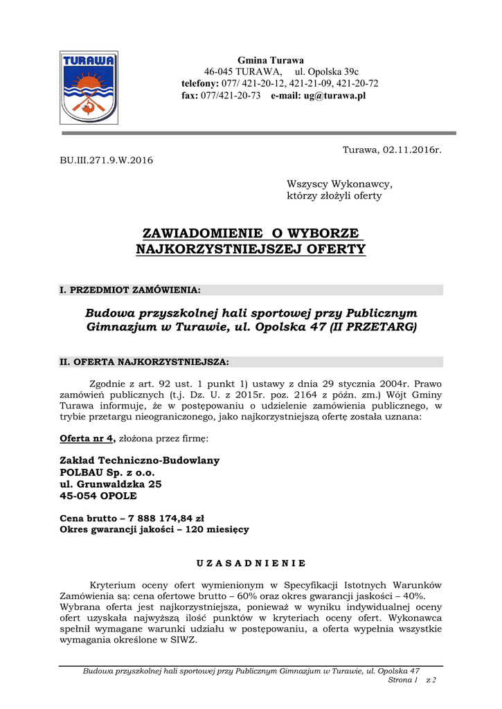 Gmina Turawa 46-045 TURAWA, ul. Opolska 39c telefony: 077/ 421-20-12, 421-21-09, 421-20-72 fax: 077/421-20-73 e-mail: [email protected] Turawa, 02.11.2016r. BU.III.271.9.W.2016 Wszyscy Wykonawcy, którzy złożyli oferty ZAWIADOMIENIE O WYBORZE NAJKORZYSTNIEJSZEJ OFERTY I. PRZEDMIOT ZAMÓWIENIA: Budowa przyszkolnej hali sportowej przy Publicznym Gimnazjum w Turawie, ul. Opolska 47 (II PRZETARG) II. OFERTA NAJKORZYSTNIEJSZA: Zgodnie z art. 92 ust. 1 punkt 1) ustawy z dnia 29 stycznia 2004r. Prawo zamówień publicznych (t.j. Dz. U. z 2015r. poz. 2164 z późn. zm.) Wójt Gminy Turawa informuję, że w postępowaniu o udzielenie zamówienia publicznego, w trybie przetargu nieograniczonego, jako najkorzystniejszą ofertę została uznana: Oferta nr 4, złożona przez firmę: Zakład Techniczno-Budowlany POLBAU Sp. z o.o. ul. Grunwaldzka 25 45-054 OPOLE Cena brutto – 7 888 174,84 zł Okres gwarancji jakości – 120 miesięcy UZASADNIENIE Kryterium oceny ofert wymienionym w Specyfikacji Istotnych Warunków Zamówienia są: cena ofertowe brutto – 60% oraz okres gwarancji jaskości – 40%. Wybrana oferta jest najkorzystniejsza, ponieważ w wyniku indywidualnej oceny ofert uzyskała najwyższą ilość punktów w kryteriach oceny ofert. Wykonawca spełnił wymagane warunki udziału w postępowaniu, a oferta wypełnia wszystkie wymagania określone w SIWZ. Budowa przyszkolnej hali sportowej przy Publicznym Gimnazjum w Turawie, ul. Opolska 47 Strona 1 z 2 Zawiadomienie o najkorzystniejszej ofercie BU.III.271.9.W.2016 III. STRESZCZENIE OCENY I PORÓWNANIA ZŁOŻONYCH OFERT Nr oferty 1. 2. 3. 4. 5. Firma (nazwa) lub nazwisko oraz adres wykonawcy Berger Bau Polska Sp. z o.o. ul. Szczecińska 11 54-517 WROCŁAW Konsorcjum firm Lider konsorcjum: Sport Track Sp. z o.o. Al. Tysiąclecia 2 59-700 BOLESŁAWIEC Partner konsorcjum: Saltex Europa Sp. z o.o. ul. Sudecka 106 a 53-129 WROCŁAW Przedsiębiorstwo Budowlane „DOMBUD” S.A. ul. Drzymały 15 40-059 KATOWICE Zakład Techniczno-Budowlany POLBAU Sp. z o.o. ul. Grunwaldzka 25 45-054 OPOLE ENERGOPOL TRADE OPOLE Spółka z o.o. ul. Gosławicka 2 45-446 OPOLE Liczba punktów w kryterium cena Liczba punktów w kryterium – okres gwarancji jakości RAZEM LICZBA PUNKTÓW 50,32 40,00 90,32 53,86 36,00 89,86 50,96 24,00 74,96 60,00 40,00 100,00 51,45 40,00 91,45 Rozdzielnik: 1. Berger Bau Polska Sp. z o.o., ul. Szczecińska 11, 54-517 WROCŁAW 2. Sport Track Sp. z o.o., Al. Tysiąclecia 2, 59-700 BOLESŁAWIEC 3. Przedsiębiorstwo Budowlane „DOMBUD” S.A., ul. Drzymały 15, 40-059 KATOWICE 4. Zakład Techniczno - Budowlany POLBAU Sp. z o.o., ul. Grunwaldzka 25, 45-054 OPOLE 5. ENERGOPOL TRADE OPOLE Spółka z o.o., ul. Gosławicka 2, 45-446 OPOLE 6. Strona internetowa Urzędu Gminy Turawa 7. Tablica ogłoszeń Urzędu Gminy Turawa 8. a/a – BU/A.K.-G. Zamieszczono na tablicy ogłoszeń w siedzibie Urzędu Gminy w Turawie od dnia ………... do dnia ……….. Budowa przyszkolnej hali sportowej przy Publicznym Gimnazjum w Turawie, ul. Opolska 47 Strona 2 z 2