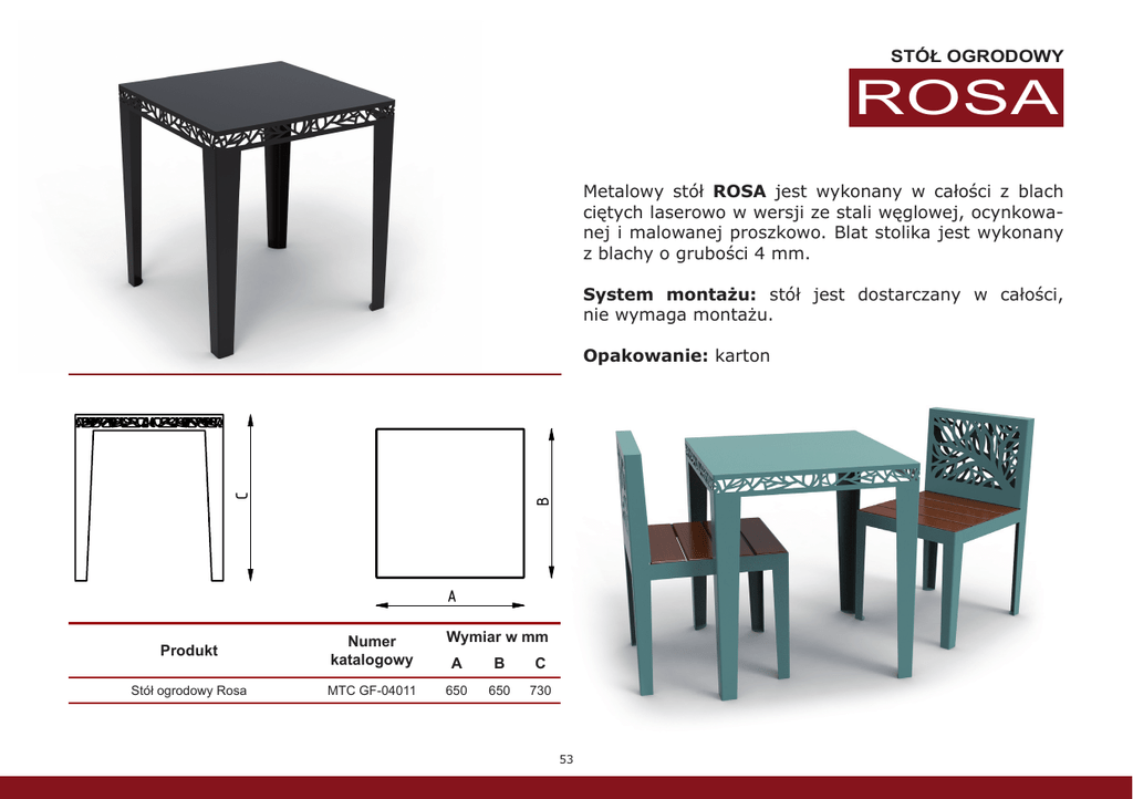 STÓŁ OGRODOWY ROSA Metalowy stół ROSA jest wykonany w całości z blach ciętych laserowo w wersji ze stali węglowej, ocynkowanej i malowanej proszkowo. Blat stolika jest wykonany z blachy o grubości 4 mm. System montażu: stół jest dostarczany w całości, nie wymaga montażu. Opakowanie: karton % & 6WyáRJURGRZ\526$ Produkt 6WyáRJURGRZ\NZDGUDWRZ\$UNDGLD & Stół ogrodowy Rosa Numer katalogowy Wymiar w mm A B C MTC GF-04011 650 650 730 53 % $