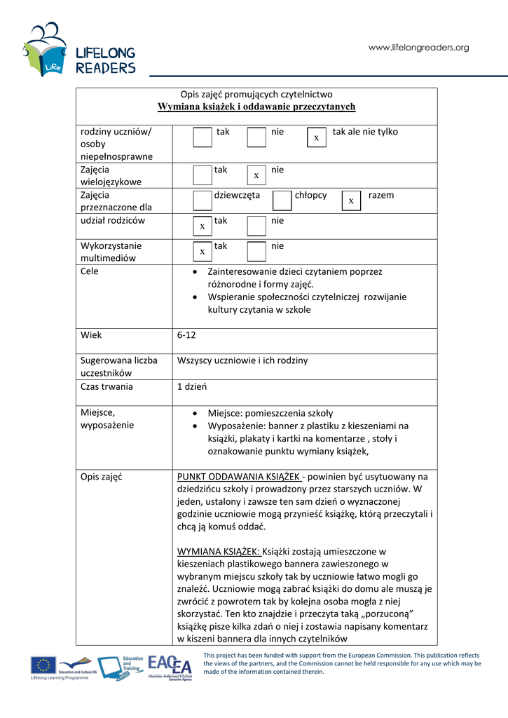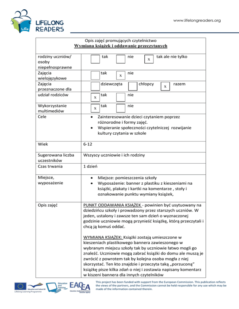 www.lifelongreaders.org Opis zajęć promujących czytelnictwo Wymiana książek i oddawanie przeczytanych rodziny uczniów/ osoby niepełnosprawne Zajęcia wielojęzykowe Zajęcia przeznaczone dla udział rodziców Wykorzystanie multimediów Cele tak tak nie x x chłopcy tak nie tak nie Wiek 6-12 Sugerowana liczba uczestników Czas trwania Wszyscy uczniowie i ich rodziny Opis zajęć x razem Zainteresowanie dzieci czytaniem poprzez różnorodne i formy zajęć. Wspieranie społeczności czytelniczej rozwijanie kultury czytania w szkole Miejsce, wyposażenie tak ale nie tylko nie dziewczęta x x 1 dzień Miejsce: pomieszczenia szkoły Wyposażenie: banner z plastiku z kieszeniami na książki, plakaty i kartki na komentarze , stoły i oznakowanie punktu wymiany książek, PUNKT ODDAWANIA KSIĄŻEK - powinien być usytuowany na dziedzińcu szkoły i prowadzony przez starszych uczniów. W jeden, ustalony i zawsze ten sam dzień o wyznaczonej godzinie uczniowie mogą przynieść książkę, którą przeczytali i chcą ją komuś oddać. WYMIANA KSIĄŻEK: Książki zostają umieszczone w kieszeniach plastikowego bannera zawieszonego w wybranym miejscu szkoły tak by uczniowie łatwo mogli go znaleźć. Uczniowie mogą zabrać książki do domu ale muszą je zwrócić z powrotem tak by kolejna osoba mogła z niej skorzystać. Ten kto znajdzie i przeczyta taką „porzuconą” książkę pisze kilka zdań o niej i zostawia napisany komentarz w kiszeni bannera dla innych czytelników This project has been funded with support from the European Commission. This publication reflects the views of the partners, and the Commission cannot be held responsible for any use which may be made of the information contained therein. www.lifelongreaders.org Uwagi dla prowadzącego zajęcia Formy kontynuacji zajęć Inspiracja Bibliografia Tego typu inicjatywy najlepiej są realizowane jeśli robią to sami uczniowie jednak szkoła powinna monitorować akcję w celu uniknięcia zostawiania przez uczniów agresywnych komentarzy lub zapobieżenia konfliktom między uczniami Komentarze o książkach mogą być sukcesywnie umieszczane on-line na stronie internetowej szkoły lub biblioteki Do akcji wymiany książek mogą przyłączyć się po pewnym czasie zarówno rodzice jak i nauczyciele Pomysł punktu oddawania przeczytanych książek oparty został na: www.literacytrust.org.uk; na studium przypadku opracowanym w szkole podstawowej Ambleside w Nottingham http://www.literacytrust.org.uk/assets/0000/7523/A mbleside_case_study_20092010.pd Punkt wymiany książek oparty na koncepcji z Lockwood (2008). National Literacy Trust Promoting Reading for Pleasure in the Primary School. London: Sage Publications. Źródło: Narodowa Korporacja Alfabetyzacji (www.literacytrust.org.uk), Lockwood, M. (2008). Promocja czytania dla przyjemności w szkołach podstawowych This project has been funded with support from the European Commission. This publication reflects the views of the partners, and the Commission cannot be held responsible for any use which may be made of the information contained therein.