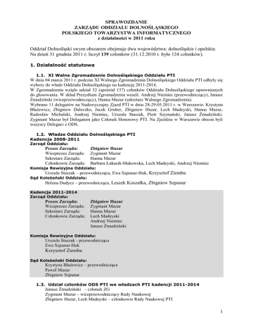 SPRAWOZDANIE ZARZĄDU ODDZIAŁU DOLNOŚLĄSKIEGO POLSKIEGO TOWARZYSTWA INFORMATYCZNEGO z działalności w 2011 roku Oddział Dolnośląski swym obszarem obejmuje dwa województwa: dolnośląskie i opolskie. Na dzień 31 grudnia 2011 r. liczył 139 członków (31.12.2010 r. było 124 członków). 1. Działalność statutowa 1.1. XI Walne Zgromadzenie Dolnośląskiego Oddziału PTI W dniu 04 marca 2011 r. podczas XI Walnego Zgromadzenia Dolnośląskiego Oddziału PTI odbyły się wybory do władz Oddziału Dolnośląskiego na kadencję 2011-2014. W Zgromadzeniu wzięło udział 32 (spośród 137) członków Oddziału Dolnośląskiego uprawnionych do głosowania. W skład Prezydium Zgromadzenia weszli: Andrzej Niemiec (przewodniczący), Janusz Żmudziński (wiceprzewodniczący), Hanna Mazur (sekretarz Walnego Zgromadzenia). Wybrano 11 delegatów na Nadzwyczajny Zjazd PTI w dniu 28-29.05.2011 r. w Warszawie: Krystyna Błażewicz, Zbigniew Daleczko, Jacek Gruber, Zbigniew Huzar, Lech Madeyski, Hanna Mazur, Radosław Michalski, Andrzej Niemiec, Urszula Staszak, Piotr Szymański, Janusz Żmudziński. Zygmunt Mazur był Delegatem jako Członek Honorowy PTI. Na Zjeździe w Warszawie obecni byli wszyscy Delegaci z ODS. 1.2. Władze Oddziału Dolnośląskiego PTI Kadencja 2008-2011 Zarząd Oddziału: Prezes Zarządu: Wiceprezes Zarządu: Sekretarz Zarządu: Członkowie Zarządu: Zbigniew Huzar Zygmunt Mazur Hanna Mazur Barbara Łukasik-Makowska, Lech Madeyski, Andrzej Niemiec Komisja Rewizyjna Oddziału: Urszula Staszak – przewodnicząca, Ewa Szpunar-Huk, Krzysztof Ziemba Sąd Koleżeński Oddziału: Helena Dudycz – przewodnicząca, Leszek Koszałka, Zbigniew Szpunar Kadencja 2011-2014 Zarząd Oddziału: Prezes Zarządu: Wiceprezes Zarządu: Sekretarz Zarządu: Członkowie Zarządu: Zbigniew Huzar Zygmunt Mazur Hanna Mazur Lech Madeyski Andrzej Niemiec Janusz Żmudziński Komisja Rewizyjna Oddziału: Urszula Staszak - przewodnicząca Ewa Szpunar-Huk Krzysztof Ziemba Sąd Koleżeński Oddziału: Krystyna Błażewicz – przewodnicząca Paweł Mazur Zbigniew Szpunar 1.3. Udział członków ODS PTI we władzach PTI kadencji 2011-2014 Janusz Żmudziński – członek ZG Zygmunt Mazur – wiceprzewodniczący Rady Naukowej Zbigniew Huzar, Lech Madeyski – członkowie Rady Naukowej PTI 1 1.4. Adres Oddziału Adres korespondencyjny Oddziału Dolnośląskiego (od kwietnia 2009 r.): ul. Tczewska 17, 51-429 Wrocław Adres e-mail: wroclaw (AT) pti.org.pl Telefon kontaktowy: 502 772 875 (Zygmunt Mazur). Strona WWW: www.pti.wroc.pl Konto bankowe (od lipca 2009 r.): BZWBK 4 Oddz. w Warszawie 88 1090 1056 0000 0001 1134 3209 Ze względu na oszczędności finansowe Oddział nie zatrudnia żadnej osoby do prowadzenia sekretariatu. Wszelkie prace związane z obsługą sekretariatu, finansowo-księgowe, korespondencyjne, członkowskie wykonuje Hanna Mazur. 1.5. Ewidencja członków Oddziału Dolnośląskiego PTI Oddział prowadzi ewidencję danych członków i płatności składek w postaci papierowej i w postaci elektronicznej (Excel). W 2011 roku przyjęto 31 członków, skreślono 14 członków i na dzień 31.12.2011 r. ODS liczył 139 członków (31.12.2010 – 122, 31.12.2009 – 100, 31.12.2008 – 86 członków). Obserwuje się więc stały przyrost liczby członków w Oddziale. Do 31.12.2011 r. składki w Oddziale za 2011 r. uregulowało 122 członków (121 wpłat + Członek Honorowy Zygmunt Mazur zwolniony z opłaty). Płatność składek w Oddział Dolnośląskim jest najwyższa w całym PTI – 88% w 2011 r. (w całym PTI płatność składek wynosi 38%). 1.6. Posiedzenia Zarządu Oddziału Dolnośląskiego PTI W 2011 roku odbyło się 7 posiedzeń Zarządu Oddziału Dolnośląskiego PTI: 03.01.2011, 11.02.2011, 04.03.2011, 13.05.2011, 29.06.2011, 14.10.2011, 09.12.2011 Wszystkie posiedzenia są protokołowane przez sekretarza Oddziału Hannę Mazur. Na wszystkich zebraniach było kworum. Zaproszenia na zebrania są kierowane do członków Zarządu ODS i KRO. Na zebraniach są obecni przedstawiciele Komisji Rewizyjnej Oddziału. W Oddziale są przechowywane protokoły, listy obecności, treści uchwał. 1.7. Strona WWW Oddziału Oddział prowadzi stronę www.pti.wroc.pl (redagowaną przez Pawła Mazura i Hannę Mazur), na której są zamieszczane bieżące informacje dla członków Oddziału oraz informacje o konkursie PTI na najlepsze prace magisterskie z informatyki (regulamin konkursu, ankiety dla zgłaszających prace, historia wszystkich edycji konkursu, statystyki). Na stronie jest lista członków Oddziału oraz lista rzeczoznawców. Od 2009 roku prowadzony jest dział poświecony historii informatyki dolnośląskiej i osobom zasłużonym dla rozwoju informatyki. 1.8. Ogólnopolski Konkurs PTI na najlepsze prace magisterskie z informatyki Sztandarową działalnością w Oddziale jest organizacja Ogólnopolskiego Konkursu PTI na najlepsze prace magisterskie z informatyki. W 2011 W 2011 roku przeprowadzono XXVIII edycję konkursu. Do konkursu zakwalifikowano 39 prac z 15 ośrodków w kraju (w 2010 – 44, 2009 – 49, 2008 – 54, 2007 – 39, 2006 – 27 prac). Każda praca była recenzowana nieodpłatnie przez co najmniej 2 niezależnych recenzentów. Nagrody dla laureatów ufundowało PTI. Uroczystość ogłoszenia wyników i wręczenia nagród XXVIII Konkursu z 2011 roku odbyła się 27.01.2012 roku we Wrocławiu. Na uroczystość przybył Prezes PTI prof. Marian Noga. Wszyscy laureaci XXVIII edycji konkursu zostali zaproszeni na konferencję Sejmik Młodych Informatyków (IX 2012 Międzyzdroje), gdzie mogą zaprezentować wyniki osiągnięte w swoich pracach magisterskich. Skład jury konkursu: Przewodniczący: prof. dr hab. Zygmunt Mazur Sekretarz: dr inż. Zbigniew Szpunar Członkowie: prof. dr hab. inż. Adam Grzech prof. dr hab. inż. Zbigniew Huzar 2 prof. dr hab. inż. Joanna Józefowska dr inż. Lech Madeyski prof. dr hab. inż. Jan Magott Komitet organizacyjny konkursu: Przewodnicząc