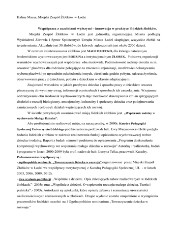 Halina Mazur, Miejski Zespół Żłobków w Łodzi Współpraca z uczelniami wyższymi – innowacja w praktyce łódzkich żłobków. Miejski Zespół Żłobków w Łodzi jest jednostką organizacyjną Miasta podległą Wydziałowi Zdrowia i Spraw Społecznych Urzędu Miasta Łodzi skupiającą wszystkie żłobki na terenie miasta. Aktualnie jest 30 żłobków, do których zgłoszonych jest około 2500 dzieci. W centrum zainteresowania żłobków jest MAŁE DZIECKO, dla którego naturalnym środowiskiem wychowawczym jest RODZINA a instytucjonalnym ŻŁOBEK. Podstawą organizacji warunków wychowawczych jest współpraca obu środowisk. Podmiotowość rodziny określa m.in. otwarcie” placówek dla rodziców polegające na zniesieniu rejonizacji, możliwości dokonywania wyboru placówki po uprzednim odwiedzeniu innych, określenia godzin pobytu, zakresu żywienia, obserwowania pracy z dzieckiem, pobytu z dzieckiem w okresie adaptacyjnym. Znajomość warunków w jakich przebywa dziecko i sposobu pracy z dzieckiem stwarza płaszczyznę do wymiany uwag, informacji o potrzebach i sposobach ich zaspokajania. Wzajemne oddziaływanie obu środowisk wychowawczych daje możliwość dokonywania zmian sprzyjających dbałości o rozwój biologiczny, emocjonalny, kulturalny i społeczny dziecka oraz podejmowania zamierzonych i celowych działań wspierających ich rozwój. W świetle powyższych uwarunkowań misją łódzkich żłobków jest „Wspieranie rodziny w wychowaniu Małego Dziecka”. Aby profesjonalnie realizować misję, na naszą prośbę, w 2000r. Katedra Pedagogiki Społecznej Uniwersytetu Łódzkiego pod kierunkiem prof.zw.dr hab. Ewy Marynowicz- Hetki podjęła badania łódzkich żłobków w zakresie realizowania funkcji opiekuńczo-wychowawczej wobec dziecka i rodziny. Raport z badań stanowił podstawę do opracowania „Programu doskonalenia kompetencji wychowawcy we wspieraniu małego dziecka w rozwoju” Autorką i realizatorką badań i programu w latach 2000-2009 była prof. nadzw.dr hab. Lucyna Telka, pracownik Katedry. Podsumowaniem współpracy są : - ogólnopolskie seminaria „Towarzyszenie Dziecku w rozwoju” organizowane przez Miejski Zespół Żłobków w Łodzi we współpracy merytorycznej z Katedrą Pedagogiki Społecznej UŁ - w latach 2003, 2006, 2009, 2012r. - dwa wydania publikacji „Wspólnie z dziećmi. Opis dziecięcych zabaw realizowanych w łódzkich żłobkach.”- 2003r. oraz „Wspólnie z dziećmi. O wspieraniu rozwoju małego dziecka. Teoria i praktyka”.- 2005r. Autorkami są opiekunki, które opisały zabawy i scenariusze uroczystości okolicznościowych realizowanych w żłobkach. Drugie wydanie zostało uzupełnione o wystąpienia pracowników łódzkich uczelni na I Ogólnopolskim seminarium „Towarzyszenie dziecku w rozwoju.” - wypracowanie i wdrożenie od IX 2009r. standardu pracy z małym dzieckiem w łódzkich żłobkach, projektu pedagogicznego - „Towarzyszenie dziecku i jego rodzinie w żłobku nr. . . ” Projekt orientuje działania wychowawcze pracowników w odniesieniu do koncepcji „Towarzyszenie dziecku w rozwoju”. Pozwala pracownikom przemyśleć koncepcję działania, zdobywać wiedzę, obserwować własną praktykę, podjąć nad nią refleksję i dokonywać w niej zmian. - rozprawa habilitacyjna prof. nadzw. dr hab. Lucyny Telki „Przekształcanie przestrzeni społecznej placówki. Studium społeczno-pedagogiczne na przykładzie żłobków”- 2007r. Praca ta stanowi m.in. podstawę naukową do kształcenia pedagogów do pracy z małym dzieckiem i jest jednocześnie „zapisem” zmian jakie dokonywały się w myśleniu i działaniu pracowników łódzkich żłobków w czasie pracy nad projektem pedagogicznym placówki. - prace magisterskie napisane przez 10 studentów w ramach seminarium prowadzonego przez prof. Lucynę Telkę w roku akademickim 2011/2012 dotyczące znaczenia koncepcji towarzyszenia w rozwoju i projektu pedagogicznego w działaniach wychowawczych żłobka. Równolegle w roku 2008 i 2010 we współpracy z Instytutem Psychologii Uniwersytetu Łódzkiego kierowanym przez prof. dr hab. Eleonorę Bielawską-Batorowicz, pracownicy Zakładu Psychologii Rodziny i Rozwoju Człowieka dr Sylwia Rydz i dr Ewa Marat zrealizowały warsztaty dla pracowników żłobków w ramach „Projektu doskonalenia kompetencji zawodowych pracowników łódzkich żłobków w zakresie umiejętności, zasobów interpersonalnych i osobistych w pracy z małym dzieckiem”. Powstała też broszura zawierająca materiały dotyczące rozwoju małego dziecka i zasad postępowania „Mały ciekawy świata człowiek” przygotowana przez adiunktów prowadzących warsztaty. Projekt ten był uzupełnieniem programu realizowanego przez Katedrę Pedagogiki Społecznej UŁ. W roku 2012-–została rozpoczęta z Zakładem Żywienia i Epidemiologii Uniwersytetu Medycznego w Łodzi merytoryczna współpraca w zakresie wypracowania standardów i norm żywienia dzieci w łódzkich żłobkach. Na co dzień studenci łódzkich uczelni odbywają praktyki zawodowe na terenie żłobków. Współpraca przynosi obu stronom wymierne korzyści. Naukowcom przekonanie, że wiedza teoretyczna służy w praktyce człowiekowi, zaś praktykom pomaga zrozumieć swoje działania i znaleźć dla nich uzasadnienie. Pracownikom uczelni pozwala zrozumieć szczegóły codzienności, praktykom przyjąć postawę obserwatora swoich działań w świetle wiedzy. Mając na uwadze fakt, że działalność Człowieka, w samej istocie, ma służyć drugiemu Człowiekowi, żywię nadzieję, że możemy być skromnym przykładem na sposób, w jaki wspólnie podejmowane wysiłki nad doskonaleniem siebie wspierają w rozwoju najważniejszego Człowieka – MAŁE DZIECKO.