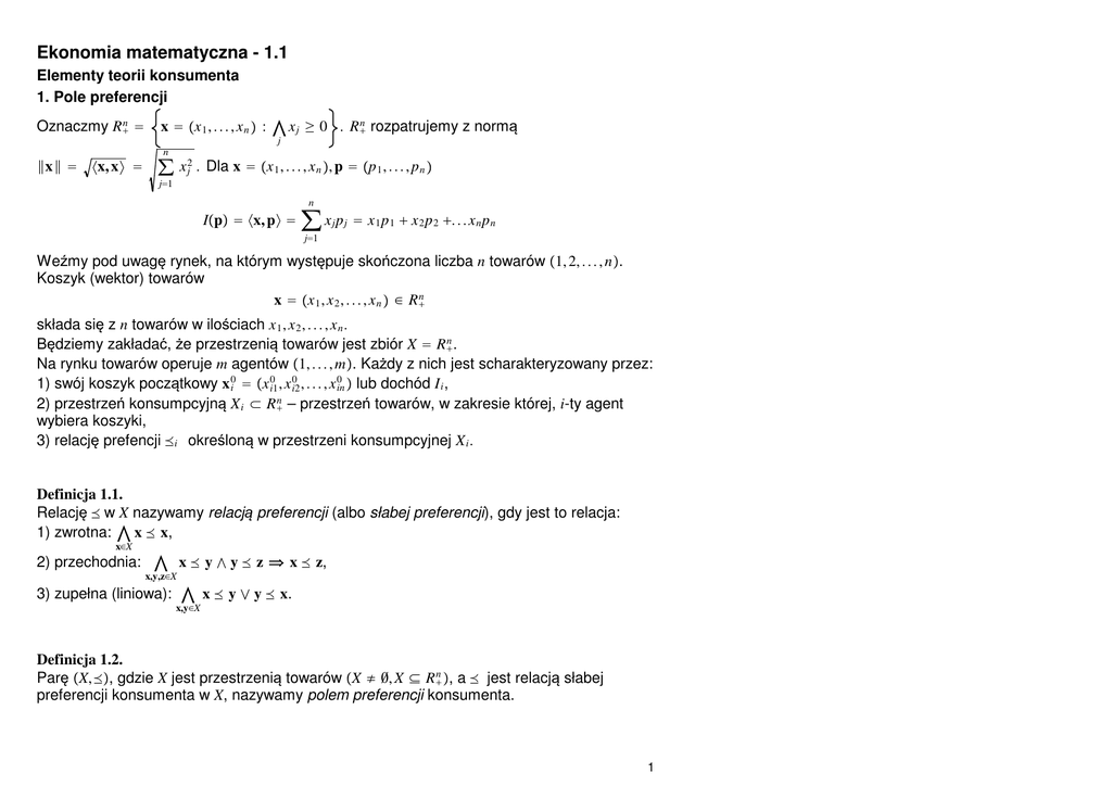 Ekonomia matematyczna - 1.1 Elementy teorii konsumenta 1. Pole preferencji Oznaczmy R n+ = x = x 1 , . . . , x n : ⋀ x j ≥ 0 . R n+ rozpatrujemy z normą j ‖x‖ = 〈x, x〉 = n ∑ x 2j . Dla x = x 1 , . . . , x n , p = p 1 , . . . , p n j=1 n Ip = 〈x, p〉 = ∑ x j p j = x 1 p 1 + x 2 p 2 +. . . x n p n j=1 Weźmy pod uwagę rynek, na którym występuje skończona liczba n towarów 1, 2, . . . , n. Koszyk (wektor) towarów x = x 1 , x 2 , . . . , x n ∈ R n+ składa się z n towarów w ilościach x 1 , x 2 , . . . , x n . Będziemy zakładać, że przestrzenią towarów jest zbiór X = R n+ . Na rynku towarów operuje m agentów 1, . . . , m. Każdy z nich jest scharakteryzowany przez: 1) swój koszyk początkowy x 0i = x 0i1 , x 0i2 , . . . , x 0in lub dochód I i , 2) przestrzeń konsumpcyjną X i ⊂ R n+ – przestrzeń towarów, w zakresie której, i-ty agent wybiera koszyki, 3) relację prefencji i określoną w przestrzeni konsumpcyjnej X i . Definicja 1.1. Relację w X nazywamy relacją preferencji (albo słabej preferencji), gdy jest to relacja: 1) zwrotna: ⋀ x x, x∈X 2) przechodnia: ⋀ x y ∧ y z x z, x,y,z∈X 3) zupełna (liniowa): ⋀ x y ∨ y x. x,y∈X Definicja 1.2. Parę X, , gdzie X jest przestrzenią towarów X ≠ ∅, X ⊆ R n+ , a jest relacją słabej preferencji konsumenta w X, nazywamy polem preferencji konsumenta. 1 Definicja 1.3. 1) Jeżeli jest relacją słabej preferencji, to relacja ≃ zdefiniowana: x ≃ y ⇔ x y∧y x jest relacją równoważności (jest zwrotna, przechodnia oraz symetryczna, tzn. ⋀ x ≃ y ⇒ x,y∈X y ≃ x). 2) Jeżeli jest relacją słabej preferencji, to relacja ≺ zdefiniowana: x ≺ y ⇔ x y ∧∼y x lub równoważnie x ≺ y ⇔ x y ∧∼x ≃ y jest relacją silnej preferencji. Definicja 1.4. Obszarami obojętności w przestrzeni towarów X nazywamy klasy abstrakcji relacji ≃, tj. zbiory: K x = y ∈ X : y ≃ x, x ∈ X. Definicja 1.5. Relację nazywamy ciągłą w X, jeśli zbiór x, y : x y jest zbiorem domkniętym w X × X. Równoważnie: x, y : y ≺ x jest zbiorem otwartym w X × X. Twierdzenie 1.1. Następujace warunki są równoważne: 1) relacja preferencji w zbiorze X ⊆ R n+ jest ciągła, 2) dla dowolnych a, b ∈ X zbiory G + a = x ∈ X : a ≺ x, G − b = x ∈ X : x ≺ b są otwarte, 3) dla dowolnych a, b ∈ X zbiory F − a = x ∈ X : x a, F + b = x ∈ X : b x są domknięte. Dowód: (ćwiczenie) Definicja 1.6. Niech para tworzy pole preferencji i niech zbiór B ≠ ∅, B ⊆ X. X, Element x ∈B taki, że y x,dla każdego y ∈ B, oznaczymy x = arg max B i nazwiemy B-preferowanym. Oznaczmy też Argmax B = x ∈B : ⋀y x . y∈B 2. Funkcja użyteczności 2 Definicja 2.1. Określoną na przestrzeni towarów funkcję u : X → R nazywamy funkcją użyteczności zgodną z relacją preferencji , jeżeli dla dowolnych x, y ∈ X zachodzi: ux ≤ uy ⇔ x y, Twierdzenie 2.1. Jeżeli u : X → R jest funkcją użyteczności zgodną z relacją , to ux = uy wtedy i tylko wtedy, gdy x ≃ y. Twierdzenie 2.2. Jeśli u : X → R jest funkcją użyteczności zgodną z relacją i g : R → R jest funkcją ściśle rosnącą, to g ∘ u też jest funkcją użyteczności zgodną z relacją . Twierdzenie 2.3. Gdy relacja preferencji zdefiniowana jest przez funkcję użyteczności u : X → R, tzn. def x y ⇔ ux ≤ uy, przy czym u jest funkcją ciągłą, to relacja jest ciągła. O ile powyższe twierdzenie jest dość oczywiste, to poniższe twierdzenie Debreu jest nietrywialne. Twierdzenie 2.4.(Debreu) Jeśli jest relacją preferencji na X i jest ciągła, to istnieje ciągła funkcja użyteczności u : X → R taka, że ux ≤ uy wtedy i tylko wtedy, gdy x y. Dowód: (ćwiczenie) Definicja 2.2. Mówimy, że w polu preferencji zachodzi X, (inaczej: relacja preferencji jest rosnąca względem ≤ ), gdy: zjawisko niedosytu ⋀ x ≤ y ∧ x ≠ y ⇒ x ≺ y. x,y∈X 3. Maksymalizacja użyteczności Twierdzenie 3.1.(Weierstrasse’a) 3 Niech B będzie zwartym, niepustym podzbiorem R n+ i na R n+ dana niech będzie ciągła relacja preferencji .Wówczas zbiór najlepszych w B względem koszyków jest niepusty i zwarty. Twierdzenie 3.2. Niech B będzie wypukłym podzbiorem R n+ . 1) Jeżeli relacja preferencji jest wypukła, tzn. dla dowolnego x zbiór F + x = y : x y jest wypukły, to zbiór Argmax B jest wypukły. 2) Jeśli relacja preferencji jest ściśle wypukła, tzn. dla dowolnego x zbiór F + x = y : x y jest ściśle wypukły, czyli ⋀ ⋀ x ≺ λv + 1 − λz , v,z∈F + x λ∈0,1 to zbiór Argmax B jest zbiorem co najwyżej jednopunktowym. Uwaga 3.1. Jeśli x y ⇔ux ≤ uy , gdzie u : X → R jest funkcją: 1) quasi-wklęsłą, tzn. ⋀ ⋀ uλx +1 − λy ≥ minux, uy, x,y λ∈0,1 to relacja jest wypukła. 2) ściśle quasi-wklęsłą, tzn. ⋀ ⋀ uλx +1 − λy > minux, uy, x,y λ∈0,1 to relacja jest ściśle wypukła. Każda funkcja wklęsła jest quasi-wklęsła. Każda funkcja ściśle wklęsła jest ściśle quasi-wklęsła. Wniosek 3.1. Jeśli B jest ograniczonym, domkniętym, wypukłym podzbiorem w R n+ , a funkcja użyteczności u : R n+ → R jest ciągła i ściśle quasi-wklęsła (relacja preferencji jest ciągła i ściśle wypukła), to istnieje dokładnie jeden x ∈ B taki, że ux ≤ ux, dla każdego x ∈ B. Weźmy pod uwagę opisaną wcześniej przestrzeń towarów X oraz operujących na rynku 4 agentów (konsumentów). Agent dysponujący dochodem I scharakteryzowany jest przez funkcję użyteczności u : X → R, która jest związana z jego preferencją , tzn. x y ⇔ux ≤ uy. Agent zgłasza popyt indywidualny Dp = x ∈ Bp, I : ⋀ xx , x∈Bp,I gdzie zbiór Bp, I = x ∈X : 〈x, p〉 ≤ I nazywamy jego zbiorem budżetowym. Gdy dochód agenta pochodzi wyłącznie z wartości jego koszyka towarów - czyli zależy od cen p, to I = Ip = 〈x 0 , p〉, a wtedy B x0 p = Bp, Ip = x ∈X : 〈x − x 0 , p〉 ≤ 0. Inaczej mówiąc: agent rozwiązuje