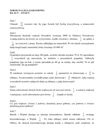 SZKOLNA LIGA ZADANIOWA KLAS V – ETAP 5 Zad.1 Ułamek 15 rozszerz tak, by jego licznik był liczbą trzycyfrową, a mianownik 16 czterocyfrową. Zad.2. Miesięczne dochody rodziny Nowaków wynoszą 3800 zł. Państwo Nowakowie 1 wydają połowę tej kwoty na wyżywienie, środki czystości i ubranie, na opłaty a 5 1 na rozrywki i prasę. Resztę odkładają na samochód. Po ilu latach oszczędzania 20 będą mogli kupić samochód, który kosztuje 38 000 zł? Zad3. Gospodyni przyniosła na targ 100 jajek, za które chciała uzyskać 70 zł. Po sprzedaniu 1 wszystkich jaj zauważyła, że niektóre z pozostałych popękały. Odłożyła 5 popękane jaja na bok, a resztę sprzedała po 80 gr za sztukę, aby zarobić 70 zł, jak zamierzała. Ile jaj popękało? Zad.4. W autobusie wiozącym uczniów ze szkoły 1 4 pasażerów to dziewczęta, a to 5 5 4 chłopcy. Na przystanku wysiadła piąta część dziewcząt i chłopców. Jaką częścią 5 wszystkich uczniów jadących dalej są chłopcy, a jaką dziewczęta? Zad.5. Suma odwrotności dwóch liczb większych od zera jest równa 1 a rożnica większej 2 i mniejszej z tych odwrotności jest równa 1 . Znajdź te liczby. 6 Zad.6. Co jest większe: ćwierć z połowy dzielonej przez półtora, czy połowa z ćwierci dzielonej przez półtora? Zad.7. Bartek i Wojtek dostają co miesiąc kieszonkowe. Bartek odkłada kieszonkowego, a Wojtek 1 swojego 5 1 . Po roku chłopcy mieli razem odłożone 156 zł. 8 Oblicz, ile złotych kieszonkowego dostaje każdy z chłopców, jeśli wiadomo, że dostają po tyle samo. Zad.8. Księgozbiór Janka liczy 56 książek. Wśród nich znajduje się 19 książek historycznych i 24 powieści fantastyczne, a resztę stanowią powieści przygodowe. Jutro na imieniny Janek dostanie trzy książki przygodowe. Jaką część wszystkich książek będą wówczas stanowić książki przygodowe? Zad.9. Piotrek zapisał ułamek niewłaściwy, w którym suma licznika i mianownika jest równa 19. Gdyby licznik tego ułamka zwiększył o 1, a mianownik zmniejszył o 2, to otrzymałby ułamek równy 2. Jaki ułamek zapisał Piotrek? Zad.10. Do sklepu przywieziono 240 m materiału. Pierwszego dnia sprzedano zapasu, drugiego dnia 3 reszty. Ile metrów materiału pozostało w sklepie? 4 2 całego 5