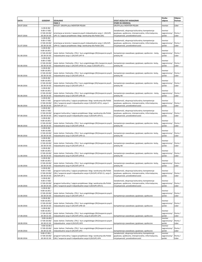 DATA GODZINY 29.07.2016 30.07.2016 31.07.2016 01.08.2016 02.08.2016 03.08.2016 04.08.2016 05.08.2016 06.08.2016 07.08.2016 08.08.2016 09.08.2016 10.08.2016 11.08.2016 12.08.2016 13.08.2016 14.08.2016 15.08.2016 16.08.2016 17.08.2016 18.08.2016 19.08.2016 20.08.2016 6.30-8.30/ 9.00-17.00/ 17.00-20.00/ 20.30-24.30 6.30-8.30/ 9.00-17.00/ 17.00-20.00/ 20.30-24.30 6.30-8.30/ 9.00-16.00 / 17.00-20.00/ 20.30-24.30 6.30-8.30/ 9.00-17.00/ 17.00-20.00/ 20.30-24.30 6.30-8.30/ 9.00-16.00 / 17.00-20.00/ 20.30-24.30 6.30-8.30/ 9.00-16.00 / 17.00-20.00/ 20.30-24.30 6.30-8.30/ 9.00-16.00 / 17.00-20.00/ 20.30-24.30 6.30-8.30/ 9.00-17.00/ 17.00-20.00/ 20.30-24.30 6.30-8.30/ 9.00-17.00/ 17.00-20.00/ 20.30-24.30 6.30-8.30/ 9.00-16.00 / 17.00-20.00/ 20.30-24.30 6.30-8.30/ 9.00-16.00/ 17.00-20.00/ 20.30-24.30 6.30-8.30/ 9.00-16.00/ 17.00-20.00/ 20.30-24.30 6.30-8.30/ 9.00-16.00 / 17.00-20.00/ 20.30-24.30 6.30-8.30/ 9.00-16.00 / 17.00-20.00/ 20.30-24.30 6.30-8.30/ 9.00-17.00/ 17.00-20.00/ 20.30-24.30 6.30-8.30/ 9.00-17.00/ 17.00-20.00/ 20.30-24.30 6.30-8.30/ 9.00-16.00 / 17.00-20.00/ 20.30-24.30 6.30-8.30/ 9.00-16.00 / 17.00-20.00/ 20.30-24.30 6.30-8.30/ 9.00-16.00 / 17.00-20.00/ 20.30-22.30 9.00-16.00 / 17.00-20.00/ 20.30-22.30 9.00-16.00 / 17.00-20.00/ 20.30-22.30 9.00-17.00 / 17.00-20.00/ 20.30-22.30 Osoba odpow Odpow Partner mentor Lider DZIAŁANIE FAZA 3 WYLOT: GRUPA plus MENTOR POLSKI EFEKT-REZULTAT-WSKAZNIKI STAŻE ZA GRANICĄ GRUPA plus MENTOR POLSKI orientacja w terenie / wsparcie psych indywidualne sesja 1 (2h/UP) UP1-3 / zajęcia projektowe: blog i workcamp dla Polski (3h) świadomość, ekspresja kulturalna; kompetencje językowe, społeczne, interpersnalne, informatyczne, inicjatywność, przedsiebiorczość mentor zagraniczny/ Porto / polski Lider orientacja w terenie / wsparcie psych indywidualne sesja 1 (2h/UP) UP4-6 / zajęcia projektowe: blog i workcamp dla Polski (3h) świadomość, ekspresja kulturalna; kompetencje językowe, społeczne, interpersnalne, informatyczne, inicjatywność, przedsiebiorczość mentor zagraniczny/ Porto / polski Lider staże: kelner / kelnerka (7h) / kurs angielskiego (3h)/wsparcie psych kompetencje zawodowe; językowe; społeczne - testy, indywidualne sesja 1 (2h/UP) UP7-9 ankiety KK mentor zagraniczny/ Porto / polski Lider staże: kelner / kelnerka (7h) / kurs angielskiego (3h) /wsparcie psych kompetencje zawodowe; językowe; społeczne- testy, indywidualne sesja 1 (2h/UP) UP10-11; sesja 2 (2h/UP) UP 1 ankiety KK mentor zagraniczny/ Porto / polski Lider staże: kelner / kelnerka (7h) / kurs angielskiego (3h)/wsparcie psych kompetencje zawodowe; językowe; społeczne- testy, indywidualne sesja 2 (2h/UP) UP2-4 ankiety KK mentor zagraniczny/ Porto / polski Lider staże: kelner / kelnerka (7h) / kurs angielskiego (3h)/wsparcie psych indywidualne sesja 2 (2h/UP) UP5-7 kompetencje zawodowe; językowe; społeczne- testy, ankiety KK mentor zagraniczny/ Porto / polski Lider staże: kelner / kelnerka (7h) / kurs angielskiego (3h)/wsparcie psych kompetencje zawodowe; językowe; społeczne - testy, indywidualne sesja 2 (2h/UP) UP8-10 ankiety KK mentor zagraniczny/ Porto / polski Lider program kulturalny / zajęcia projektowe: blog i workcamp dla Polski (3h) / wsparcie psych indywidualne sesja 2 (2h/UP) UP11; sesja 3 (2h/UP) UP 1-2 świadomość, ekspresja kulturalna; kompetencje językowe, społeczne, interpersnalne, informatyczne, inicjatywność, przedsiebiorczość mentor zagraniczny/ Porto / polski Lider program kulturalny / zajęcia projektowe: blog i workcamp dla Polski (3h) / wsparcie psych indywidualne sesja 3 (2h/UP) UP3-5; świadomość, ekspresja kulturalna; kompetencje językowe, społeczne, interpersnalne, informatyczne, inicjatywność, przedsiebiorczość mentor zagraniczny/ Porto / polski Lider staże: kelner / kelnerka (7h) / kurs angielskiego (3h)/wsparcie psych kompetencje zawodowe; językowe; społeczne- testy, indywidualne sesja 3 (2h/UP) UP6-8 ankiety KK mentor zagraniczny/ Porto / polski Lider staże: kelner / kelnerka (7h) / kurs angielskiego (3h)/wsparcie psych kompetencje zawodowe; językowe; społeczne- testy, indywidualne sesja 3 (2h/UP) UP9-11 ankiety KK mentor zagraniczny/ Porto / polski Lider staże: kelner / kelnerka (7h) / kurs angielskiego (3h)/wsparcie psych kompetencje zawodowe; językowe; społeczne- testy, indywidualne sesja 4 (2h/UP) UP1-3 ankiety KK mentor zagraniczny/ Porto / polski Lider staże: kelner / kelnerka (7h) / kurs angielskiego (3h)/wsparcie psych kompetencje zawodowe; językowe; społeczne- testy, indywidualne sesja 4 (2h/UP) UP4-6 ankiety KK mentor zagraniczny/ Porto / polski Lider staże: kelner / kelnerka (7h) / kurs angielskiego (3h)/wsparcie psych kompetencje zawodowe; językowe; społeczne- testy, indywidualne sesja 4 (2h/UP) UP7-9 ankiety KK mentor zagraniczny/ Porto / polski Lider program kulturalny / zajęcia projektowe: blog i workcamp dla Polski (3h) / wsparcie psych indywidualne sesja 4 (2h/UP) UP10-11; sesja 5 (2h/UP) UP 1 świadomość, ekspresja kulturalna; kompetencje językowe, społeczne, interpersnalne, informatyczne, inicjatywność, przedsiebiorczość mentor zagraniczny/ Porto / polski Lider program kulturalny / zajęcia projektowe: blog i workcamp dla Polski (3h) / wsparcie psych indywidualne sesja 5 (2h/UP) UP2-4; świadomość, ekspresja kulturalna; kompetencje językowe, społeczne, interpersnalne, informatyczne, inicjatywność, przedsiebiorczość mentor zagraniczny/ Porto / polski Lider staże: kelner / kelnerka (7h) / kurs angielskiego (3h)/wsparcie psych indywidualne sesja 5 (2h/UP) UP5-7 kompetencje zawodowe; językowe; społeczne mentor zagraniczny/ Porto / polski Lider staże: kelner / kelnerka (7h) / kurs angielskiego (3h)/wsparcie psych indywidualne sesja 5 (2h/UP) UP8-10 kompetencje zawodowe; językowe; społeczne mentor zagraniczny/ Porto / polski Lider staże: kelner / kelnerka (7h) / kurs angielskiego (3h)/wsparcie psych indywidualne sesja 5 (2h/UP) UP11; sesja 6 (2h/UP) UP1 kompete
