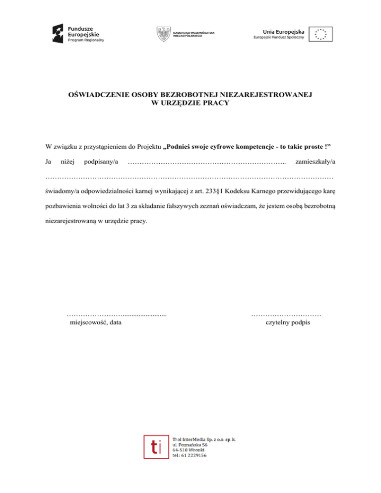 OŚWIADCZENIE OSOBY BEZROBOTNEJ NIEZAREJESTROWANEJ W URZĘDZIE PRACY W związku z przystąpieniem do Projektu „Podnieś swoje cyfrowe kompetencje - to takie proste !” Ja niżej podpisany/a ………………………………………………………….. zamieszkały/a …………………………………………………………………………………………………………… świadomy/a odpowiedzialności karnej wynikającej z art. 233§1 Kodeksu Karnego przewidującego karę pozbawienia wolności do lat 3 za składanie fałszywych zeznań oświadczam, że jestem osobą bezrobotną niezarejestrowaną w urzędzie pracy. ……………………......................... miejscowość, data ………………………… czytelny podpis