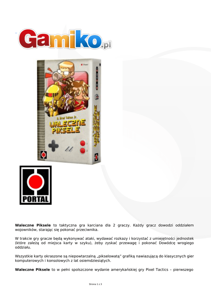Waleczne Piksele to taktyczna gra karciana dla 2 graczy. Każdy gracz dowodzi oddziałem wojowników, starając się pokonać przeciwnika. W trakcie gry gracze będą wykonywać ataki, wydawać rozkazy i korzystać z umiejętności jednostek (które zależą od miejsca karty w szyku), żeby zyskać przewagę i pokonać Dowódcę wrogiego oddziału. Wszystkie karty okraszone są niepowtarzalną „pikselowatą” grafiką nawiazującą do klasycznych gier komputerowych i konsolowych z lat osiemdziesiątych. Waleczne Piksele to w pełni spolszczone wydanie amerykańskiej gry Pixel Tactics – pierwszego Strona 1 z 3 tytułu z niezwykle popularnej serii, aktualnie liczącej trzy niezależne od siebie pozycje. Zawartość pudełka: dwie Talie Oddziałów po 25 kart karty bieżącej fali dla dwóch graczy 42 żetony obrażeń 10 żetonów siły instrukcja Wiek od 10 lat Liczba graczy 2 Czas gry 45 minut Instrukcja polska Wydanie polskie Producent Portal Games Projektant Strona 2 z 3 D. Brad Talton, Jr. Ilustrator Fabio Fontes Strona 3 z 3