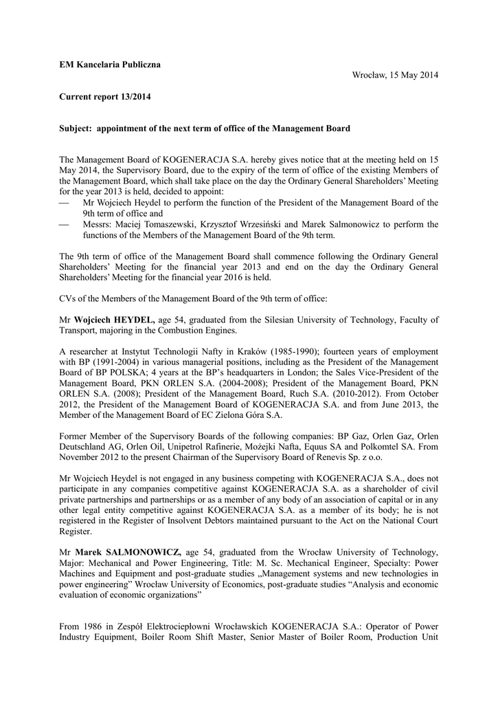 EM Kancelaria Publiczna Wrocław, 15 May 2014 Current report 13/2014 Subject: appointment of the next term of office of the Management Board The Management Board of KOGENERACJA S.A. hereby gives notice that at the meeting held on 15 May 2014, the Supervisory Board, due to the expiry of the term of office of the existing Members of the Management Board, which shall take place on the day the Ordinary General Shareholders’ Meeting for the year 2013 is held, decided to appoint: Mr Wojciech Heydel to perform the function of the President of the Management Board of the 9th term of office and Messrs: Maciej Tomaszewski, Krzysztof Wrzesiński and Marek Salmonowicz to perform the functions of the Members of the Management Board of the 9th term. The 9th term of office of the Management Board shall commence following the Ordinary General Shareholders’ Meeting for the financial year 2013 and end on the day the Ordinary General Shareholders’ Meeting for the financial year 2016 is held. CVs of the Members of the Management Board of the 9th term of office: Mr Wojciech HEYDEL, age 54, graduated from the Silesian University of Technology, Faculty of Transport, majoring in the Combustion Engines. A researcher at Instytut Technologii Nafty in Kraków (1985-1990); fourteen years of employment with BP (1991-2004) in various managerial positions, including as the President of the Management Board of BP POLSKA; 4 years at the BP’s headquarters in London; the Sales Vice-President of the Management Board, PKN ORLEN S.A. (2004-2008); President of the Management Board, PKN ORLEN S.A. (2008); President of the Management Board, Ruch S.A. (2010-2012). From October 2012, the President of the Management Board of KOGENERACJA S.A. and from June 2013, the Member of the Management Board of EC Zielona Góra S.A. Former Member of the Supervisory Boards of the following companies: BP Gaz, Orlen Gaz, Orlen Deutschland AG, Orlen Oil, Unipetrol Rafinerie, Możejki Nafta, Equus SA and Polkomtel SA. From November 2012 to the present Chairman of the Supervisory Board of Renevis Sp. z o.o. Mr Wojciech Heydel is not engaged in any business competing with KOGENERACJA S.A., does not participate in any companies competitive against KOGENERACJA S.A. as a shareholder of civil private partnerships and partnerships or as a member of any body of an association of capital or in any other legal entity competitive against KOGENERACJA S.A. as a member of its body; he is not registered in the Register of Insolvent Debtors maintained pursuant to the Act on the National Court Register. Mr Marek SALMONOWICZ, age 54, graduated from the Wrocław University of Technology, Major: Mechanical and Power Engineering, Title: M. Sc. Mechanical Engineer, Specialty: Power Machines and Equipment and post-graduate studies „Management systems and new technologies in power engineering” Wrocław University of Economics, post-graduate studies “Analysis and economic evaluation of economic organizations” From 1986 in Zespół Elektrociepłowni Wrocławskich KOGENERACJA S.A.: Operator of Power Industry Equipment, Boiler Room Shift Master, Senior Master of Boiler Room, Production Unit Manager in EC Czechnica, (1996-2002); Manager of Production Engineering (EC Wrocław and EC Czechnica) (2002-2005); Deputy Director of Production (2005-2008); Deputy Director of Industrial Development for EC Czechnica Infrastructure (2008-2010); Chief Engineer of EC Czechnica (20102012); from 2013 Technical Director. Former Member of the Supervisory Boards of the following companies: PPO Siechnice Sp. z o.o., KOGENERACJA S.A. (member and later Vice-President) and Diagpom Sp. z o.o. From 24 September 2013 Member of the Management Board of KOGENERACJA S.A. Mr Marek Salmonowicz is not engaged in any business competing with KOGENERACJA S.A., does not participate in any companies competitive against KOGENERACJA S.A. as a shareholder of civil private partnerships and partnerships or as a member of any body of an association of capital or in any other legal entity competitive against KOGENERACJA S.A. as a member of its body; he is not registered in the Register of Insolvent Debtors maintained pursuant to the Act on the National Court Register. Mr Maciej TOMASZEWSKI, age 42, MSc in Economics, graduated from the Academy of Economics in Wrocław (1996), postgraduate studies: management of Industrial Systems - Polish Studies - the Wrocław Technical University-"Ecole Nationale Superieure des Mines de Saint Etienne" (2002-2003). Since graduation Mr Maciej Tomaszewski has been working for Heat and Power Plant "Zielona Góra" S.A., originally, in the area of finance. In 1997 he participated in the preparation and implementation of controlling in the plant in Zielona Góra and in 2004 he became the Head of the Budget and Controlling Department. In 2009 he assumed the function of the assistant manager for trade and quality and the following year he was promoted to trade and quality manager. In 2006-2009, he served as the chairman of the Supervisory Board for the Repair Company in the Plant "ECeRemont Sp. z o.o. Highly involved in the development of cogeneration, acting, inter alia, for the Polish society of the CHP. He took part in the legislative works on the law dissolving longterm contracts in 2008. Mr Maciej Tomaszewski was and is at the forefront of many projects carried out within the framework of the EDF Group. Mr Maciej Tomaszewski sitting on the Board of Directors of KOGENERACJA S.A. will continue to be trade and quality manager in Elektrociepłownia "Zielona Góra" S.A. Mr Maciej Tomaszewski is not engaged in any business competing with KOGENERACJA S.A., does not participate in any companies competitive against KOGENERACJA S.A. as a shareholder of civil private partnerships and partnerships or as a member of any body of an association of capital or in any other legal entity competitive against KOGENERACJA S.A. as a member of its body; he is not registered in the Register of Insolv