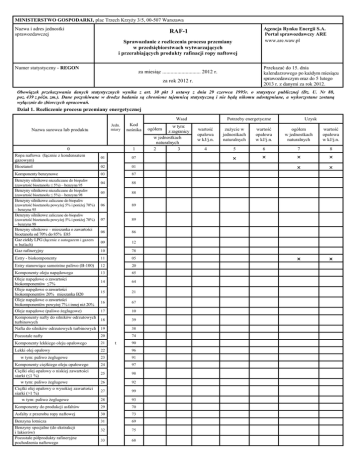 MINISTERSTWO GOSPODARKI, plac Trzech KrzyŜy 3/5, 00-507 Warszawa Nazwa i adres jednostki sprawozdawczej RAF-1 Sprawozdanie z rozliczenia procesu przemiany w przedsiębiorstwach wytwarzających i przerabiających produkty rafinacji ropy naftowej Numer statystyczny - REGON Agencja Rynku Energii S.A. Portal sprawozdawczy ARE www.are.waw.pl Przekazać do 15. dnia kalendarzowego po kaŜdym miesiącu sprawozdawczym oraz do 5 lutego 2013 r. z danymi za rok 2012. za miesiąc ............................ 2012 r. za rok 2012 r. Obowiązek przekazywania danych statystycznych wynika z art. 30 pkt 3 ustawy z dnia 29 czerwca 1995r. o statystyce publicznej (Dz. U. Nr 88, poz. 439 z późn. zm.). Dane pozyskiwane w drodze badania są chronione tajemnicą statystyczną i nie będą nikomu udostępniane, a wykorzystane zostaną wyłącznie do zbiorczych opracowań. Dział 1. Rozliczenie procesu przemiany energetycznej Wsad Jedn. miary Nazwa surowca lub produktu 0 Kod nośnika 1 Ropa naftowa (łącznie z kondensatem gazowym) 01 07 Bioetanol 02 01 Komponenty benzynowe 03 87 04 88 05 88 06 89 07 89 08 86 Benzyny silnikowe niezaliczane do biopaliw (zawartość bioetanolu ≤ 5%) – benzyna 95 Benzyny silnikowe niezaliczane do biopaliw (zawartość bioetanolu ≤ 5%) – benzyna 98 Benzyny silnikowe zaliczane do biopaliw (zawartość bioetanolu powyŜej 5% i poniŜej 70%) – benzyna 95 Benzyny silnikowe zaliczane do biopaliw (zawartość bioetanolu powyŜej 5% i poniŜej 70%) – benzyna 98 Benzyny silnikowe – mieszanka o zawartości bioetanolu od 70% do 85% E85 Gaz ciekły LPG (łącznie z autogazem i gazem 09 12 Gaz rafineryjny 10 78 Estry - biokomponenty 11 05 Estry stanowiące samoistne paliwo (B-100) 12 20 Komponenty oleju napędowego 13 65 14 64 15 21 16 67 w butlach) Oleje napędowe o zawartości biokomponentów ≤7% Oleje napędowe o zawartości biokomponentów 20% mieszanka B20 Oleje napędowe o zawartości biokomponentów powyŜej 7% i innej niŜ 20% Oleje napędowe (paliwo Ŝeglugowe) 17 10 Komponenty nafty do silników odrzutowych 18 turbinowych 39 Nafta do silników odrzutowych turbinowych 19 38 Pozostałe nafty 20 Komponenty lekkiego oleju opałowego 21 Lekki olej opałowy 22 96 w tym: paliwo Ŝeglugowe 74 t 90 23 91 Komponenty cięŜkiego oleju opałowego 24 97 CięŜki olej opałowy o niskiej zawartości siarki (≤1 %) 25 98 26 92 27 99 w tym: paliwo Ŝeglugowe CięŜki olej opałowy o wysokiej zawartości siarki (>1 %) w tym: paliwo Ŝeglugowe 28 93 Komponenty do produkcji asfaltów 29 70 Asfalty z przerobu ropy naftowej 30 73 Benzyna lotnicza 31 69 32 75 33 68 Benzyny specjalne (do ekstrakcji i lakierów) Pozostałe półprodukty rafineryjne pochodzenia naftowego w tym: ogółem z zagranicy w jednostkach naturalnych 2 3 Potrzeby energetyczne wartość opałowa w kJ/j.n. Uzysk wartość opałowa w kJ/j.n. zuŜycie w jednostkach naturalnych ogółem w jednostkach naturalnych wartość opałowa w kJ/j.n. 4 5 6 7 8 × × × × × × × × Dział 1. Rozliczenie procesu przemiany energetycznej (dok.) Wsad Jedn. miary Nazwa surowca lub produktu 0 Kod nośnika 1 w tym: ogółem z zagranicy w jednostkach naturalnych 2 Potrzeby energetyczne Uzysk wartość opałowa w kJ/j.n. zuŜycie w jednostkach naturalnych wartość opałowa w kJ/j.n. ogółem w jednostkach naturalnych wartość opałowa w kJ/j.n. 4 5 6 7 8 × × × × × × × × × × × × × × 3 Oleje bazowe 34 80 Oleje silnikowe 35 71 Oleje i preparaty smarowe 36 82 Wazeliny, gacze, parafiny, woski pochodzenia naftowego 37 72 Benzyna do pirolizy 38 76 Gudron 39 59 Pozostałe produkty naftowe 40 77 Biometanol 41 Biodimetyloeter 42 58 Bio-ETBE 43 08 Bio-MTBE 44 09 Inne dodatki uszlachetniające 45 81 Etan 46 57 Koks naftowy 47 63 Benzole surowe 48 52 Siarka 49 55 Oleje odpadowe – przepracowane 50 22 × × × × × Pozostałe odpady przemysłowe stałe i ciekłe 51 34 × × × × × Paliwa odpadowe gazowe 52 79 × × × Gaz ziemny wysokometanowy 53 13 × × × × 15 × × 60 × × × × × × × × Gaz ziemny z odmetanowania pokładów węgla Węgiel kamienny do celów energetycznych t GJ 06 dam3 54 55 t Koks i półkoks z węgla 56 Ciepło w parze i gorącej wodzie 57 GJ 23 Energia elektryczna 58 MWh 24 Odzysk z przemysłu petrochemicznego 59 w tym: 62 × × × × × × × × 60 61 62 t 63 64 Dział 2. Moce przerobowe (w tys. ton/rok) Nazwa procesu 0 Moc przerobowa Nazwa procesu 1 0 Moc przerobowa 1 Destylacja atmosferyczna 01 Koksowanie 08 Destylacja próŜniowa 02 Reforming katalityczny 09 Kraking katalityczny (ekwiwalentny) 03 Hydroodsiarczanie (HDS), Hydrotreating (HT) 10 Kraking katalityczny 04 Alkilacja 11 Hydrokraking 05 Polimeryzacja 12 Kraking termiczny 06 Izomeryzacja 13 Visbreaking 07 Produkcja ETBE 14 Produkcja MTBE 15 .................................................................... (imię, nazwisko i telefon osoby, która sporządziła sprawozdanie) ............................................. (miejscowość, data) ................................................................. (imię, nazwisko i telefon osoby zatwierdzającej sprawozdanie)