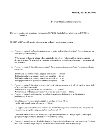Otwock, dnia 12.01.2009r. Do wszystkich zainteresowanych Dotyczy: przetarg na sprzątanie pomieszczeń SP ZOZ Szpitala Specjalistycznego MSWiA w Otwocku. . SP ZOZ MSWiA w Otwocku informuje, że wpłynęły następujące pytania; 1. Prosimy o podanie zabezpieczenia czasowego dla wykonania w/w usługi. Czy wykonawca ma zabezpieczyć dyżur nocny? Wykonawca wykonuje usługę od poniedziałku do soboty (włącznie) bez zabezpieczania dyżuru nocnego. W niedzielę wymagane jest usunięcie odpadów medycznych i komunalnych raz dziennie. 2. Prosimy o podanie ilości koszy na odpady komunalne, zakaźne, specjalne i pozostałe odpady medyczne. Ilość koszy (pojemników) na odpady komunalne -125 szt Ilość pojemników na odpady medyczne zakaźne - 26 szt Ilość pojemników na odpady medyczne specjalne - 4 szt Ilość pojemników na pozostałe odpady medyczne - 8 szt 3. Prosimy o podanie ilości m2 powierzchni podlegającej konserwacji, akrylowaniu a także ilości m2 wykładzin dywanowych. Powierzchnia akrylowa w m2 do konserwacji - 1825 m2 Powierzchnia wykładzin dywanowych w m2 do konserwacji - 160m2 4. Prosimy o podanie orientacyjnej wysokości pomieszczeń Szpitala oraz ilości okien podlegających myciu. Orientacyjna wysokość pomieszczeń w szpitalu wynosi 3,5 m. Liczba okien podlegających myciu – 250 szt. 5. Do kogo należy zabezpieczenie wózków do transportu odpadów komunalnych i medycznych ( zakaźnych, specjalnych i pozostałych medycznych )?. Zabezpieczenie wózków do transportu odpadów komunalnych i medycznych ( zakaźnych, specjalnych i pozostałych ) należy do wykonawcy usługi. 6. Prosimy o podanie nazwy środków do mycia i dezynfekcji rąk obecnie stosowanych w Szpitalu oraz ilości miesięcznego zużycia a także ilości dozowników na w/w preparaty. Środki używane do mycia i dezynfekcji : Spitaderm i Skinman Soft. Ilość miesięcznego zużycia środków wynosi około 20 litrów. Liczba dozowników łokciowych - 18 szt. 7. Czy w Szpitalu są żaluzje, rolety, które podlegają praniu? Jeżeli ta czynność ma należeć do wykonawcy prosimy o podanie ilości m2 podlegających w/w czynności. Czynność określona w tym punkcie jest objęta każdorazowo indywidualnym zleceniem. 8. Czy na terenie Szpitala istnieje możliwość zainstalowania pralki do prania mopów. Jeżeli tak, to na jakich warunkach i jakie z tego tytułu koszty ponosiłby wykonawca?. Istnieje możliwość zainstalowania pralki do prania mopów na terenie szpitala. Wykonawca ponosiłby koszty energii, wody, odpadów kanalizacyjnych i dzierżawy pomieszczenia wg stawek obowiązujących w Otwocku. 9. Czy na terenie Szpitala istnieje możliwość wydzierżawienia pomieszczeń na cele biurowe, magazynowe i szatnię dla pracowników wykonawcy?. Jeśli tak, to na jakich warunkach?. Na terenie szpitala nie ma możliwości wydzierżawienia pomieszczeń dla celów opisanych w punkcie 9. 10. Prosimy o podanie ilości dozowników na mydło, podajników na ręczniki jednorazowe i papier toaletowy oraz ich rodzaju, jaką obecnie posiada Zamawiający, a którą wykonawca będzie zobowiązany uzupełnić. liczba dozowników na mydło typu Kimberly Clark - 3 szt liczba dozowników zwykłych na mydło - 42 szt liczba podajników na ręczniki jednorazowe w rolce - 30szt liczba podajników na ręczniki jednorazowe typu Kimberly Clark - 39szt liczba podajników na papier toaletowy typu Kimberly Clark - 10 szt liczba podajników zwykłych na papier toaletowy w rolce - 30szt Wykonawca usługi będzie zobowiązany do uzupełnienia : dozowników na mydło w ilości - 10szt podajników na papier toaletowy - 5 szt dozowników łokciowych - 2szt 11. Jaką odpowiednią ilość dozowników na mydło w płynie, podajników na ręczniki jednorazowe papier toaletowy oraz pojemników i szczotek do czyszczenia muszli klozetowych ma zapewnić wykonawca ( pkt. 16,17,18,19, rozdział II SIWZ )? Liczba szczotek do czyszczenia muszli klozetowych - 35 szt Wykonawca usługi będzie musiał uzupełnić liczbę szczotek o -35 szt. 12. Do kogo należy dezynfekcja żarników lamp bakteriobójczych?. Jeżeli do wykonawcy, to prosimy o podanie ilości lamp podlegających dezynfekcji. Nie dotyczy szpitala 13. Prosimy o podanie ilości sal chorych, łóżek, gabinetów zabiegowych, sanitariatów w Szpitalu. liczba sal chorych w szpitalu - 60 liczba łóżek -137 liczba gabinet lekarskich – 6 liczba pomieszczeń socjalnych - 5 liczba pomieszczeń wykorzystywanych jako sekretariaty - 3 liczba pomieszczeń wykorzystywanych jako kuchenki oddziałowe - 2 liczba gabinetów terapii indywidualnej - 7 liczba sal terapii grupowej - 6 liczba gabinetów zabiegowych - 3 liczba sal do prowadzenia kinezyterapii - 4 liczba sal do prowadzenia fizykoterapii - 5 liczba gabinetów fizykoterapeutycznych - 6 liczba gabinetów do prowadzenia hydroterapii - 4 liczba gabinetów pielęgniarek oddziałowych - 4 liczba łazienek i WC - 35 Z poważaniem Przewodnicząca Komisji Przetargowej Jadwiga Rejf