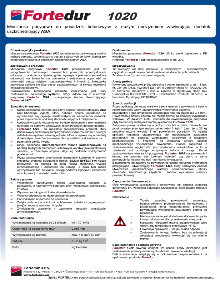 1020 Mieszanka posypowa do posadzek betonowych z duŜym obciąŜeniem zawierająca dodatek uszlachetniający ASA Charakterystyka produktu Mieszanka posypowa Fortedur 1020 jest mieszanką zawierającą ecjalne rodzaje cementu, wypełniaczy w postaci spiekanych tlenków i domieszek chemicznych łącznie z dodatkiem uszlachetniającym ASA. Opakowanie Mieszanka posypowa Fortedur 1020: 25 kg worki papierowe z PE wkładką. Preparat Fortecoat 1425: puszka blaszana o obj. 20 l. Zastosowanie produktu Mieszanka posypowa Fortedur 1020 przeznaczona jest do przygotowania betonowych nawierzchni posadzek przemysłowych odpornych na duŜe obciąŜenie, gdzie wymagana jest nadstandardowa odporność na ścieranie, na uderzenia i zwiększona odporność na chłonność cieczy (olejów, rozpuszczalników i innych...). Mieszankę posypową aplikuje się jako posyp powierzchniowy na świeŜo rozłoŜoną mieszankę betonową. Niezawodność funkcjonalna produktu zapewniona jest przy zastosowaniu zalecanego systemu, który składa się z mieszanki posypowej Fortedur 1020 i specjalnego środka utwardzającego Fortecoat 1425. Magazynowanie 12 miesięcy od daty produkcji w zamkniętym i nienaruszonym oryginalnym opakowaniu. Worki ułoŜone na drewnianych paletach. Trzeba chronić przed mrozem i wilgocią. Specjalność systemu • Sucha mieszanka zawiera specjalny dodatek uszlachetniający ASA (Anti-Shrinkage Agent), który dobitnie obniŜa podatność na wytwarzanie się pęknięć włoskowatych na nawierzchni posadzki przez zapewnienie wyŜszej stabilności objętości. Dzięki temu • końcowe wraŜenie wizualne jest bardziej doskonałe a równocześnie dochodzi do poprawy właściwości mechanicznych gotowej osadzki. Fortecoat 1425 – to specjalnie zaprojektowany preparat, który • dzięki swojej doskonałej kompatybilności wytwarza razem z suchym składnikiem systemu idealną jedność, która przejawia się w bardziej doskonałym utwardzeniu nawierzchni posadzki i uodpornieniu na • penetrację olejów i wody. • Dzięki obecności mikroelementów mocno uodpornionych na abrazję będących elementem składowym warstwy powierzchniowej systemu, w znacznym stopniu udaje się podnieść wytrzymałość powierzchni. • Przez zastosowanie drobniutkich elementów kulistych w suchym składniku systemu osiąganięto dzeięki SILICA EFFECTowi niŜszą porowitość, co pociąga za sobą niŜszą chłonność, wyŜszą mrozoodporność i odporność na korozję, a poza tym rośnie wytrzymałość (na ściskanie, naciąg podczas zginania i odporność na ścieranie ) i zwartość powierzchni. Zalety systemu • Wielokrotne przedłuŜenie czasu uŜytkowania posadzki w porównaniu z klasycznymi betonami przy minimalnym podniesieniu kosztów. • Wysoka produkcyjność i łatwość nakładania. • Wysoka odporność na duŜe obciąŜenie produkcyjne. • PodwyŜszona odporność na uderzenia. • Zwiększenie odporności na wchłanianie substancji agresywnych (olejów, ropuszczalników i innych). • Zmniejszenie zapylenia i uzyskanie lepszych właściwości antypoślizgowych. Atesty próbne Wykonano początkowe próby produktu i ocenę zgodności z art. 13 ust. nr. 22/1997 Dz.U. 102/2001 Dz. i art. 5 uchwały rządu nr. 190/2002 Dz. w brzmieniu aktualnym i jest w zgodzie z Dyrektywą Rady Unii Europejskiej 89/106/EHS (CPD – Construction Products Directive) w brzmieniu Dyrektywy 93/68/UGiW. Sposób aplikacji Przed aplikacją pierwszej warstwy trzeba usunąć z powierzchni betonu nadmierną ilość wody, przeprowadzić wyrównanie poziomu powierzchni i jego umocnienie (zaciśnięcie ręką na głębokość 3-5 mm). Powierzchnię betonu zaciera się mechanicznie za pomocą wygładzarki walcowej. W dalszym kroku dochodzi do równomiernego posypania płyty betonowej suchą mieszanką systemową Fortedur 1020. Zasypanie przeprowadza się w jednym czy teŜ w dwóch krokach, nie przekraczając przy tym maksymalnej ilości 3 kg/m2 (tzn., Ŝe z 25 kg produktu moŜna wyrobić 8 m2 powierzchni posadzki). Po kaŜdej aplikacji materiału przeprowadza się mechaniczne zacieranie powierzchni za pomocą wygładzarek walcowych z łopatkami kombinowanymi i finalnymi, co zapewnia wysoki stopień mechanicznego wykończenia powierzchni. Proces zacierania z zastosowaniem wygładzarki jest powtarzany wielokrotnie, a to w zaleŜności od przebiegu krzepnięcia betonu i posypu. Przed zastosowaniem mieszanki posypowej Fortedur 1020 na powierzchni betonu nie powinno być Ŝadnych wgłębień czy plam, a sama powierzchnia niepowinna być nadmiernie wysuszona. Bezpośrednio po zatarciu na powierzchnię trzeba natryskać impregnant pielęgnująco - utwardzający Fortecoat 1425, który podwyŜszy poziom utwardzenia mechanicznego warstwy powierzchniowej, obniŜy chłonność, zminimalizuje zapylenie i zabroni wysuszeniu warstwy powierzchniowej. Czyszczenie i konserwacja Opis wykonywania czyszczenia i konserwacji jest częścią składową dokumentu p.t. Polecenia dotyczące czyszczenia i konserwacji produktu Fortedur. OstrzeŜenie • • Dane techniczne Wytrzymałość na ściskanie po 28 dniach min. 70 MPa Odporność na ścieranie wg BCA 0,035 mm 3 Wytrzymałość wg Böhma max. 4,0 cm / 50 cm ZuŜycie 3 – 6 kg / m2 Kolor wg Cenniku • 2 • • Trzeba zapobiec powstawaniu przeciągu, bezpośredniemu promieniowaniu słonecznemu i jakiejkolwiek innej niestandardowej przyczynie powodującej wysychanie powierzchni betonu po nałoŜeniu. Niedopuszczalne jest dodatkowe dodawanie spoiw i innych dodatków albo przesiewanie mieszanki. NałoŜenie mieszanki moŜna przeprowadzać tylko wtedy, gdy temperatura przewyŜsza +5° C. Likwidacja opakowań - tak jak reszta odpadu. Zastosowanie innego lakieru bez wcześniejszej akceptacji producenta wykonuje się na własne ryzyko. Bezpieczeństwo i ochrona zdrowia Fortedur 1020 zawiera cement. W czasie pracy niezbędne jest zastosowanie pomocy ochronnych (ubranie, rękawice, okulary). Dalsze informacje 