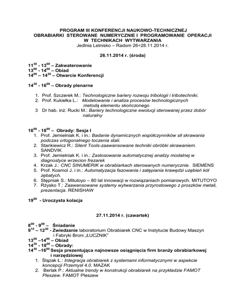 PROGRAM III KONFERENCJI NAUKOWO-TECHNICZNEJ OBRABIARKI STEROWANE NUMERYCZNIE I PROGRAMOWANIE OPERACJI W TECHNIKACH WYTWARZANIA Jedlnia Letnisko – Radom 26÷28.11.2014 r. 26.11.2014 r. (środa) 1130 - 1300 – Zakwaterowanie 1300 - 1400 – Obiad 1400 – 1430 – Otwarcie Konferencji 1430 - 1600 – Obrady plenarne 1. Prof. Szczerek M.: Technologiczne bariery rozwoju tribologii i tribotechniki. 2. Prof. Kukiełka L.: Modelowanie i analiza procesów technologicznych metodą elementu skończonego 3 Dr hab. inż. Rucki M.: Bariery technologiczne ewolucji sterowanej przez dobór naturalny 1600 - 1800 – Obrady: Sesja I 1. Prof. Jemielniak K. i in.: Badanie dynamicznych współczynników sił skrawania podczas ortogonalnego toczenia stali. 2. Stankiewicz R.: Silent Tools-zaawansowane techniki obróbki skrawaniem. SANDVIK 3. Prof. Jemielniak K. i in.: Zastosowanie automatycznej analizy modalnej w diagnostyce wrzecion frezarek 4. Krzak J.: CNC SINUMERIK w obrabiarkach sterowanych numerycznie. SIEMENS 5. Prof. Kosmol J. i in.: Automatyzacja fazowania i zatępiania krawędzi uzębień kół zębatych. 6. Stępniak S.: Mitutoyo – 80 lat innowacji w rozwiązaniach pomiarowych. MITUTOYO 7. Rżysko T.: Zaawansowane systemy wytwarzania przyrostowego z proszków metali, prezentacja. RENISHAW 1900 - Uroczysta kolacja 27.11.2014 r. (czwartek) 800 - 900 – Śniadanie 915 – 1230 - Zwiedzanie laboratorium Obrabiarek CNC w Instytucie Budowy Maszyn i Fabryki Broni „ŁUCZNIK” 1300 –1400 – Obiad 1430 - 1800 – Obrady: 1430 –1600 Sesja prezentująca najnowsze osiągnięcia firm branży obrabiarkowej i narzędziowej 1. Ślązak Ł.: Integracja obrabiarek z systemami informatycznymi w aspekcie koncepcji Przemysł 4.0. MAZAK 2. Berlak P.: Aktualne trendy w konstrukcji obrabiarek na przykładzie FAMOT Pleszew. FAMOT Pleszew 3. Rossa R.: Łańcuch przygotowania procesu wytwarzania w FAMOT. FAMOT Pleszew 4. Waechner J.: DMG MORI – zarys działalności firmy. DMG MORI 5. Morzyk A.: Robotyzacja szansą na rozwój polskich przedsiębiorstw. FANUC 6. Otręba T.: Wykorzystanie wyznaczonych empirycznie wartości posuwu na ząb w algorytmie aplikacji komputerowej BandCalc™ do doboru i optymalizacji parametrów cięcia piłami taśmowymi. BAHCO 7. Tyczyński P.: Nowoczesne rozwiązania konstrukcyjne w obszarze narzędzi sterowanych i mechatronicznych. MAPAL 8. Lenartowicz K.: Targi Kielce – lider targów technologii obróbki, obrabiarek i narzędzi. TARGI KIELCE Sesja II 1615 – 1800 1. Józwik J., Byszewski M.: Metody i systemy diagnostyczne 5-osiowych centrów obróbkowych do oceny osi obrotowych. 2. Miko E., Nowakowski Ł.: Wpływ posuwu na ostrze na parametry chropowatości frezowanych walcowo. 3. Pytlak B.: Toczenie powierzchni mimośrodowych 4. Nowakowski L ., Miko E.: Analiza procesu frezowania stali NC6 5. Semotiuk L., Józwik J., Parametryzacja technologicznych programów obróbkowych w systemie Heidenhain TNC620. 6. Wolszczak P., i in.: Chłodzenie narzędzi skrawających 7. Kukiełka K.: Numeryczna analiza przyczyn powstawania błędów podczas procesu walcowania gwintów okrągłych 8. Olszak A., Kęsy A.: Nowe materiały i technologie w budowie aparatury chemicznej Sesja III 1615- 1800 1. Prof. Adamczak S., i in.: Wpływ wybranych parametrów pomiaru na wynik oceny odchyłki okrągłości na współrzędnościowej maszynie pomiarowej. 2. Poniatowska M.: Korekcja programów obróbkowych powierzchni swobodnych na podstawie modeli CAD błędów obróbki. 3. Prof. Adamczak S., i in.: Założenia do oceny wiarygodności pomiarów topografii powierzchni w różnych skalach 4. Rucki M.: Zmienność stałej czasowej w czasie pomiaru czujnikiem pneumatycznym 5. Makieła W., Gogolewski D.: Kryteria doboru falki bazowej odnoszące się do analizy chropowatości powierzchni 3D 6. Zalewski A.: Zastosowanie technik automatyzacji programowania w systemach CAM do oceny efektywności frezowania CNC 7. Zyzak P.: Klasyczne zadanie sztucznej inteligencji - wieże HANOI. 8. Narojczyk J., Morozow D., Siemiątkowski Z.: Obróbka stopu tytanu Ti-6Al-4V narzędziami implantowanymi 1900 - Kolacja 28.11.2014 r. (piątek) 800 - 900 – Śniadanie 915 – 1200 – Obrady: Sesja IV 1. Król K., i in.: Indywidualność dynamiczna układu głowica wiertarska – rura wiertarska – wał, podczas wiercenia głębokich otworów 2. Ciecieląg J.: Analiza pomiarów wybranych części maszyn za pomocą różnych technik pomiarowych. 3. Kluz R., i in.: Dokładność pozycjonowania robotów w elastycznych systemach montażowych 4. Król R.: Optymalizacja kształtu zębów pił taśmowych 5. Gruszka P.: Analiza dynamiki układu kinematycznego dźwigniowego z przekładnią kulową do napędu ramienia manipulatora Przerwa – 1030 – 1050 6. Mazurkiewicz A., Bielak S.: Ocena jakości powierzchni wybranego materiału po teksturowaniu laserowym 7. Markiewicz A.: Wybrane problemy syntezy wymiarów konstrukcyjnych płaskiego manipulatora o dwóch stopniach swobody. 8. Mazur T.: Analityczne rozwiązania zadania odwrotnego kinematyki dla manipulatora 9. Majcher A.: Struktury systemów sterowania urządzeniami technologicznymi procesów PVD. 10. Patyk R., Patyk S.: Określanie głównej siły wygniatania regularnych nierówności na powierzchniach walcowych Sesja V – 915 – 1200 1. Jermak Cz.: Ocena funkcji przetwarzania statycznego pneumatycznych czujników długości 2. Gorycki Ł. i in.: Testowanie wstępne urządzenia do pomiaru momentów oporowych łożysk tocznych w aspekcie dokładności kształtowo-wymiarowej elementów współpracujących 3. .Migus M., Kęsy A. i in.: Wybrane problemy komputerowego modelowania i wytwarzania podzespołów hydrokinetycznych 4. .Budzynowski T. i in.: Próba analitycznego skorelowania stopowości staliwa z wielkością zużycia przez tarcie próbek w stanie surowym i z warstwą azotowaną 5. Kowalik M., Trzepieciński T: Techniki wysokoenergetyczne cięcia – stan obecny i kierunki rozwoju Pr
