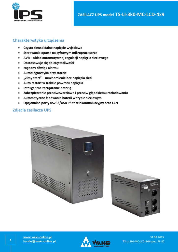 ZASILACZ UPS model TS-LI-3k0-MC-LCD-4x9 Charakterystyka urządzenia Czysto sinusoidalne napięcie wyjściowe Sterowanie oparte na cyfrowym mikroprocesorze AVR – układ automatycznej regulacji napięcia sieciowego Dostosowuje się do częstotliwości Łagodny dźwięk alarmu Autodiagnostyka przy starcie „Zimy start” – uruchomienie bez napięcia sieci Auto restart w trakcie powrotu napięcia Inteligentne zarządzanie baterią Zabezpieczenie przeciwzwarciowe i przeciw głębokiemu rozładowaniu Automatyczne ładowanie baterii w trybie sieciowym Opcjonalne porty RS232/USB i filtr telekomunikacyjny oraz LAN Zdjęcia zasilacza UPS 1 www.waks-online.pl [email protected] 31.08.2015 TS-LI-3k0-MC-LCD-4x9-spec_PL-R2 ZASILACZ UPS model TS-LI-3k0-MC-LCD-4x9 Parametry techniczne TM-LI-3k0-MC-LCD-4x9 MODEL Moc znamionowa (pozorna/czynna) 3000VA/2400W WEJŚCIE Napięcie wejściowe Częstotliwość napięcia wejściowego 230VAC ± 25% (opcjonalnie - 35%) 50/60Hz ± 10% (auto selekcja) WYJŚCIE Napięcie wyjściowe Częstotliwość napięcia wyjściowego Kształt napięcia wyjściowego 230VAC ± 10% 50/60Hz ± 1% (auto selekcja) Tryb sieciowy: czysty sinus, Tryb bateryjny: czysty sinus Czas przełączenia na UPS Typowo 2-7 ms, maksymalnie 8 ms Liczba gniazd wyjściowych 3szt (CEE 7/3 Schuko) BATERIA Napięcie stałe Konfiguracja Czas ładowania Czas podtrzymania (minimalny) 100%/74%/50% 48V 4x12V/9Ah 6-8 godzin dla 90% pojemności 2 min / 5min / 8min ZABEZPIECZENIA Pełna ochrona Przeciwzwarciowa, przed głębokim rozładowaniem i przeciążeniowa PARAMETRY ŚRODOWISKOWE Wilgotność względna w czasie pracy Poziom hałasu 20~90% RH @ 0~40°C (bez kondensacji) ≤ 50 dB (1m) KOMUNIKACJA USB/RS-232/(opcja) Wsparcie dla Windows®98/2000/2003/XP/Vista/2008/Windows®7/Windows®8 WYMIARY I WAGA Waga netto/brutto (kg) 2 28,5/30,2 Wymiary szer./gł./wys. (mm) a/b/c 193/455/330 Wymiary opakowania szer./gł./wys. (mm) 320/600/460 www.waks-online.pl [email protected] 31.08.2015 TS-LI-3k0-MC-LCD-4x9-spec_PL-R2 ZASILACZ UPS model TS-LI-3k0-MC-LCD-4x9 Rysunek techniczny: Akcesoria standardowe: - wewnętrzny akumulator 12V/7Ah - SN-32B Akcesoria dodatkowe (opcje): - port USB - port RS-232 - akumulator MW 7.2-12, MWH 9-12, MWL 9-12L - przewód USB - przewód RS-232 -> RS232 - konwerter RS-232 -> USB - oprogramowanie UPSmart 3 www.waks-online.pl [email protected] 31.08.2015 TS-LI-3k0-MC-LCD-4x9-spec_PL-R2