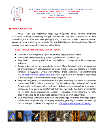 THE CATHOLIC LEAGUE FOR RELIGIOUS ASSISTANCE TO POLAND AND POLONIA LIGA KATOLICKA POMOCY RELIGIJNEJ POLSCE I POLONII 2330 WEST 118TH STREET, CHICAGO, ILLINOIS 60643 TEL. 312-534-5055 WWW.CATHOLICLEAGUEPOLONIA.ORG POMOC FINANSOWA Misja i cele Ligi Katolickiej mogą być osiągnięte dzięki żarliwej modlitwie i szczodrej pomocy finansowej naszych darczyńców. Aby móc uczestniczyć w misji i celach Ligi oraz ofiarować swój pieniężny dar, prosimy o kontakt z naszym biurem. Wszystkie donacje złożone na potrzeby Ligi Katolickiej Pomocy Religijnej Polsce i Polonii, zgodnie z prawem, mogą być odpisane od podatku. DZIĘKI POMOCY FINANSOWEJ LIGA KATOLICKA: Urzeczywistnia misję i cele Ligi w najbardziej naglących potrzebach. Umożliwia niesienie pomocy Polonii, zgodnie z misją i celami Ligi. Przychodzi z pomocą Kościołowi Katolickiemu i instytucjom charytatywnym w Polsce. Pomaga darczyńcom w zamawianiu intencji Mszy Świętych, które sprawowane są przez misjonarzy, posługujących na całym świecie, lub przez kapłanów w Polsce (prosimy o wysyłanie wypisanych intencji drogą pocztową lub elektroniczną na: [email protected]; biuro Ligi prześle do Państwa odpowiedź o wyznaczonym terminie i miejscu Mszy Świętych). Przydziela stypendia, przez co wpływa na życie młodzieży polonijnej – studentów rzymskokatolickich uniwersytetów w USA. Dodatkowo Liga udostępniać będzie fundusze dla osób świeckich – mężczyzn i kobiet, uczestniczących w programach kształcenia i formacji na parafialnych liderów świeckich. Fundusze stypendialne na te cele, będą przydzielane osobom z poszczególnych regionów w USA, proporcjonalnie do ich aktywnego zaangażowania się w inicjatywy Ligi. Daje możliwość stworzenia funduszu stypendialnego w formie prawnego zapisu w imieniu darczyńców Ligi. Po więcej informacji, prosimy o kontakt z biurem Ligi lub kontakt pocztą elektroniczną na adres: [email protected] THE CATHOLIC LEAGUE FOR RELIGIOUS ASSISTANCE TO POLAND AND POLONIA LIGA KATOLICKA POMOCY RELIGIJNEJ POLSCE I POLONII 2330 WEST 118TH STREET, CHICAGO, ILLINOIS 60643 TEL. 312-534-5055 WWW.CATHOLICLEAGUEPOLONIA.ORG PRZEDMIOTY LITURGICZNE Czy jesteście Państwo w posiadaniu pięknych przedmiotów liturgicznych, które odziedziczyliście lub nabyliście, a które mogłyby zostać przekazane do użytku kościołom będącym w potrzebie, a dzięki temu kontynuowane będzie oddawanie czci i chwały Naszemu Bogu? (przedmioty typu: kielichy, pateny, cyboria, monstrancje, świeczniki na ołtarz, szaty liturgiczne, hafty, ozdobne nakrycia, kapy, posągi, ornamenty, relikwie święte, medale i obrazy Świętych Pańskich, Stacje Drogi Krzyżowej, różańce itp.) W momencie wydania decyzji o zamknięciu parafii lub zmianie jej funkcjonowania, przedmioty liturgiczne nadal mogą pozostawać na jej terenie lub nie są już tak potrzebne, jak w aktywnych parafiach. Posłużyć mogą one jednak kościołom będącym w potrzebie zarówno w krajach misyjnych jak i w Polsce. Prosimy o kontakt telefoniczny (tel. do biura Ligi 312-534-5055) lub elektroniczny ([email protected]) w sprawie wyżej wymienionego typu darowizn, które wykorzystane będą na placówkach misyjnych, w Polsce i USA. Prosimy o załączenie kompletnego, szczegółowego opisu danego przedmiotu, miejsca pochodzenia wraz z pełnymi danymi ofiarodawcy. Potwierdzenie otrzymania darowizny zostanie przesłane do darczyńcy na potrzeby rekordu odpisu podatkowego. THE CATHOLIC LEAGUE FOR RELIGIOUS ASSISTANCE TO POLAND AND POLONIA LIGA KATOLICKA POMOCY RELIGIJNEJ POLSCE I POLONII 2330 WEST 118TH STREET, CHICAGO, ILLINOIS 60643 TEL. 312-534-5055 WWW.CATHOLICLEAGUEPOLONIA.ORG SZTUKA SAKRALNA Służymy i chwalimy Boga naszym sercem, umysłem i wszystkimi pozostałymi zmysłami. Artystyczne dziedzictwo Polski, Polonii i wiary katolickiej wyrażone jest w obrazach i rzeźbach, które godne są ochrony i konserwacji. Prosimy o kontakt w sprawie darowizn sztuki sakralnej lub przesłanie ich na adres biura Ligi (2330 West 118th St. Chicago, IL 60643). Prosimy o załączenie kompletnego, szczegółowego opisu danego przedmiotu, miejsca pochodzenia wraz z pełnymi danymi ofiarodawcy. Potwierdzenie otrzymania darowizny zostanie przesłane do darczyńcy na potrzeby rekordu odpisu podatkowego. INNE DOBRA MAJĄTKOWE Prosimy o pamięć o Lidze Katolickiej Pomocy Religijnej Polsce i Polonii w swoich planach zapisów majątkowych i testamentowych. Donacja, jakiejkolwiek części nieruchomości, czy dziedziczonego spadku może na trwale wpłynąć i zmienić życie tych, którzy korzystać będą z pomocy oferowanej przez Ligę. W celu wsparcia stypendiów oferowanych przez Ligę, możecie Państwo utworzyć stypendia naukowe w imieniu danej osoby z rodziny, co będzie sposobem upamiętnienia Waszego rodowego dziedzictwa. Po więcej informacji, prosimy o kontakt z biurem Ligi (tel. 312-534-5055) lub kontakt pocztą elektroniczną na adres: [email protected]