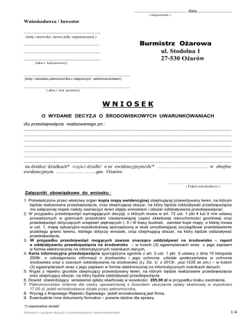 .......................................... data............................ ( miejscowość ) Wnioskodawca / Inwestor ............................................................. (imię i nazwisko, nazwa jedn. organizacyjnej ) Burmistrz Ożarowa ul. Stodolna 1 27-530 Ożarów ............................................................ ............................................................. ............................................................. (adres i kod pocztowy) ................................................................................... (imię i nazwisko pełnomocnika z załączonym pełnomocnictwem) ................................................................................... ( adres i kod pocztowy) WNIOSEK O WYDANIE DECYZJI O ŚRODOWISKOWYCH UWARUNKOWANIACH dla przedsięwzięcia realizowanego pn.: ..................................................................................................................................................................... ..................................................................................................................................................................... ..................................................................................................................................................................... ..................................................................................................................................................................... ..................................................................................................................................................................... ..................................................................................................................................................................... ..................................................................................................................................................................... na działce/ działkach* /części działki/ o nr ewidencyjnym/ch/* …………………….…… w obrębie ewidencyjnym ………...….. ……..gm. Ożarów. ………………….……………. ( Podpis wnioskodawcy ) Załączniki obowiązkowe do wniosku : 1. Poświadczona przez właściwy organ kopia mapy ewidencyjnej obejmującej przewidywany teren, na którym będzie realizowane przedsięwzięcie, oraz obejmującej obszar, na który będzie oddziaływać przedsięwzięcie /na załączonej mapie należy zaznaczyć teren objęty wnioskiem i obszar oddziaływania przedsięwzięcia/, 2. W przypadku przedsięwzięć wymagających decyzji, o których mowa w art. 72 ust. 1 pkt 4 lub 5 n/w ustawy prowadzonych w granicach przestrzeni niestanowiącej części składowej nieruchomości gruntowej oraz przedsięwzięć dotyczących urządzeń piętrzących I, II i III klasy budowli, zamiast kopii mapy, o której mowa w ust. 1, mapę sytuacyjno-wysokościową sporządzoną w skali umożliwiającej szczegółowe przedstawienie przebiegu granic terenu, którego dotyczy wniosek, oraz obejmującą obszar, na który będzie oddziaływać przedsięwzięcie, 3. W przypadku przedsięwzięć mogących zawsze znacząco oddziaływać na środowisko – raport o oddziaływaniu przedsięwzięcia na środowisko – w trzech (3) egzemplarzach wraz z jego zapisem w formie elektronicznej na informatycznych nośnikach danych, 4. Karta informacyjna przedsięwzięcia sporządzona zgodnie z art. 3 ust. 1 pkt 5 ustawy z dnia 15 listopada 2008r. o udostępnianiu informacji o środowisku i jego ochronie, udziale społeczeństwa w ochronie środowiska oraz o ocenach oddziaływania na środowisko (t.j. Dz. U. z 2013r., poz.1235 ze zm.) – w trzech (3) egzemplarzach wraz z jego zapisem w formie elektronicznej na informatycznych nośnikach danych; 5. Wypis z rejestru gruntów obejmujący przewidywany teren, na którym będzie realizowane przedsięwzięcia oraz obejmujący obszar, na który będzie oddziaływać przedsięwzięcie. 6. Dowód stwierdzający wniesienie opłaty skarbowej w wysokości 205,00 zł w przypadku braku zwolnienia, 7. Pełnomocnictwo imienne dla osoby upoważnionej z dowodem uiszczenia opłaty skarbowej w wysokości 17,00 zł, jeżeli wnioskodawca działa przez pełnomocnika, 8. Wyciąg z Krajowego Rejestru Sądowego jeżeli wnioskodawcą jest firma, 9. Ewentualnie inne dokumenty formalno – prawne istotne dla sprawy. *) niepotrzebne skreślić Wniosek o wydanie decyzji o środowiskowych uwarunkowaniach 1/4 KARTA INFORMACYJNA PRZEDSIĘWZIĘCIA Sporządzona zgodnie z art. 3 ust. 1 pkt 5 ustawy z dnia 9 listopada 2010r. o udostępnianiu informacji o środowisku i jego ochronie, udziale społeczeństwa w ochronie środowiska oraz o ocenach oddziaływania na środowisko ( t.j. Dz. U. z 2013r. poz. 1235 ze zm.) i zawierająca n/w informacje tj.: 1) rodzaj (rodzaj przedsięwzięcia, rodzaj działalności związanej z przedsięwzięciem), skala (np. parametry produkcji, długość dla inwestycji liniowych itp.), usytuowanie przedsięwzięcia (w tym lokalizacja, opis terenów przyległych wraz z odniesieniem do najbliższej zabudowy mieszkaniowej), dane adresowe terenu i oznaczenie geodezyjne dotyczące działek (numer, arkusz, obręb, powierzchnia w m2, właściciel: imię nazwisko lub nazwa, adres) /W punkcie tym należy wskazać na rodzaj przedsięwzięcia zgodnie z rozporządzeniem Rady Ministrów z dnia 9 listopada 2010r. w sprawie przedsięwzięć mogących znacząco oddziaływać na środowisko (Dz. U. z 2010 r. Nr 213, poz. 1397 ze zm.), jego podstawowe parametry techniczne (wymiary, średnice, moc), a także lokalizację względem istniejącej zabudowy./ 2) powierzchnia zajmowanej nieruchomości, a także obiektu budowlanego (z wyodrębnieniem powierzchni terenu oraz istniejących i planowanych obiektów budowlanych) a) powierzchnia całej nieruchomości, na której planowane jest przedsięwzięcie, b) powierzchnia nieruchomo