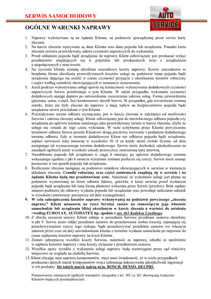 SERWIS SAMOCHODOWY OGÓLNE WARUNKI NAPRAWY 1. Naprawy wykonywane są na żądanie Klienta, na podstawie sporządzonej przez serwis karty zlecenia 2. Na karcie zlecenia wpisywane są dane Klienta oraz dane pojazdu lub urządzenia. Ponadto karta zlecenia zawiera przewidywany zakres czynności naprawczych do wykonania. 3. Przed oddaniem pojazdu bądź urządzenia do naprawy Klient zobowiązany jest przekazać wykaz przedmiotów znajdujących się w pojeździe lub przekazanych wraz z urządzeniem a niepołączonych z nimi trwale. 4. Na życzenie klienta zostaną określone szacunkowe koszty naprawy. Koszty szacunkowe to bezpłatna forma określenia przewidywanych kosztów usługi na podstawie stanu pojazdu bądź urządzenia dającego się ustalić w czasie czynności przyjęcia z określeniem kosztów robocizny i części według cenników obowiązujących w momencie oszacowania. 5. Jeżeli podczas wykonywania usługi ujawni się konieczność wykonywania dodatkowych czynności naprawczych Serwis poinformuje o tym Klienta. W takim przypadku wykonanie czynności dodatkowych nastąpi dopiero po zatwierdzeniu rozszerzenia zakresu usług. Formę zatwierdzenia (pisemna, ustna, e-mail, fax) każdorazowo określi Serwis. W przypadku, gdy stwierdzone zostaną usterki, które nie były zlecone do naprawy a mają wpływ na bezpieczeństwo pojazdu bądź urządzenia serwis powiadomi o tym Klienta. 6. Przewidywany termin odbioru wyznaczony jest w karcie zlecenia w zależności od możliwości Serwisu i zakresu zleconej usługi. Klient zobowiązany jest do niezwłocznego odbioru pojazdu czy urządzenia po upływie terminu ustalonego jako przewidywany termin w karcie zlecenia, chyba że usługa nie została do tego czasu wykonana. W razie uchybienia przez Klienta powyższemu terminowi odbioru Serwis prześle Klientowi drogą pocztową wezwanie z podaniem dodatkowego terminu odbioru. Gdy w terminie dodatkowym Klient nie odbierze pojazdu bądź urządzenia, zapłaci serwisowi karę umowną w wysokości 30 zł za każdy dzień zwłoki liczony od dnia następnego od wyznaczonego terminu dodatkowego. Serwis może dochodzić odszkodowania na zasadach ogólnych jeżeli wysokość szkody przewyższy zastrzeżoną karę umowną. 7. Nieodebranie pojazdu lub urządzenia w ciągu 6 miesięcy po upływie dodatkowego terminu wskazanego zgodnie z pkt 6 oznacza wyrażenie zamiaru pozbycia się rzeczy. Serwis może usunąć porzucone w ten sposób pojazdy lub urządzenia. 8. Rozliczenie zlecenia następuje na podstawie cenników obowiązujących w serwisie w momencie składania zlecenia. Cenniki robocizny oraz części zamiennych znajdują się w serwisie i na żądanie Klienta będą mu przedstawione ceny. Należność za wykonanie usługi jest płatna na podstawie wystawionej na dzień odbioru faktury, gotówką w kasie serwisu przed wydaniem pojazdu bądź urządzenia lub inną formą płatności wskazana przez Serwis (przelew). Brak zapłaty stanowi podstawę do odmowy wydania pojazdu lub urządzenia oraz powoduje naliczanie odsetek w wysokości ustawowej- począwszy od dnia wymagalności. 9. W celu zabezpieczenia kosztów naprawy wykonywanej na podstawie powyższego „zlecenia naprawy” Klient ustanawia na rzecz Serwisu zastaw na stanowiącym jego własność samochodzie lub urządzeniu bliżej określonym w karcie zlecenia o wartości do ustalenia =według EUROTAX, AUTODATEX itp. zgodnie z art. 461 Kodeksu Cywilnego. 10. Z chwilą zawarcia umowy Klient oddaje w posiadanie Serwisu przedmiot zastawu określony w pkt 9. Serwis może oddać przedmiot zastawu do przechowania osobie trzeciej, zajmującej się przechowywaniem rzeczy tego rodzaju, bądź przechowywać przedmiot zastawu we własnym zakresie przez czas od daty zawiadomienia klienta o terminie wydania samochodu po naprawie do czasu zapłacenia kosztów naprawy na koszt Klienta. 11. Zastaw zabezpiecza wszelkie koszty Serwisu, należność za naprawę, odsetki za opóźnienie w zapłacie kosztów naprawy i inne koszty związane z przedmiotem zastawu. 12. Wszelkie spory wynikłe z wykonania usługi naprawy będą rozstrzygane przez sąd właściwy miejscowo ze względu na siedzibę Serwisu. 13. Klient zlecając nam naprawę komponentów, musi mieć świadomość, że w wielu przypadkach producenci danych marek komponentów wręcz zabraniają dokonywania jakiejkolwiek ingerencji w ich produkty. Do takich marek należą m.in. BOSCH, DENSO, DELPHI. Postanowienia, niniejszych ogólnych warunków, niezgodne z art. 385 i.n. KC obowiązują wyłącznie Klientów będących przedsiębiorcami.
