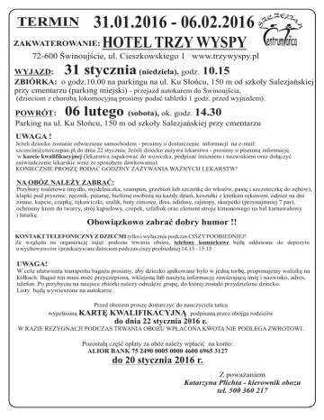 TERMIN 31.01.2016 - 06.02.2016 ZAKWATEROWANIE: HOTEL TRZY WYSPY 72-600 Świnoujście, ul. Cieszkowskiego 1 www.trzywyspy.pl 31 stycznia WYJAZD: (niedziela), godz. 10.15 ZBIÓRKA: o godz.10.00 na parkingu na ul. Ku Słońcu, 150 m od szkoły Salezjańskiej przy cmentarzu (parking miejski) - przejazd autokarem do Świnoujścia, (dzieciom z chorobą lokomocyjną prosimy podać tabletki 1 godz. przed wyjazdem). 06 lutego POWRÓT: (sobota), ok. godz. 14.30 Parking na ul. Ku Słońcu, 150 m od szkoły Salezjańskiej przy cmentarzu UWAGA ! Jeżeli dziecko zostanie odwiezione samochodem - prosimy o dostarczenie informacji na e-mail: [email protected] do dnia 22 stycznia. Jeżeli dziecko zażywa lekarstwa - prosimy o pisemną informację w karcie kwalifikacyjnej (lekarstwa zapakować do woreczka, podpisać imieniem i nazwiskiem oraz dołączyć zaświadczenie lekarskie wraz ze sposobem dawkowania). KONIECZNIE PROSZĘ PODAĆ GODZINY ZAŻYWANIA WAŻNYCH LEKARSTW! NA OBÓZ NALEŻY ZABRAĆ: Przybory toaletowe (mydło, mydelniczka, szampon, grzebień lub szczotkę do włosów, pastę i szczoteczkę do zębów), klapki pod prysznic, ręcznik, piżamę, bieliznę osobistą na każdy dzień, koszulki z krótkim rękawem, odzież na dni zimne, kapcie, czapkę, rękawiczki, szalik, buty zimowe, dres, adidasy, rajstopy, skarpetki (przynajmniej 7 par), ochronny krem do twarzy, strój kąpielowy, czepek, szlafrok oraz element stroju kimonowego na bal karnawałowy i latarkę. Obowiązkowo zabrać dobry humor !! KONTAKT TELEFONICZNY Z DZIEĆMI tylko i wyłącznie podczas CISZY POOBIEDNIEJ! Ze względu na organizację zajęć podczas trwania obozu, telefony komórkowe będą oddawane do depozytu u wychowawców i przekazywane dzieciom podczas ciszy poobiedniej 14.15 - 15.15 UWAGA! W celu ułatwienia transportu bagażu prosimy, aby dziecko spakowane było w jedną torbę, proponujemy walizkę na kółkach. Bagaż ten musi mieć przyczepioną, wklejoną lub naszytą informację zawierającą imię i nazwisko, adres, telefon. Po przybyciu na miejsce zbiórki należy odnaleźć grupę, do której zostało przydzielone dziecko. Listy będą wywieszone na autokarze. Przed obozem proszę dostarczyć do nauczyciela tańca wypełnioną KARTĘ KWALIFIKACYJNĄ podpisaną przez obojga rodziców do dnia 22 stycznia 2016 r. W RAZIE REZYGNACJI PODCZAS TRWANIA OBOZU WPŁACONA KWOTA NIE PODLEGA ZWROTOWI. Pozostałą część opłaty za obóz należy wpłacić na konto: ALIOR BANK 75 2490 0005 0000 4600 6965 3127 do 20 stycznia 2016 r. Z poważaniem Katarzyna Plichta - kierownik obozu tel. 500 360 217
