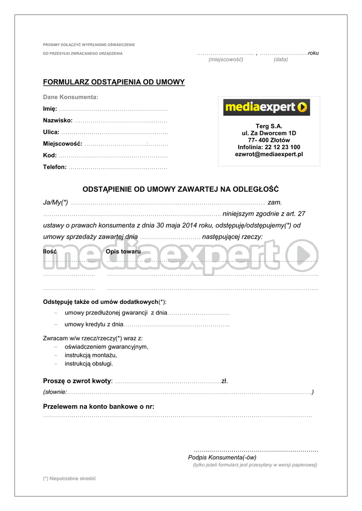 PROSIMY DOŁĄCZYĆ WYPEŁNIONE OŚWADCZENIE DO PRZESYŁKI ZWRACANEGO URZĄDZENIA ……………………….. , ……………………roku (miejscowość) (data) FORMULARZ ODSTĄPIENIA OD UMOWY Dane Konsumenta: Imię: ……………………………………………… Nazwisko: ………………………………………. Terg S.A. ul. Za Dworcem 1D 77- 400 Złotów Infolinia: 22 12 23 100 [email protected] Ulica: …………………………………………….. Miejscowość: ………………………….:………. Kod: ……………………………………………… Telefon: …………………………………………. ODSTĄPIENIE OD UMOWY ZAWARTEJ NA ODLEGŁOŚĆ Ja/My(*) ……………………………………………………………………………………. zam. ……………………………………………………………………………. niniejszym zgodnie z art. 27 ustawy o prawach konsumenta z dnia 30 maja 2014 roku, odstępuję/odstępujemy(*) od umowy sprzedaży zawartej dnia ………………………… następującej rzeczy: Ilość …………………….. Opis towaru ………………………………………………............................................................ …………………….. ………………………………………………………………….……………………….. …………………….. …………………………………………………………………………………………... Odstępuję także od umów dodatkowych(*): umowy przedłużonej gwarancji z dnia…………………………. umowy kredytu z dnia…………………………………………….. Zwracam w/w rzecz/rzeczy(*) wraz z: oświadczeniem gwarancyjnym, instrukcją montażu, instrukcją obsługi. Proszę o zwrot kwoty: ……………………………………………..zł. (słownie:………………………………………………………………………………………………………….) Przelewem na konto bankowe o nr: ……………………………………………………………………………………………………………………. ……..……………………………………………… Podpis Konsumenta(-ów) (tylko jeżeli formularz jest przesyłany w wersji papierowej) (*) Niepotrzebne skreślić