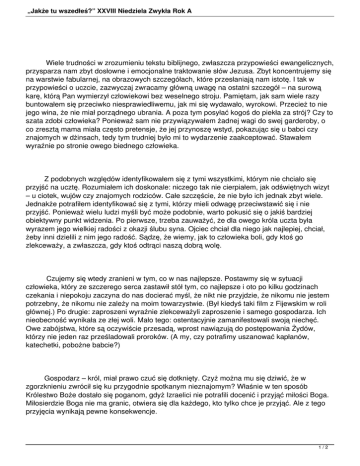 „Jakże tu wszedłeś?” XXVIII Niedziela Zwykła Rok A Wiele trudności w zrozumieniu tekstu biblijnego, zwłaszcza przypowieści ewangelicznych, przysparza nam zbyt dosłowne i emocjonalne traktowanie słów Jezusa. Zbyt koncentrujemy się na warstwie fabularnej, na obrazowych szczegółach, które przesłaniają nam istotę. I tak w przypowieści o uczcie, zazwyczaj zwracamy główną uwagę na ostatni szczegół – na surową karę, którą Pan wymierzył człowiekowi bez weselnego stroju. Pamiętam, jak sam wiele razy buntowałem się przeciwko niesprawiedliwemu, jak mi się wydawało, wyrokowi. Przecież to nie jego wina, że nie miał porządnego ubrania. A poza tym posyłać kogoś do piekła za strój? Czy to szata zdobi człowieka? Ponieważ sam nie przywiązywałem żadnej wagi do swej garderoby, o co zresztą mama miała często pretensje, że jej przynoszę wstyd, pokazując się u babci czy znajomych w dżinsach, tedy tym trudniej było mi to wydarzenie zaakceptować. Stawałem wyraźnie po stronie owego biednego człowieka. Z podobnych względów identyfikowałem się z tymi wszystkimi, którym nie chciało się przyjść na ucztę. Rozumiałem ich doskonale: niczego tak nie cierpiałem, jak odświętnych wizyt – u ciotek, wujów czy znajomych rodziców. Całe szczęście, że nie było ich jednak zbyt wiele. Jednakże potrafiłem identyfikować się z tymi, którzy mieli odwagę przeciwstawić się i nie przyjść. Ponieważ wielu ludzi myśli być może podobnie, warto pokusić się o jakiś bardziej obiektywny punkt widzenia. Po pierwsze, trzeba zauważyć, że dla owego króla uczta była wyrazem jego wielkiej radości z okazji ślubu syna. Ojciec chciał dla niego jak najlepiej, chciał, żeby inni dzielili z nim jego radość. Sądzę, że wiemy, jak to człowieka boli, gdy ktoś go zlekceważy, a zwłaszcza, gdy ktoś odtrąci naszą dobrą wolę. Czujemy się wtedy zranieni w tym, co w nas najlepsze. Postawmy się w sytuacji człowieka, który ze szczerego serca zastawił stół tym, co najlepsze i oto po kilku godzinach czekania i niepokoju zaczyna do nas docierać myśl, że nikt nie przyjdzie, że nikomu nie jestem potrzebny, że nikomu nie zależy na moim towarzystwie. (Był kiedyś taki film z Fijewskim w roli głównej.) Po drugie: zaproszeni wyraźnie zlekceważyli zaproszenie i samego gospodarza. Ich nieobecność wynikała ze złej woli. Mało tego: ostentacyjnie zamanifestowali swoją niechęć. Owe zabójstwa, które są oczywiście przesadą, wprost nawiązują do postępowania Żydów, którzy nie jeden raz prześladowali proroków. (A my, czy potrafimy uszanować kapłanów, katechetki, pobożne babcie?) Gospodarz – król, miał prawo czuć się dotknięty. Czyż można mu się dziwić, że w zgorzknieniu zwrócił się ku przygodnie spotkanym nieznajomym? Właśnie w ten sposób Królestwo Boże dostało się poganom, gdyż Izraelici nie potrafili docenić i przyjąć miłości Boga. Miłosierdzie Boga nie ma granic, otwiera się dla każdego, kto tylko chce je przyjąć. Ale z tego przyjęcia wynikają pewne konsekwencje. 1/2 „Jakże tu wszedłeś?” XXVIII Niedziela Zwykła Rok A Z inicjatywą – zaproszeniem, wychodzi co prawda Bóg, ale gdy to zaproszenie przyjmujemy, gdy odpowiadamy Bogu pozytywnie, gdy mówimy A – to musimy także powiedzieć B. I tu przychodzi miejsce i czas, aby wystarać się o odpowiedni i godny strój. Jego brak świadczy o duchowym niechlujstwie, o wymigiwaniu się, o niechęci w podejmowaniu konsekwencji, a przynajmniej w braniu na siebie odpowiedzialności. Jest to poważny grzech, grzech zaniedbania, i kto wie, czy nie jest to największa bolączka naszych czasów. I właśnie przed tym chce nas ochronić i przestrzec Chrystus: abyśmy nie przyjmowali nadaremno łaski Bożej, abyśmy nie zakopywali do ziemi darów Boga. Ks. Mariusz Pohl 2/2