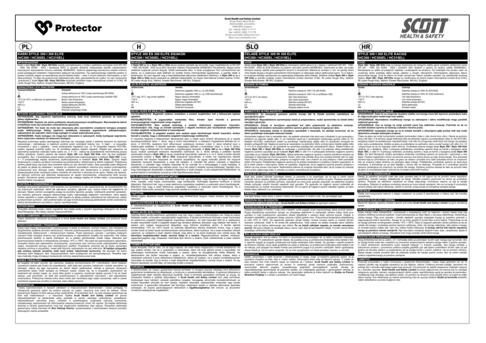 Scott Health and Safety Limited Pimbo Road, West Pimbo, Skelmersdale, Lancashire, WN8 9RA, England. Tel: +44 (0) 1695 711711 Fax: +44 (0) 1695 711775 E-mail: [email protected] Web: www.scottsafety.com A KASKI STYLE 300 I 300 ELITE (HC300 / HC300EL / HC315EL) STYLE 300 ÉS 300 ELITE SISAKOK (HC300 / HC300EL / HC315EL) ČELADE STYLE 300 IN 300 ELITE (HC300 / HC300EL / HC315EL) STYLE 300 I 300 ELITE KACIGE (HC300 / HC300EL / HC315EL) WPROWADZENIE BEVEZETÉS UVOD UVOD Kaski z serii Style 300 i Style 300 Elite zostały zaprojektowane z myślą o spełnieniu wymogów norm EN 397 : 1995, EN 50365 : 2002 i dyrektywy EWG w sprawie zbliżenia ustawodastw państw członkowskich dotyczących wyposażenia ochrony osobistej, 89/686/EEC. Kaski te zapewniają wyznaczony stopień ochrony przed spadającymi obiektami i fragmentami walących się budynków. Typ zastosowanego materiału podano w postaci symbolu zegara na wewnętrznej stronie daszka kasku – wraz z innymi istotnymi informacjami, w tym datą produkcji. Ta data nie powinna być traktowana jako data „wprowadzenia do użytku” (w celu oznaczenia „żywotności”). Kaski Style 300 i Style 300 Elite otrzymały certyfikat Inspec International Limited (nr 0194), 56 Leslie Hough Way, Salford, Greater Manchester, M6 6AJ, England. A Style 300-as és a Style 300-as Elite típusú sisakok szériáját úgy tervezték, hogy megfeleljenek az EN 397 : 1995, EN 50365 : 2002 és az EEC Személyi Védelmi Felszerelések 89/686/EEC Irányelvének. Magas szintű védelmet nyújtanak zuhanó tárgyak, ledőlő szerkezetek ellen. A sisak anyagtípusa "óra" szimbólummal van jelölve, ez a sisakcsúcs alatt található és további fontos információkkal egyetemben, a gyártás idejét is tartalmazza. Ez nem egyezik meg a használatbavételi dátummal (élettartami célokhoz). A Style 300-as és a Style 300-as Elite típusú sisakokat az alábbiak hitelesítették: by Inspec International Limited (száma: 0194), 56 Leslie Hough Way, Salford, Greater Manchester, M6 6AJ, England. Serija čelad Style 300 in Style 300 Elite je namenjena zaščiti glave in je v skladu z zahtevami EN 397 : 1995, EN 50365 : 2002 ter EGS Direktivo za osebno varovalno opremo 89/686/EEC. Zasnovane so tako, da nudijo določeno stopnjo zaščite pred padajočimi stvarmi in strukturami. Material je naveden z ‘uro’ na spodnji strani vrha čelade skupaj z drugimi pomembnimi informacijami, ki vključujejo datum oblikovanja lupine. To ni datum, ki označuje obdobje uporabnosti (za ugotavljanje življenjske dobe čelade). Zaščitne čelade Style 300 in Style 300 Elite je potrdilo podjetje Inspec International Limited (Number 0194), 56 Leslie Hough Way, Salford, Greater Manchester, M6 6AJ, England. Style 300 i Style 300 Elite linije su kaciga dizajnirane da omoguće zaštitu glave sukladno zahtjevima normi EN 397 : 1995, EN 50365 : 2002 i sukladno EEC direktivi o opremi za osobnu zaštitu 89/686/EEC. Namijenjene su zaštiti od padajućih objekata i urušavajućih se struktura. Tip materijala ima oznaku ‘sata’ na unutarnjoj strani prednjeg dijela kacige zajedno s drugim relevantnim informacijama uključujući datum proizvodnje kacige. Ovaj se datum ne smije uzimati kao ‘datum početka uporabe’ (za određivanje životnog vijeka). Style 300 i Style 300 Elite kacige su certificirane od strane Inspec International Limited (broj 0194), 56 Leslie Hough Way, Salford, Greater Manchester, M6 6AJ, England. OZNACZENIA I ICH ZNACZENIE JELÖLÉSEK ÉS JELENTÉSÜK OZNAKE IN POMENI OZNAKE I NJIHOVO ZNAČENJE Jelölés/Címke Oznaczenie/Etykieta Znaczenie -20°C lub -30°C, w zależności od zastosowania +150°C 440V a.c. LD MM Izolacja elektryczna do 1000 V prądu przemiennego (EN 50365) Izolacja elektryczna do 1000 V prądu przemiennego (certyfikat VDE) Bardzo niska temperatura Bardzo wysoka temperatura Izolacja elektryczna (EN 397) Odkształcenie boczne Rozpryski roztopionego metalu SPOSÓB ZAKŁADANIA I REGULACJA OSTRZEŻENIE: Aby zapewnić odpowiednią ochronę, kask musi dokładnie pasować do wielkości głowy użytkownika. OSTRZEŻENIE: Kasków nie wolno poddawać nieautoryzowanym modyfikacjom. Wprowadzenie takich modyfikacji może być powodem unieważnienia gwarancji. OSTRZEŻENIE: Ten kask nie może być stosowany jako samodzielne urządzenie izolujące przepływ prądu elektrycznego. Należy zapewnić dodatkowe izolacyjne wyposażenie zabezpieczające, odpowiednie do zagrożeń, które mogą wystąpić w czasie wykonywanej pracy. OSTRZEŻENIE: Kaski izolujące nie mogą być stosowane w sytuacjach, kiedy występuje zagrożenie, które częściowo redukuje ich własności izolujące. Regulacji poziomego paska zapinającego dokonuje się, wsuwając pasek z wieloma otworami do elementu nasuwanego i zatrzaskując w żądanym punkcie przez wciśnięcie bolców (rys. 1) bądź – w przypadku korzystania z opcji z zapadką – przez przekręcanie regulatora (rys. 2). W przypadku kasków HC315EL system regulacji przód/tył (patrz rys. 6) umożliwia większy stopień regulacji. Więźba jest ustawiona na optymalnej wysokości wewnątrz kasku (patrz rys. 3, 4 i 5) – zaleca się pozostawienie niezmienionej pozycji kołków położenia. System pasków dla kasków Style 300 oraz Style 300 Elite różni się pod względem szczegółów. Rys. 3 przedstawia zespół więźby polietylenowej (wykorzystywany w kaskach Style 300), a rys. 4 i 5 przedstawiają więźbę terylenową (wykorzystywaną w kaskach Style 300 Elite). Zespoły więźb terylenowych o sześciu punktach mocowania są produkowane i dostarczane w dwóch częściach. Pojedynczy osobny pasek łączy się przez dwa centralne otwory po obu stronach kasku. Dwa pozostałe paski dołączone do paska na głowę są ustawiane i wciskane do czterech pozostałych otworów przy opasce przeciwpotnej, umieszczonej przy skorupie kasku. Więźba polietylenowa jest dostarczana w postaci złożonej i jest dopasowywana przez wciśnięcie sześciu zac
