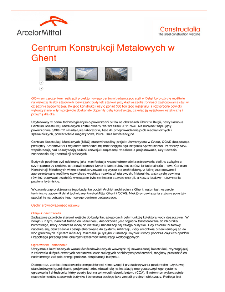 Centrum Konstrukcji Metalowych w Ghent Głównym założeniem realizacji projektu nowego centrum badawczego stali w Belgii było użycie możliwie największej liczby stalowych rozwiązań: budynek stanowi przykład wszechstronności zastosowania stali w dziedzinie budownictwa. Do jego konstrukcji użyto ponad 300 ton tego materiału, a różnorodne powłoki wykorzystane w tym projekcie doskonale dopełniły całą konstrukcję, czyniąc ją wyjątkowo estetyczną i przejmą dla oka. Usytuowany w parku technologicznym o powierzchni 52 ha na obrzeżach Ghent w Belgii, nowy kampus Centrum Konstrukcji Metalowych został otwarty we wrześniu 2011 roku. Na budynek zajmujący powierzchnię 8,300 m2 składają się laboratoria, hale do przeprowadzania prób mechanicznych i spawalniczych, powierzchnie magazynowe, biura i sale konferencyjne. Centrum Konstrukcji Metalowych (MSC) stanowi wspólny projekt Uniwersytetu w Ghent, OCAS (kooperacja pomiędzy ArcelorMittal i regionem flamandzkim) oraz belgijskiego Instytutu Spawalnictwa. Partnerzy MSC współpracują nad koordynacją badań i rozwoju kompetencji w zakresie projektowania, użytkowania i zachowania się konstrukcji stalowych. Budynek powinien być odbierany jako manifestacja wszechstronności zastosowania stali, w związku z czym partnerzy projektu ustanowili surowe kryteria konstrukcyjne: oprócz funkcjonalności, nowe Centrum Konstrukcji Metalowych winno charakteryzować się wyrazistą architekturą, w której zastosowano i zaprezentowano możliwie największy wachlarz rozwiązań stalowych. Naturalnie, ważną rolę powinna również odgrywać trwałość: wymagane było minimalne zużycie energii, a koszty budowy i utrzymania powinny być niskie. Wyzwanie zaprojektowania tego budynku podjęli Archipl architecten z Ghent, natomiast wsparcie techniczne zapewnił dział techniczny ArcelorMittal Ghent i OCAS. Niektóre rozwiązania stalowe powstały specjalnie na potrzeby tego nowego centrum badawczego. Cechy zrównoważonego rozwoju Odzysk deszczówki Zadaszone przejście stanowi wejście do budynku, a jego dach pełni funkcję kolektora wody deszczowej. W związku z tym, zamiast trafiać do kanalizacji, deszczówka jest najpierw transferowana do zbiornika buforowego, który dostarcza wodę do instalacji kanalizacyjnej całego budynku. Gdy zbiornik buforowy napełnia się, deszczówka zostaje skierowana do systemu infiltracji, który umożliwia przenikanie jej aż do wód gruntowych. System infiltracji minimalizuje ryzyko kumulacji i wycieku wody podczas ciężkich opadów i zapobiega przeciążeniu lokalnych systemów kanalizacji wodociągowych. Ogrzewanie i chłodzenie Utrzymanie komfortowych warunków środowiskowych wewnątrz tej nowoczesnej konstrukcji, wymagającej z założenia dużych otwartych przestrzeni oraz rozległych oszklonych powierzchni, mogłoby prowadzić do nadmiernego zużycia energii podczas eksploatacji budynku. Dlatego też, zamiast instalowania energochłonnej klimatyzacji i przeładowywania powierzchni użytkowej standardowymi grzejnikami, projektanci zdecydowali się na instalację energooszczędnego systemu ogrzewania i chłodzenia, który oparty jest na aktywacji rdzenia betonu (CCA). System ten wykorzystuje masę elementów stalowych budynku i betonową podłogę jako zespół grzejny i chłodzący. Podłoga jest podgrzewana lub chłodzona za pomocą wody, która krąży w płycie. W ten sposób płyta ogrzewa lub schładza powietrze, przez co zostaje osiągnięta stała, optymalna temperatura wewnątrz budynku. Funkcjonalność i estetyka: Rozwiązania stalowe Hol wejściowy odsłania szkielet konstrukcyjny budynku, z widocznymi kolumnami w kształcie litery H i wzmocnieniami; ten koncept konstrukcyjny powtarza się w architekturze całego budynku. Platerowanie centralnej fasady stalą kortenową ArcelorMittal można również zauważyć w biurach, salach konferencyjnych i laboratoriach, co stanowi doskonałe uzupełnienie całej konstrukcji i oddaje charakter budynku. Na potrzeby elewacji został opracowany unikalny system zawieszenia: znany jako Cassettes MD (Coques MD). System ten składa się z wykonanych na zamówienie płaskich paneli Indaten© ze złączem przegubowym. Każdy panel jest montowany do dodatkowej konstrukcji, a pomiędzy każdym z nich pozostaje wpust. Deszczówka spadająca na panele zostaje skierowana do wpustu i odprowadzona poza ścianę. W przeciwieństwie do innych instalacji, stal kortenowa na tej elewacji nie została poddana obróbce wstępnej służącej przyspieszeniu procesu starzenia. Zamiast tego stal zyskuje swój charakterystyczny rdzawy kolor w sposób naturalny. Począwszy od bardzo jasnego koloru, z biegiem lat Indaten© zacznie ciemnieć wskutek tworzenia się ochronnej warstwy tlenku. Pozostałe budynki (laboratorium, hale do przeprowadzania prób spawalniczych i mechanicznych) również wykorzystują rozwiązania stalowe. Do wykonania elewacji zastosowano płyty warstwowe Isofran z blachy Aluzinc©. Dzięki białym i srebrzystym drobinkom, błyszczą one w słońcu, tworząc przy tym dynamiczną i harmonijną okładzinę. Na pozostałych fragmentach elewacji zastosowano blachy trapezowe (Hacierba 5.200.50 i 90.500). W konstrukcji dachu wykorzystano dachowe blachy konstrukcyjne, natomiast do wykonania stropu użyto stropu zespolonego Cofraplus. Wszystkie zastosowane rozwiązania dostarczył ArcelorMittal. Recepcja o owalnym kształcie jest pokryta platerowaną stalą xcelcolour© z nowej gamy powłok xcelcoat© produkcji ArcelorMittal. xcelcoat© powstaje przy kontakcie określonej chropowatości powierzchni z cienką estetyczną i ochronną powłoką organiczną. W przypadku xcelcolour© chropowatość osiąga się przy użyciu technologii teksturowania wiązką elektronową (EBT). Podczas tego procesu w powierzchnie walców stosowanych do wykończenia stali wtapiane są małe kratery, które tworzą lekko teksturowaną powierzchnię. xcelcolour© jest również sto