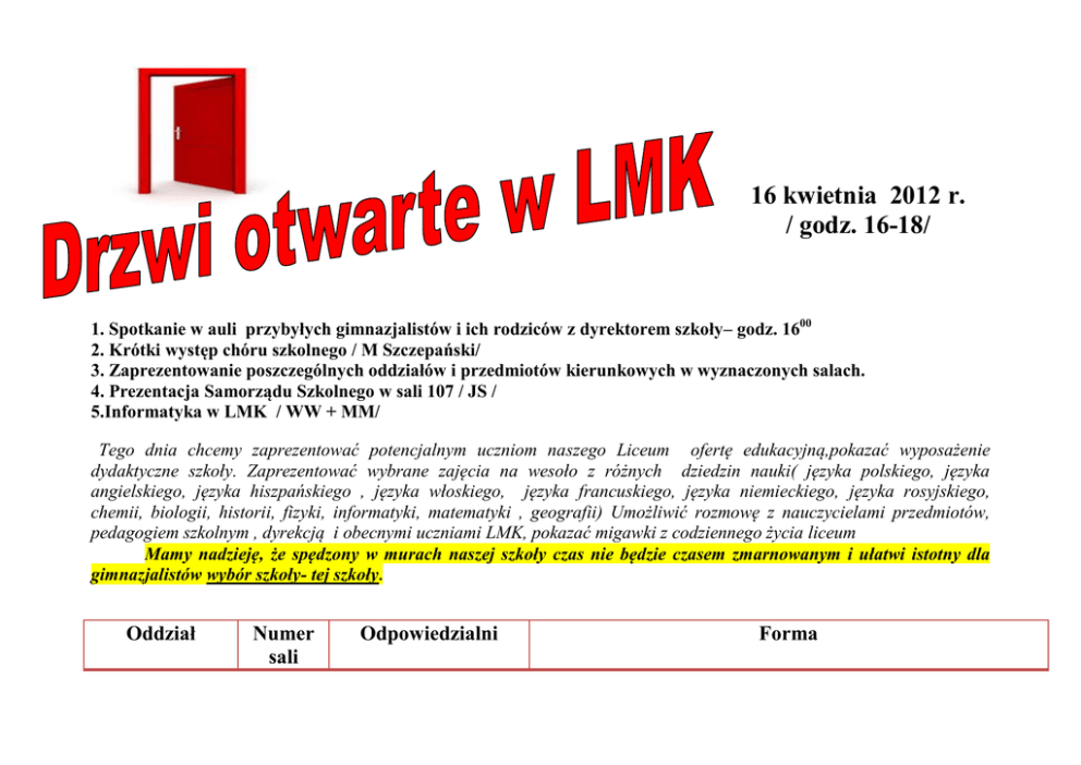 16 kwietnia 2012 r. / godz. 16-18/ 1. Spotkanie w auli przybyłych gimnazjalistów i ich rodziców z dyrektorem szkoły– godz. 1600 2. Krótki występ chóru szkolnego / M Szczepański/ 3. Zaprezentowanie poszczególnych oddziałów i przedmiotów kierunkowych w wyznaczonych salach. 4. Prezentacja Samorządu Szkolnego w sali 107 / JS / 5.Informatyka w LMK / WW + MM/ Tego dnia chcemy zaprezentować potencjalnym uczniom naszego Liceum ofertę edukacyjną,pokazać wyposażenie dydaktyczne szkoły. Zaprezentować wybrane zajęcia na wesoło z różnych dziedzin nauki( języka polskiego, języka angielskiego, języka hiszpańskiego , języka włoskiego, języka francuskiego, języka niemieckiego, języka rosyjskiego, chemii, biologii, historii, fizyki, informatyki, matematyki , geografii) Umożliwić rozmowę z nauczycielami przedmiotów, pedagogiem szkolnym , dyrekcją i obecnymi uczniami LMK, pokazać migawki z codziennego życia liceum Mamy nadzieję, że spędzony w murach naszej szkoły czas nie będzie czasem zmarnowanym i ułatwi istotny dla gimnazjalistów wybór szkoły- tej szkoły. Oddział Numer sali Odpowiedzialni Forma I a,b (matematyka) I a,b (fizyka) 206 I a,b,c, (j. angielski) 05 I a,b,c, (j. angielski) 202 I c (geografia) Ic (matematyka I d (biologia) 310 I d (chemia) 311 I e, f, g (j. polski) I e,f (j. hiszpański) I e, f g (historia) 203 208 303 110 205 K. Rutkowska G.Kurant G. Wasilewicz K. Skierska J. Kijewska, I. Wrzecionkowski A. Modeńska B. Kucharska M. Mróz E. Milewska E. Trzmielewska A. Kwiatkowska M. Urbaczewska D. Tomczak A. Król I. Michalska A. Kosman M. Zbonikowska K. Sobczak A. Andler E. Bordon M. Przepiórska D. Łoboda M. Kłobukowski B.Stasiak A. Kołosowska Wystawa podręczników, zbiorów zadań, konkursów. Ciekawostki matematyczne, prezentacja profilu Pokaz multimedialny. Wystawa podręczników, materiałów do nauczania języka angielskiego Projekty :„ Teen TV” , + …… Prezentacja na temat FAIR TRADE Prezentacja nachylenia, prezentacja multimedialna; ekspozycja preparatów biologicznych Pokazy chemiczne. Podręczniki do nauki chemii. Wystawa prac , podręczników , zdjęć. Pokaz multimedialny Dlaczego warto uczyć się języka hiszpańskiego? Prezentacja multimedialna Kuchnia polowa/ grochówka/ Sprawdź się sam – rebusy historyczne j.francuski j. włoski I e, f (wos) 109 106 104 I g (j. niemiecki) 111 Jezyk rosyjski 108 Samorząd Uczniowski Wychowanie fizyczne 107 Biblioteka hall S. Szarzyńska A. Perlikowska M. Lichman W. Frydrychowska M. Fus K. Krzemińska Kawiarenka. „ Sous le ciel de Paris” Caffe da Alfredo. Degustacja wybranych potraw włoskich Wystaw podręczników, zdjęć polityków. Test z konstytucji Wystawa podręczników, plakatów z KNJ . Prezentacja multimedialna . Konkursy językowe dla zainteresowanych/ na wesoło/ Rosyjska ceremonia parzenia i picia herbaty; projekcja filmu E. Nieznańska ks. M. Naraziński J. Skoracka, Prezentacja B.Mularska - Henszel R. Lewiński, J. Chęś Osiągnięcia sportowe . Sekcje wychowania fizycznego. L. Dryńska T. Ulanowski B. Wiśniewski I. Kosińska Wszystko o naborze elektronicznym