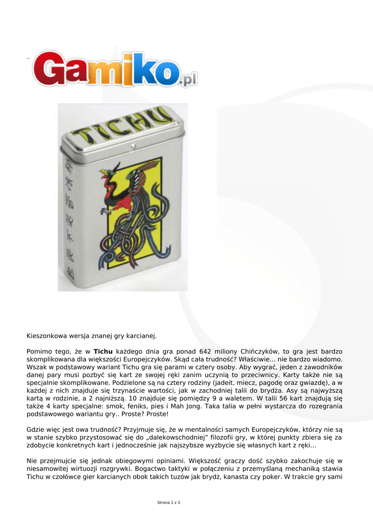Kieszonkowa wersja znanej gry karcianej. Pomimo tego, że w Tichu każdego dnia gra ponad 642 miliony Chińczyków, to gra jest bardzo skomplikowana dla większości Europejczyków. Skąd cała trudność? Właściwie… nie bardzo wiadomo. Wszak w podstawowy wariant Tichu gra się parami w cztery osoby. Aby wygrać, jeden z zawodników danej pary musi pozbyć się kart ze swojej ręki zanim uczynią to przeciwnicy. Karty także nie są specjalnie skomplikowane. Podzielone są na cztery rodziny (jadeit, miecz, pagodę oraz gwiazdę), a w każdej z nich znajduje się trzynaście wartości, jak w zachodniej talii do brydża. Asy są najwyższą kartą w rodzinie, a 2 najniższą. 10 znajduje się pomiędzy 9 a waletem. W talii 56 kart znajdują się także 4 karty specjalne: smok, feniks, pies i Mah Jong. Taka talia w pełni wystarcza do rozegrania podstawowego wariantu gry.. Proste? Proste! Gdzie więc jest owa trudność? Przyjmuje się, że w mentalności samych Europejczyków, którzy nie są w stanie szybko przystosować się do „dalekowschodniej” filozofii gry, w której punkty zbiera się za zdobycie konkretnych kart i jednocześnie jak najszybsze wyzbycie się własnych kart z ręki… Nie przejmujcie się jednak obiegowymi opiniami. Większość graczy dość szybko zakochuje się w niesamowitej wirtuozji rozgrywki. Bogactwo taktyki w połączeniu z przemyślaną mechaniką stawia Tichu w czołówce gier karcianych obok takich tuzów jak brydż, kanasta czy poker. W trakcie gry sami Strona 1 z 3 zapewne dostrzeżecie podobieństwa do tych i kilku innych tytułów. Prezentowana wersja gry pakowana jest w metalowe pudełko i zawiera zasady do 4 kompletnie różnych wariantów rozgrywki: 1. 2. 3. 4. Tichu nanjing (4 graczy) Trichu (3 graczy) Tichu tientsin (6 graczy) Szlachcic (Grandseigneur) (5-12 graczy) Zawartość pudełka: 56 kart instrukcja Wiek 10 + Liczba graczy 3 - 12 Czas gry ok. 60 minut Instrukcja polska Wydanie niemieckie Producent Strona 2 z 3 Abaccus Projektant Urs Hostettler Strona 3 z 3