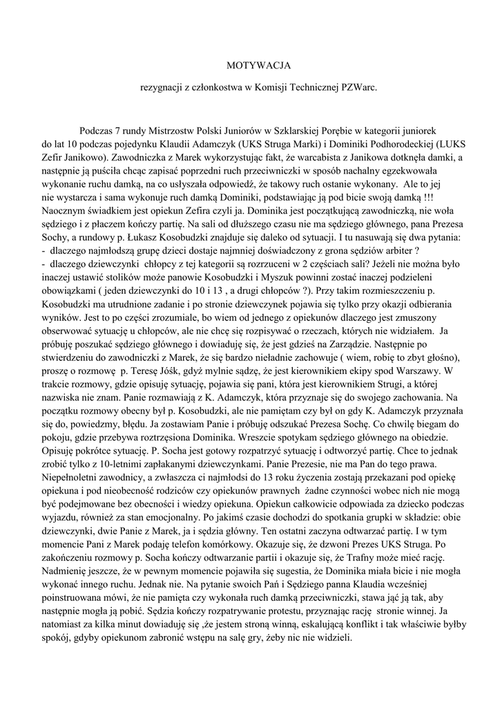 MOTYWACJA rezygnacji z członkostwa w Komisji Technicznej PZWarc. Podczas 7 rundy Mistrzostw Polski Juniorów w Szklarskiej Porębie w kategorii juniorek do lat 10 podczas pojedynku Klaudii Adamczyk (UKS Struga Marki) i Dominiki Podhorodeckiej (LUKS Zefir Janikowo). Zawodniczka z Marek wykorzystując fakt, że warcabista z Janikowa dotknęła damki, a następnie ją puściła chcąc zapisać poprzedni ruch przeciwniczki w sposób nachalny egzekwowała wykonanie ruchu damką, na co usłyszała odpowiedź, że takowy ruch ostanie wykonany. Ale to jej nie wystarcza i sama wykonuje ruch damką Dominiki, podstawiając ją pod bicie swoją damką !!! Naocznym świadkiem jest opiekun Zefira czyli ja. Dominika jest początkującą zawodniczką, nie woła sędziego i z płaczem kończy partię. Na sali od dłuższego czasu nie ma sędziego głównego, pana Prezesa Sochy, a rundowy p. Łukasz Kosobudzki znajduje się daleko od sytuacji. I tu nasuwają się dwa pytania: - dlaczego najmłodszą grupę dzieci dostaje najmniej doświadczony z grona sędziów arbiter ? - dlaczego dziewczynki chłopcy z tej kategorii są rozrzuceni w 2 częściach sali? Jeżeli nie można było inaczej ustawić stolików może panowie Kosobudzki i Myszuk powinni zostać inaczej podzieleni obowiązkami ( jeden dziewczynki do 10 i 13 , a drugi chłopców ?). Przy takim rozmieszczeniu p. Kosobudzki ma utrudnione zadanie i po stronie dziewczynek pojawia się tylko przy okazji odbierania wyników. Jest to po części zrozumiale, bo wiem od jednego z opiekunów dlaczego jest zmuszony obserwować sytuację u chłopców, ale nie chcę się rozpisywać o rzeczach, których nie widziałem. Ja próbuję poszukać sędziego głównego i dowiaduję się, że jest gdzieś na Zarządzie. Następnie po stwierdzeniu do zawodniczki z Marek, że się bardzo nieładnie zachowuje ( wiem, robię to zbyt głośno), proszę o rozmowę p. Teresę Jóśk, gdyż mylnie sądzę, że jest kierownikiem ekipy spod Warszawy. W trakcie rozmowy, gdzie opisuję sytuację, pojawia się pani, która jest kierownikiem Strugi, a której nazwiska nie znam. Panie rozmawiają z K. Adamczyk, która przyznaje się do swojego zachowania. Na początku rozmowy obecny był p. Kosobudzki, ale nie pamiętam czy był on gdy K. Adamczyk przyznała się do, powiedzmy, błędu. Ja zostawiam Panie i próbuję odszukać Prezesa Sochę. Co chwilę biegam do pokoju, gdzie przebywa roztrzęsiona Dominika. Wreszcie spotykam sędziego głównego na obiedzie. Opisuję pokrótce sytuację. P. Socha jest gotowy rozpatrzyć sytuację i odtworzyć partię. Chce to jednak zrobić tylko z 10-letnimi zapłakanymi dziewczynkami. Panie Prezesie, nie ma Pan do tego prawa. Niepełnoletni zawodnicy, a zwłaszcza ci najmłodsi do 13 roku życzenia zostają przekazani pod opiekę opiekuna i pod nieobecność rodziców czy opiekunów prawnych żadne czynności wobec nich nie mogą być podejmowane bez obecności i wiedzy opiekuna. Opiekun całkowicie odpowiada za dziecko podczas wyjazdu, również za stan emocjonalny. Po jakimś czasie dochodzi do spotkania grupki w składzie: obie dziewczynki, dwie Panie z Marek, ja i sędzia główny. Ten ostatni zaczyna odtwarzać partię. I w tym momencie Pani z Marek podaję telefon komórkowy. Okazuje się, że dzwoni Prezes UKS Struga. Po zakończeniu rozmowy p. Socha kończy odtwarzanie partii i okazuje się, że Trafny może mieć rację. Nadmienię jeszcze, że w pewnym momencie pojawiła się sugestia, że Dominika miała bicie i nie mogła wykonać innego ruchu. Jednak nie. Na pytanie swoich Pań i Sędziego panna Klaudia wcześniej poinstruowana mówi, że nie pamięta czy wykonała ruch damką przeciwniczki, stawa jąć ją tak, aby następnie mogła ją pobić. Sędzia kończy rozpatrywanie protestu, przyznając rację stronie winnej. Ja natomiast za kilka minut dowiaduję się ,że jestem stroną winną, eskalującą konflikt i tak właściwie byłby spokój, gdyby opiekunom zabronić wstępu na salę gry, żeby nic nie widzieli. Np. sytuacji z tej samej rundy, gdzie w juniorach 13 mój zawodnik grając 1 D i 1P przeciwko 1D i 2P zawodnika z Bielawy poddaje piona i wobec braku zgody przeciwnika na remis, prawidłowo podnosi rękę i prosi o o interwencję sędziego rundowego. Ja spokojny odchodzę dalej i po chwili stwierdzam, że zawodnicy grają dalej. Interweniuję u rundowego i po konsultacji z innym rundowym (główny był nieobecny) sędziowie przyznają rację mojemu zawodnikowi i ogłaszają regulaminowy remis – tu nie mam pretensji bo sprawa się wyjaśniła. Na szczęcie. Gdyby na sali gry byli tylko zawodnicy i sędziowie to po prostu by mi powiedziano, że Dominika się pomyliła i po sprawie. Zdaję sobie sprawę z uchybień formalnych z wszystkich trzech stron. Uważam jednak, że skutki incydentu byłyby najmniejsze, gdyby sędzia główny był na sali i sprawę rozstrzygnął natychmiast. Przecież w pierwszym momencie zawodniczka Strugi przyznała się do czynu. Moje największe wątpliwości budzą: - rozpatrywanie protestu z punktu, że to się wydarzyło wiedzą tylko dwie zawodniczki, bo był naoczny świadek, członek KT oraz KS, sędzia klasy I, człowiek podchodzący pod 50 i daleki od prób skrzywdzenie nieprawdziwym oświadczeniem zawodników. Już na odprawie nie znalazłem posłuchu, zauważając, że w niektórych kategoriach ilość rund jest niezgodna z zaleceniami KW - przyjęcie telefonu od Prezesa Strugi, który nie miał żadnej wiedzy w sprawie, gdyż nie był na miejscu, a w pokoju było więcej osób z Marek niż z Janikowa - brak próby konkretniejszego ustalenia przebiegu zdarzeń ze stroną z Marek, pomimo, że zachowanie zawodniczki wykroczyło poza ramy zwykłej pomyłki powstałej z emocji w ferworze walki, był tego naoczny świadek, a osoby zainteresowane to 10 letnie dzieci - postawa Pań z Marek, każących mi użalać się nad płaczącą ich zawodniczką, a ignorowanie stanu mojej zawodniczki, k
