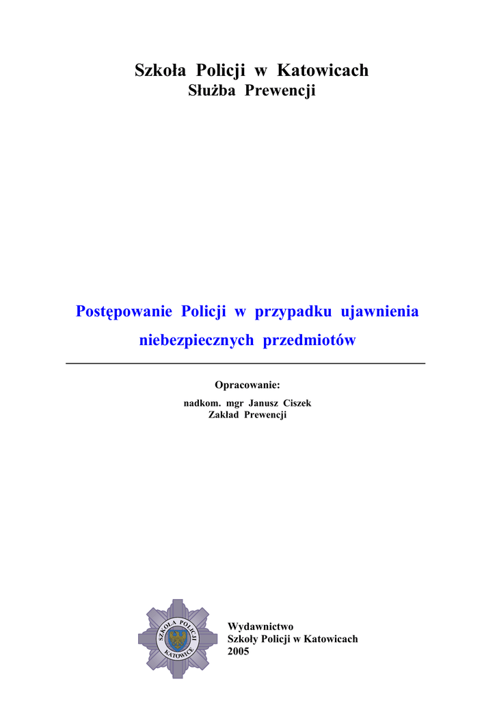 Szkoła Policji w Katowicach Służba Prewencji Postępowanie Policji w przypadku ujawnienia niebezpiecznych przedmiotów Opracowanie: ŁA PO O C JI LI SZK nadkom. mgr Janusz Ciszek Zakład Prewencji Wydawnictwo Szkoły Policji w Katowicach 2005 2 3 Spis treści 1. Wstęp 5 2. Postępowanie w przypadku zagrożenia bioterroryzmem 6 2.1. Procedura profilaktycznego postępowania w przypadku otrzymania przesyłki niewiadomego pochodzenia 2.2. Procedura profilaktycznego postępowania policjantów w przypadku wystąpienia zdarzeń związanych z bioterroryzmem 3. Postępowanie w przypadku zagrożenia katastrofą w ruchu lądowym 3.1. Procedura postępowania w przypadku zdarzenia z niebezpiecznymi substancjami chemicznymi 4. Postępowanie z niewybuchami i urządzeniami wybuchowymi 4.1. Procedura postępowania Policji po uzyskaniu informacji o podłożeniu materiałów i urządzeń wybuchowych 4.2. Procedura postępowania administratorów obiektów po uzyskaniu informacji o podłożeniu ładunków wybuchowych 6 7 8 9 10 11 12 5. Podsumowanie 14 Załączniki 16 Przepisy 19 4 5 1. Wstęp Policjanci wykonujący czynności patrolowo - interwencyjne mogą się znaleźć w sytuacji nietypowej, to znaczy takiej, która nie występuje często. Sytuacje te mogą stanowić zagrożenie dla życia lub zdrowia wielu ludzi, w tym również policjantów podejmujących prawem określone czynności. Zachowanie policjantów w tych sytuacjach jest określone szeregiem różnych aktów prawnych, wytycznych, pism. Zadaniem tej publikacji jest zebranie obowiązujący procedur dotyczących w szczególności przedmiotem lub zachowania się policjanta w zetknięciu się z niebezpiecznym sytuacją, w której występują niebezpieczne przedmioty. W opracowaniu tym ograniczam się w przede wszystkim do tych aspektów działania policjanta, które wpływają na bezpieczne wykonywanie czynności. Jednocześnie w przedmiotowej pracy zostały przedstawione procedury zachowania obywateli, których rozpowszechnianie wśród społeczeństwa jest również obowiązkiem Policji. 6 2. Postępowanie w przypadku zagrożenia bioterroryzmem Bioterroryzmem określa się zagrożenie wywołane atakiem terrorystycznym przy użyciu broni biologicznej. Obowiązujące przepisy dokonują podziału zadań i sfer odpowiedzialności poszczególnych organów i instytucji w zakresie przeciwdziałania skutkom tego ataku. W tym zakresie został również ściśle określony obszar działania Policji1, który będzie się odnosił do: 1. Przyjęcia zgłoszenia o wystąpieniu przypadku bioterroryzmu np. podłożony proszek. 2. Podjęcia działań polegających w szczególności na2: • izolacji i ochrony miejsca, obiektów i terenu, • pilotowaniu pojazdów, • asyście wykonujących zadania, • kontroli przestrzegania przez ludność wprowadzonych zarządzeń, • ustaleniu miejsca pobytu osób podejrzewanych o zakażenie lub kontakt. Równocześnie inne podmioty, każdy według swoich kompetencji, podejmują określone w procedurach działania. 2.1. Procedura profilaktycznego postępowania w przypadku otrzymania przesyłki niewiadomego pochodzenia 3 W przypadku otrzymania jakiejkolwiek przesyłki niewiadomego pochodzenia lub budzącej podejrzenia z jakiegokolwiek innego powodu np.: - brak nadawcy, - brak adresu nadawcy, - przesyłka pochodzi od nadawcy lub z miejsca, którego jej się nie spodziewamy należy: 1 Pismo Komendanta Głównego Policji G-II-2737/01 z dnia 18.10.2001r. w sprawie procedur działania w przypadku zagrożenia atakiem terrorystycznym. 2 Zarządzenie nr 36 Ministra Spraw Wewnętrznych z dnia 23.04.1970 r w sprawie współdziałania organów Milicji Obywatelskiej z organami społecznej służby zdrowia w zakresie zwalczania niektórych chorób zakaźnych, które stanowią szczególne zagrożenie dla zdrowia ludności. Dz. Urz. MSW nr 6 z dnia 25.06.1970. 3 Procedura przygotowana w formie ulotki przez Główny Inspektorat Sanitarny dla społeczeństwa. 7 1. Nie otwierać tej przesyłki. 2. Umieścić przesyłkę w grubym worku plastikowym, szczelnie zamknąć. 3. Worek ten należy umieścić w drugim grubym plastikowym worku, który należy szczelnie zamknąć: zawiązać supeł i zakleić taśmą klejącą. 4. Paczki nie należy przemieszczać. Należy pozostawić ją na miejscu. 5. Powiadomić Policję. Odpowiednie służby podejmą wszystkie niezbędne kroki w celu bezpiecznego przejęcia przesyłki. 4 W przypadku, gdy podejrzana przesyłka została otwarta i zawiera jakąkolwiek podejrzaną zawartość w formie stałej (pył, kawałki, blok, galaretę, pianę itp.) lub płynnej należy: 1. Możliwie nie naruszać tej zawartości: nie rozsypywać, nie przenosić, nie dotykać, nie wąchać, nie powodować ruchu powietrza w pomieszczeniu (wyłączyć systemy wentylacji i klimatyzacji, zamknąć okna). 2. Należy całą zawartość umieścić w worku plastikowym, zamknąć go i zakleić taśmą lub plastrem. 3. Należy dokładnie umyć ręce. 4. Zaklejony worek umieścić w drugim worku, zamknąć go i zakleić. 5. Ponownie dokładnie umyć ręce. 6. Bezzwłocznie powiadomić Policję i stosować się do wskazówek policjanta. 7. Po przybyciu właściwych służb należy bezwzględnie stosować się do ich zaleceń. 2.2. Procedura profilaktycznego postępowania Policjantów w przypadku wystąpienia zdarzeń związanych z bioterroryzmem5 1. Należy przyjąć zgłoszenie. 2. Przekazać wstępną informację do: 4 5 - Centrum Zarządzania Kryzysowego Wojewody, - Wojewódzkiej Stacji SANEPIDU, Załącznik nr 1 przedstawia podział kompetencji w przypadku ujawnienia podejrzanej przesyłki. Opracowanie Inspekcja Sanitarna MSWiA. 8 - Inspekcji Sanitarnej MSWiA, - Państwowej Straży Pożarnej. 3. W razie uzyskania wiadomości o potencjalnie zakaźnej przesyłce Policja przede wszystkim zabezpiecza miejsce składowania, oraz wyłącza je z użytkowania. 4. Policja nie wchodzi do tych pomieszczeń, ani nie styka się z ludźmi, którzy p