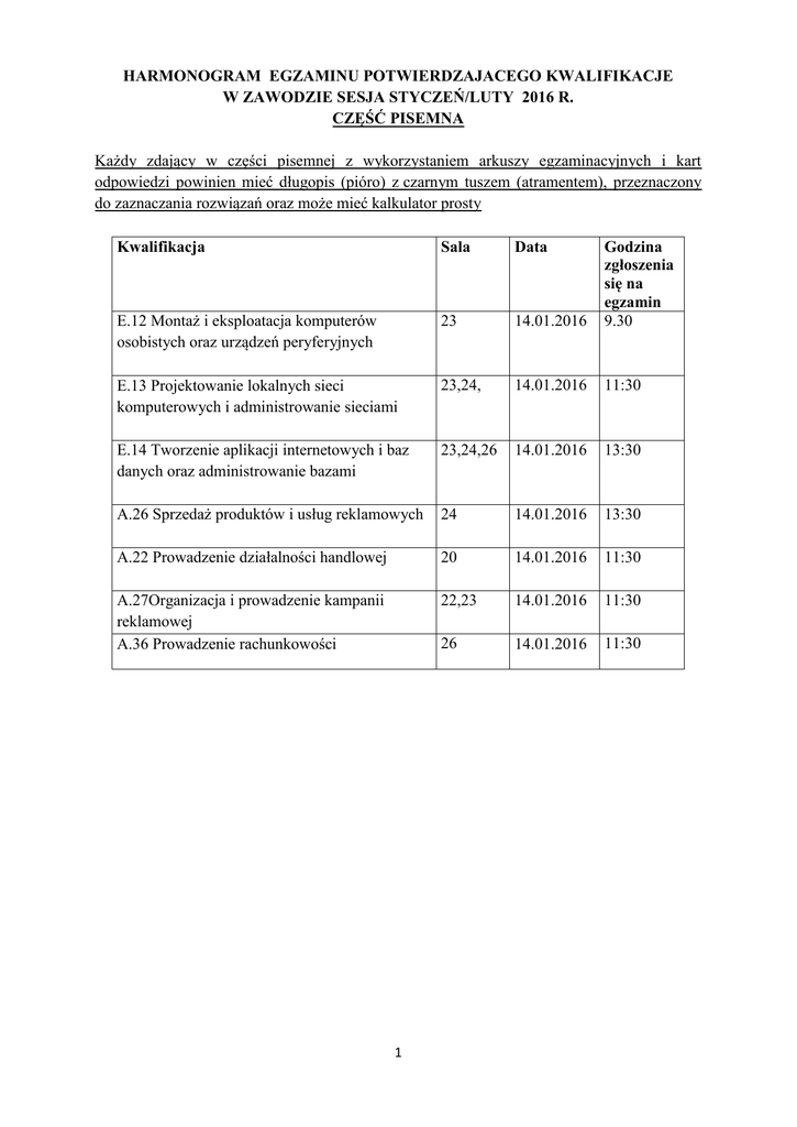 HARMONOGRAM EGZAMINU POTWIERDZAJACEGO KWALIFIKACJE W ZAWODZIE SESJA STYCZEŃ/LUTY 2016 R. CZĘŚĆ PISEMNA Każdy zdający w części pisemnej z wykorzystaniem arkuszy egzaminacyjnych i kart odpowiedzi powinien mieć długopis (pióro) z czarnym tuszem (atramentem), przeznaczony do zaznaczania rozwiązań oraz może mieć kalkulator prosty Kwalifikacja Sala Data E.12 Montaż i eksploatacja komputerów osobistych oraz urządzeń peryferyjnych 23 14.01.2016 Godzina zgłoszenia się na egzamin 9.30 E.13 Projektowanie lokalnych sieci komputerowych i administrowanie sieciami 23,24, 14.01.2016 11:30 E.14 Tworzenie aplikacji internetowych i baz danych oraz administrowanie bazami 23,24,26 14.01.2016 13:30 A.26 Sprzedaż produktów i usług reklamowych 24 14.01.2016 13:30 A.22 Prowadzenie działalności handlowej 20 14.01.2016 11:30 A.27Organizacja i prowadzenie kampanii reklamowej A.36 Prowadzenie rachunkowości 22,23 14.01.2016 11:30 26 14.01.2016 11:30 1 CZĘŚĆPRAKTYCZNA Kwalifikacja Sala 28.01.2016 Zdający przynosi na egzamin 7:30,11:30 XXXX 04.02.2016 7:30 XXXX Data 212 E.13 Projektowanie lokalnych sieci komputerowych i administrowanie sieciami 216,211,147,152, E.14 Tworzenie aplikacji internetowych i baz danych oraz administrowanie bazami Godzina A.22 Prowadzenie działalności handlowej 211,212 02.02.2016 8:30 kalkulator prosty A.27 Organizacja i prowadzenie kampanii reklamowej A.35 Planowanie i prowadzenie działalności w organizacji 147,205 02.02.2016 8:30 kalkulator prosty 152 02.02.2016 8:30 A.36 Prowadzenie rachunkowości 152,151 02.02.2016 8:30 kalkulator prosty, ołówek, gumka, temperówka kalkulator prosty 2