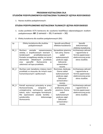 PROGRAM KSZTAŁCENIA DLA STUDIÓW PODYPLOMOWYCH KSZTAŁCENIA TŁUMACZY JĘZYKA ROSYJSKIEGO 1. Nazwa studiów podyplomowych: STUDIA PODYPLOMOWE KSZTAŁCENIA TŁUMACZY JĘZYKA ROSYJSKIEGO 1. Liczba punktów ECTS konieczna do uzyskania kwalifikacji odpowiadającym studiom podyplomowym: 60 (I semestr – 30; II semestr – 30) 2. Efekty kształcenia dla studiów podyplomowych (EK): Lp. EK_1 EK_2 EK_3 Efekty kształcenia dla studiów podyplomowych Sposób weryfikacji efektów kształcenia Słuchacz posiada zaawansowaną Sprawdzian pisemny wiedzę o współczesnych teoriach i lub ustny. Ocena tendencjach przekładoznawczych. zadań Posiada szczegółową wiedzę na temat wykonywanych elementów składowych przekładu podczas zajęć. oraz specyfiki tłumaczenia w Zaliczenie zależności od typu przekładu. semestralne i roczne. Słuchacz jest świadomy miejsca teorii Rozmowa, dyskusja. przekładu w stosunku do innych nauk Ocena zadań humanistycznych i społecznych. wykonywanych podczas zajęć. Zaliczenie semestralne i roczne. Potrafi wyznaczyć priorytety w pracy Sprawdzian tłumaczeniowej, związane z praktyczny, praca umiejętnością zachowania specyfiki pisemna. Ocena tekstu, stylu i wymogów formalnych. zadań Ma opanowane zasady korekty i wykonywanych autokorekty dokonanego podczas zajęć. tłumaczenia. Zaliczenie semestralne i roczne. Sposób dokumentacji efektów kształcenia Archiwizacja zaliczeń i egzaminów w formie papierowej i elektronicznej przez okres studiów. Archiwizacja zaliczeń i egzaminów w formie papierowej i elektronicznej przez okres studiów. Archiwizacja zaliczeń i egzaminów w formie papierowej i elektronicznej przez okres studiów. 1 EK_4 EK_5 Zna regulacje prawne dotyczące pracy tłumacza i wymogów stawianym tłumaczom. Sprawdzian pisemny lub ustny. Ocena zadań wykonywanych podczas zajęć. Zaliczenie semestralne i roczne. Zna rolę kultury w procesie Rozmowa, dyskusja komunikacji interpersonalnej oraz ma podczas zajęć opanowane umiejętności niezbędne dydaktycznych. do komunikowania się w zawodowych Ocena zadań i prywatnych kontaktach wykonywanych międzykulturowych. podczas zajęć. Zaliczenie semestralne i roczne. EK_6 Potrafi posługiwać się podstawowymi pojęciami prawnymi umożliwiającymi rozumienie specyfiki języka prawniczego i umiejętności tłumaczenia tego typu tekstów. EK_7 Słuchacz rozumie zasady prowadzenia procesu karnego i sądowego oraz funkcjonowanie organów procesowych. Potrafi umiejętnie posługiwać się podstawową siatką pojęciową postepowania karnego i procedury cywilnej podczas tłumaczenia. EK_8 Słuchacz ma uporządkowaną wiedze z zakresu terminologii uwzględniającej struktury językowe, charakterystyczne dla korespondencji handlowej. Archiwizacja zaliczeń i egzaminów w formie papierowej i elektronicznej przez okres studiów. Archiwizacja zaliczeń i egzaminów w formie papierowej i elektronicznej przez okres studiów. Sprawdzian pisemny Archiwizacja zaliczeń lub ustny. Ocena i egzaminów w zadań formie papierowej i wykonywanych elektronicznej przez podczas zajęć. okres studiów. Zaliczenie semestralne i roczne. Rozmowa i dyskusja Archiwizacja zaliczeń podczas zajęć i egzaminów w dydaktycznych. formie papierowej i Ocena zadań elektronicznej przez wykonywanych okres studiów. podczas zajęć. Zaliczenie semestralne i roczne. Sprawdzian pisemny Archiwizacja zaliczeń i ustny. Ocena zadań i egzaminów w wykonywanych formie papierowej i podczas zajęć. elektronicznej przez Zaliczenie okres studiów. semestralne i roczne. 2 EK_9 Zna uniwersalia, metodykę, techniki i błędy przekładu. EK_10 Posiada wyrobione umiejętności korzystania z korpusów językowych, baz danych i źródeł leksykograficznych. EK_11 Słuchacz ma uporządkowana wiedzę z zakresu terminologii uwzględniającej struktury językowe charakterystyczne dla aktów notarialnych. EK_12 Posługuje się podstawową i zaawansowaną terminologią w zakresie tłumaczeń tekstów technicznych z różnych dziedzin. EK_13 Swobodnie operuje językiem urzędowym oraz dokonuje tłumaczeń ustnych i pisemnych w kontaktach z policją, prokuratura i wymiarem sprawiedliwości. EK_14 Zna i stosuje podstawową i zaawansowaną terminologię w zakresie tłumaczeń informatycznych. Sprawdzian pisemny. Dyskusja. Ocena zadań wykonywanych podczas zajęć. Zaliczenie semestralne i roczne. Ocena zadań wykonywanych podczas zajęć oraz w domu. Zaliczenie semestralne i roczne. Sprawdzian pisemny i ustny. Ocena zadań wykonywanych podczas zajęć. Zaliczenie semestralne i roczne. Sprawdzian pisemny i ustny. Ocena zadań wykonywanych podczas zajęć. Zaliczenie semestralne i roczne. Dyskusja, rozmowa. Ocena zadań wykonywanych podczas zajęć. Zaliczenie semestralne i roczne. Ocena zadań wykonywanych podczas zajęć. Rozmowa podczas zajęć. Zaliczenie semestralne i roczne. Archiwizacja zaliczeń i egzaminów w formie papierowej i elektronicznej przez okres studiów. Archiwizacja zaliczeń i egzaminów w formie papierowej i elektronicznej przez okres studiów. Archiwizacja zaliczeń i egzaminów w formie papierowej i elektronicznej przez okres studiów. Archiwizacja zaliczeń i egzaminów w formie papierowej i elektronicznej przez okres studiów. Archiwizacja zaliczeń i egzaminów w formie papierowej i elektronicznej przez okres studiów. Archiwizacja zaliczeń i egzaminów w formie papierowej i elektronicznej przez okres studiów. 3 EK_15 Rozumie specyfikę tłumaczeń tekstów przekładanych synchronicznie i konsekutywnie. Zna techniki i normy tłumaczenia ustnego, adekwatne do określonych typów tekstów i sytuacji translacyjnych. EK_16 Słuchacz posiada podstawową wiedzę z zakresu technik doskonalenia pamięci. Posiada umiejętność wystąpień publicznych oraz zna techniki radzenia sobie ze stresem. EK_17 Słuchacz posiada wiedzę w zakresie funkcjonowania laboratorium językowego oraz potrafi sprawnie posługiwać się narzędziami tłumacza w labo