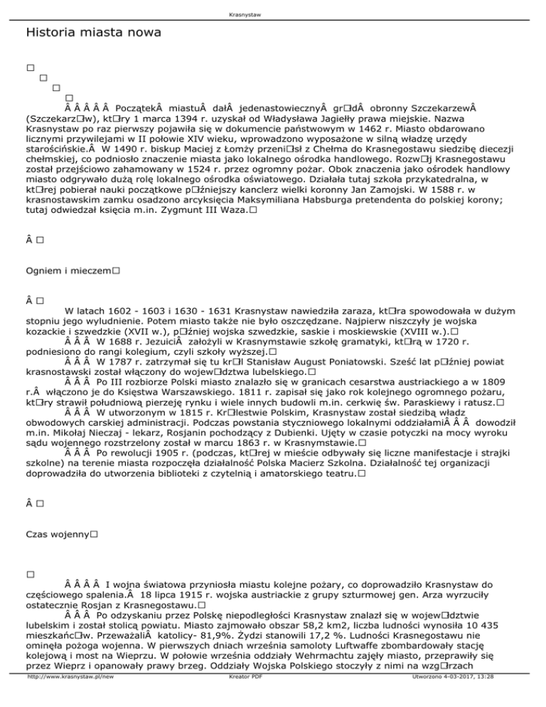 Krasnystaw Historia miasta nowa      Początek miastu dałÂ jedenastowieczny grÃłd obronny Szczekarzew (SzczekarzÃłw), ktÃłry 1 marca 1394 r. uzyskał od Władysława Jagiełły prawa miejskie. Nazwa Krasnystaw po raz pierwszy pojawiła się w dokumencie państwowym w 1462 r. Miasto obdarowano licznymi przywilejami w II połowie XIV wieku, wprowadzono wyposażone w silną władzę urzędy starościńskie. W 1490 r. biskup Maciej z Łomży przeniÃłsł z Chełma do Krasnegostawu siedzibę diecezji chełmskiej, co podniosło znaczenie miasta jako lokalnego ośrodka handlowego. RozwÃłj Krasnegostawu został przejściowo zahamowany w 1524 r. przez ogromny pożar. Obok znaczenia jako ośrodek handlowy miasto odgrywało dużą rolę lokalnego ośrodka oświatowego. Działała tutaj szkoła przykatedralna, w ktÃłrej pobierał nauki początkowe pÃłźniejszy kanclerz wielki koronny Jan Zamojski. W 1588 r. w krasnostawskim zamku osadzono arcyksięcia Maksymiliana Habsburga pretendenta do polskiej korony; tutaj odwiedzał księcia m.in. Zygmunt III Waza.  Ogniem i mieczem  W latach 1602 - 1603 i 1630 - 1631 Krasnystaw nawiedziła zaraza, ktÃłra spowodowała w dużym stopniu jego wyludnienie. Potem miasto także nie było oszczędzane. Najpierw niszczyły je wojska kozackie i szwedzkie (XVII w.), pÃłźniej wojska szwedzkie, saskie i moskiewskie (XVIII w.).    W 1688 r. Jezuici założyli w Krasnymstawie szkołę gramatyki, ktÃłrą w 1720 r. podniesiono do rangi kolegium, czyli szkoły wyższej.    W 1787 r. zatrzymał się tu krÃłl Stanisław August Poniatowski. Sześć lat pÃłźniej powiat krasnostawski został włączony do wojewÃłdztwa lubelskiego.    Po III rozbiorze Polski miasto znalazło się w granicach cesarstwa austriackiego a w 1809 r. włączono je do Księstwa Warszawskiego. 1811 r. zapisał się jako rok kolejnego ogromnego pożaru, ktÃłry strawił południową pierzeję rynku i wiele innych budowli m.in. cerkwię św. Paraskiewy i ratusz.    W utworzonym w 1815 r. KrÃłlestwie Polskim, Krasnystaw został siedzibą władz obwodowych carskiej administracji. Podczas powstania styczniowego lokalnymi oddziałami   dowodził m.in. Mikołaj Nieczaj - lekarz, Rosjanin pochodzący z Dubienki. Ujęty w czasie potyczki na mocy wyroku sądu wojennego rozstrzelony został w marcu 1863 r. w Krasnymstawie.    Po rewolucji 1905 r. (podczas, ktÃłrej w mieście odbywały się liczne manifestacje i strajki szkolne) na terenie miasta rozpoczęła działalność Polska Macierz Szkolna. Działalność tej organizacji doprowadziła do utworzenia biblioteki z czytelnią i amatorskiego teatru.  Czas wojenny     I wojna światowa przyniosła miastu kolejne pożary, co doprowadziło Krasnystaw do częściowego spalenia. 18 lipca 1915 r. wojska austriackie z grupy szturmowej gen. Arza wyrzuciły ostatecznie Rosjan z Krasnegostawu.    Po odzyskaniu przez Polskę niepodległości Krasnystaw znalazł się w wojewÃłdztwie lubelskim i został stolicą powiatu. Miasto zajmowało obszar 58,2 km2, liczba ludności wynosiła 10 435 mieszkańcÃłw. Przeważali katolicy- 81,9%. Żydzi stanowili 17,2 %. Ludności Krasnegostawu nie ominęła pożoga wojenna. W pierwszych dniach września samoloty Luftwaffe zbombardowały stację kolejową i most na Wieprzu. W połowie września oddziały Wehrmachtu zajęły miasto, przeprawiły się przez Wieprz i opanowały prawy brzeg. Oddziały Wojska Polskiego stoczyły z nimi na wzgÃłrzach http://www.krasnystaw.pl/new Kreator PDF Utworzono 4-03-2017, 13:28 Krasnystaw Przedmieścia Zastawie i GÃłry zaciekłą walkę. Przegrana we wrześniu 1939 roku przygnębiła społeczeństwo Krasnegostawu jednak nie stracili oni wiary w odzyskanie niepodległości. Wszyscy wyrażali wolę walki z okupantem. Najbardziej spektakularną akcję przeprowadził w nocy z 19 na 20 września 1943 r. oddział BCh pod dowÃłdztwem Stanisława Sokołowskiego ps.„Rolnik―. Uwolniono wÃłwczas około 300 więźniÃłw z miejscowego więzienia. W lecie 1944 r. oddziały AK i BCh obwodu krasnostawskiego zostały zaangażowane do realizacji planu pod kryptonimem „Burza―. Oddziały AK i BCh wspÃłlnie wyzwoliły Krasnystaw wyprzedzając wojska radzieckie. Dwa bataliony BCh dowodzone przez ppłk Jana Wojtala i mjr Stanisława Sokołowskiego w dniach 24 - 26 lipca 1944, zadały Niemcom duże straty. 28 lipca 1944 r. do Krasnegostawu wkroczyła Armia Czerwona, a następnie w sierpniu pojawiło się NKWD, komendantem miasta został mjr Wasilewski.  Budujemy nowy dom...    Na prawie pÃłł wieku krasnostawiacy musieli zapomnieć o szkodach wyrządzonych przez sowiecki reżim. Nastał czas odbudowy miasta ze zniszczeń wojennych, czas reformy rolnej i rozbudowy przemysłu. W 1951 roku oddano do użytku Fermentownię Tytoniu, następne inwestycje mają miejsce w latach 1969 – 1980. Powstają wtedy nowe zakłady pracy, między innymi: Zakłady WyrobÃłw Sanitarnych (Cersanit I S.A.), Zakłady Odzieżowe „Cora― (CORA-TEX S.A.), Cukrownia Krasnystaw, nowy szpital, przychodnia zdrowia, siedziba Liceum OgÃłlnokształcącego i wiele innych obiektÃłw administracyjnych, handlowych i oświatowych. W roku 1980 rozpoczęto budowę obwodnicy, stanowiącej część drogi ekspresowej Warszawa-KijÃłw, ktÃłrą ukończono w 1989 roku. W tym okresie rozpoczynają się rÃłwnież prace renowacyjne starÃłwki krasnostawskiej, budowa oczyszczalni ściekÃłw, i sieci gazu ziemnego.         Okres powojenny to czas intensywnego rozwoju Krasnegostawu, ktÃłry - do czasu reformy administracyjnej kraju w 1975 roku, był siedzibą powiatu. W 1990 roku odbywają się pierwsze demokratyczne wybory do samorządu lokalnego. Nowo wybrany samorząd kontynuował rozpoczęte prace; w 1992 roku zostaje oddana do użytku nowa oczyszczalnia ściekÃłw o przepustowości 9 000 m 3/dobę, w 1995 roku zakończono renowację StarÃłwki i dopr