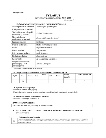 Załącznik nr 4 SYLABUS DOTYCZY CYKLU KSZTAŁCENIA 2015 - 2018 (skrajne daty) 1.1. PODSTAWOWE INFORMACJE O PRZEDMIOCIE/MODULE Nazwa przedmiotu/ modułu Technologia informacyjna Kod przedmiotu/ modułu* Wydział (nazwa jednostki prowadzącej kierunek) Wydział Filologiczny Nazwa jednostki realizującej przedmiot Katedra Filologii Rosyjskiej Kierunek studiów Filoloogia Poziom kształcenia Studia pierwszego stopnia Profil Ogólnoakademicki Forma studiów Stacjonarne Rok i semestr studiów I rok, 1 semestr Rodzaj przedmiotu obowiązkowy Koordynator dr Małgorzata Dziedzic Imię i nazwisko osoby prowadzącej / osób Tomasz Chałupski prowadzących * - zgodnie z ustaleniami na wydziale 1.2.Formy zajęć dydaktycznych, wymiar godzin i punktów ECTS Sem. Inne ( Wykł. Ćw. Konw. Lab. ZP Prakt. jakie?) Liczba pkt ECTS 30 2 1.3. Sposób realizacji zajęć + zajęcia w formie tradycyjnej ☐ zajęcia realizowane z wykorzystaniem metod i technik kształcenia na odległość 1.4. Forma zaliczenia przedmiotu/ modułu: zaliczenie z oceną po semestrze 1 2.WYMAGANIA WSTĘPNE Poziom wiadomości wyniesiony ze szkoły średniej 3. 3.1. C1 CELE, EFEKTY KSZTAŁCENIA , TREŚCI PROGRAMOWE I STOSOWANE METODY DYDAKTYCZNE Cele przedmiotu/modułu Nabycie i uzupełnienie umiejętności niezbędnych do praktycznego użytkowania zestawu komputerowego C2 Nabycie i uzupełnienie umiejętności niezbędnych do pracy z standardowym oprogramowaniem użytkowym C3 Nabycie i uzupełnienie umiejętności niezbędnych do pracy w sieci internetowej C4 Nabycie umiejętności poprawnego reagowania w sytuacjach awaryjnych zestawu komputerowego C5 Nabycie wiadomości dotyczących prawa autorskiego w zakresie oprogramowania komputerowego 3.2 EFEKTY KSZTAŁCENIA DLA PRZEDMIOTU/ MODUŁU EK ( efekt kształcenia) Treść efektu kształcenia zdefiniowanego dla przedmiotu (modułu) Odniesienie do efektów kierunkowych (KEK) EK_01 Umiejętność praktycznego użytkowania zestawu komputerowego K_W02 EK_02 Umiejętność pracy z standardowym oprogramowaniem użytkowym K_W04 EK_03 Umiejętność pracy w sieci internetowej K_U19 EK_04 Umiejętność poprawnego reagowania w sytuacjach awaryjnych zestawu komputerowego K_U18 EK_05 Świadome stosowanie prawa autorskiego w zakresie oprogramowania komputerowego K_U17 3.3 TREŚCI PROGRAMOWE A. Problematyka wykładu Treści merytoryczne B. Problematyka ćwiczeń audytoryjnych, konwersatoryjnych, laboratoryjnych, praktycznych zajęć Treści merytoryczne Wprowadzenie. Omówienie tematyki zajęć, zasad i warunków zaliczenia. Rola informatyki w uczeniu się, doskonaleniu zawodowym oraz nauczaniu na odległość. Zagrożenia psychiczne wynikające z niewłaściwego jej wykorzystania. Zasady BHP przy korzystaniu z komputerów, urządzeń multimedialnych i sieci. Elementy prawa autorskiego w odniesieniu do oprogramowania i pobranych z sieci plików. Wprowadzenie terminologii stosowanej w przedmiocie nauczania. Zaznajomienie się z elementami zestawu komputerowego: jednostka centralna, monitor, klawiatura, myszka. Nośniki danych: pamięć RAM, dysk twardy stacja dyskietek, CD/DVD, zewnętrzne nośniki danych USB. Systemy operacyjne: DOPS, Windows w kolejnych wersjach. Konfigurowanie ustawień systemowych: pulpit, język, paski itp. Operacje związane z uruchamianiem i wyłączeniem komputera, hib Oprogramowanie użytkowe: instalacja, uruchamianie, dezinstalacja, skróty klawiaturowe. Ogólne zasady korzystania z programów. Sieć komputerowa. Podstawowe informacje o rodzajach sieci informatycznej, mediach komunikacji i ich parametrach. Internet jako sieć rozległa. Oprogramowanie do komunikacji w sieci. Protokół TCP/I, dostawcy usług sieciowych, łącza: sztywne, bezprzewodowe, modemy. Programy „Outlook Express” i „Internet Explorer” jako narzędzia do pracy w sieci. Ich konfiguracja i obsługa. „Internet Explorer”, ćwiczenia. Konfiguracja i eksploatacja. Organizacja sieci internetowej. Strony www, sposoby korzystania z serwisów: Google, WP, itp. Inne serwisy, ze szczególnym uwzględnieniem obcojęzycznych. Kodowanie. Outlook Express, ćwiczenia. Zaznajomienie się możliwościami konfiguracji. Obsługa poczty e-mail. Skrzynka odbiorcza, nadawcza, możliwości ograniczania i blokowania adresatów. Instalowanie nowych kont pocztowych. Ćwiczenia w korzystaniu z sieci. Metody wyszukiwania informacji - wikipedia. Inne technologie i oprogramowanie przeznaczone do pobierania danych z sieci. Edytory tekstu: rodzaje, informacje o przydatności i kompatybilności. Edytor „Word”, jego kolejne wersje i cechy użytkowe. Znaki narodowe, symbole, układ klawiatury. Ćwiczenia praktyczne z pracą z edytorem „Word”. Kontrola wiadomości w formie pisemnej i praktycznej Technologia informacyjna jako składnik warsztatu nauczyciela. Posługiwanie sie komputerem do przygotowania materiałów edukacyjnych i prezentacji multimedialnych. Kierunki rozwoju zastosowań technologii informacyjnej w przygotowaniu i prowadzeniu zajęć. Ćwiczenia w tworzeniu prezentacji multimedialnych. Wskazówki praktyczne. Sytuacje awaryjne podczas pracy z komputerem. „Zawieszenie” pracy komputera, reinstalacja oprogramowania, przywracanie systemu. Legalność oprogramowania, rodzaje wersji instalacyjnych, wersje próbne i okresowe. Zaliczenie przedmiotu 3.4 METODY DYDAKTYCZNE - praca w laboratorium, - praca w grupach, - dyskusja 4 METODY I KRYTERIA OCENY 4.1 Sposoby weryfikacji efektów kształcenia Symbol efektu Metody oceny efektów kształcenia ( np.: kolokwium, egzamin ustny, egzamin pisemny, projekt, sprawozdanie, obserwacja w trakcie zajęć) Forma zajęć dydaktycznych ( w, ćw, …) EK_01 OBSERWACJA W TRAKCIE ZAJĘĆ, KOLOKWIUM ĆW. EK_02 obserwacja w trakcie zajęć ĆW. EK_03 obserwacja w trakcie zajęć, kolokwium ĆW. EK_04 obserwacja w trakcie zajęć, projekt, kolokwium ĆW. 4.2 Warunki zaliczenia przedmiotu (kryteria oceniania) Ocena wyników na podstawie weryfikacji odpowiedzi w czasie zaliczenia 