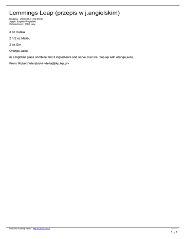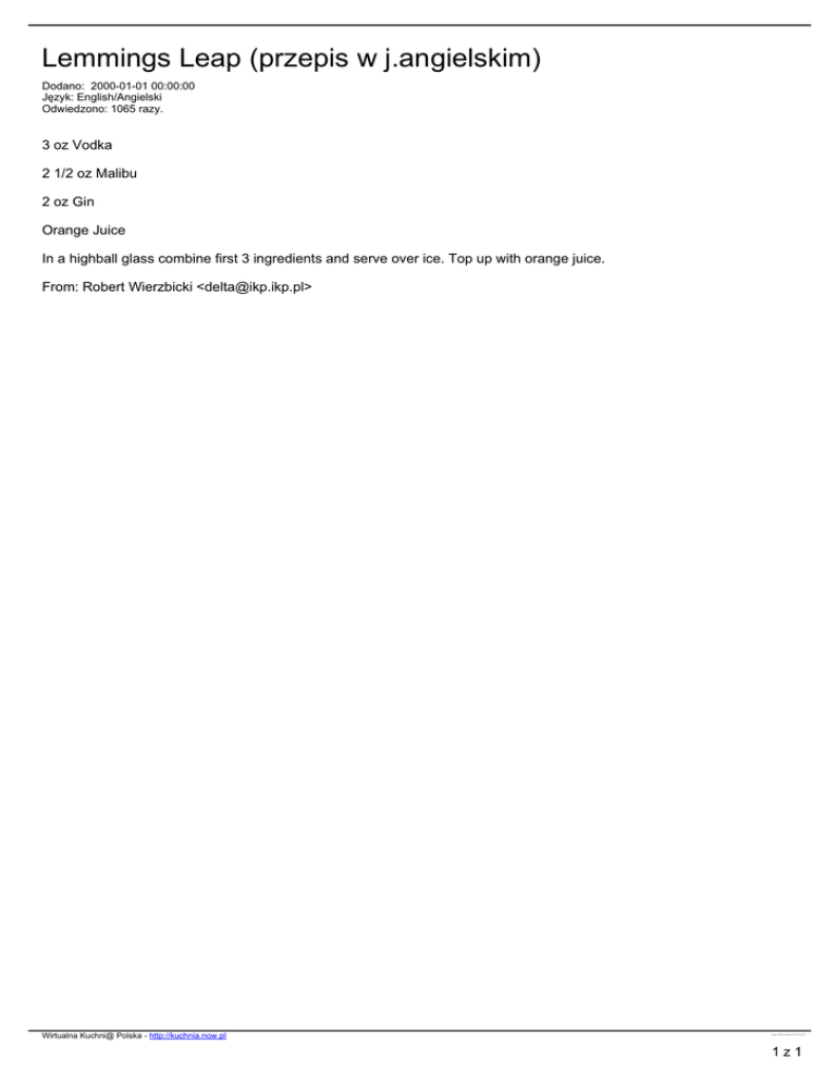 Lemmings Leap (przepis w j.angielskim) Dodano: 2000-01-01 00:00:00 Język: English/Angielski Odwiedzono: 1065 razy. 3 oz Vodka 2 1/2 oz Malibu 2 oz Gin Orange Juice In a highball glass combine first 3 ingredients and serve over ice. Top up with orange juice. From: Robert Wierzbicki <[email protected]> Wirtualna Kuchni@ Polska - http://kuchnia.now.pl przepis nr 3896, plik wygenerowano 2017.03.04 14:28 1z1