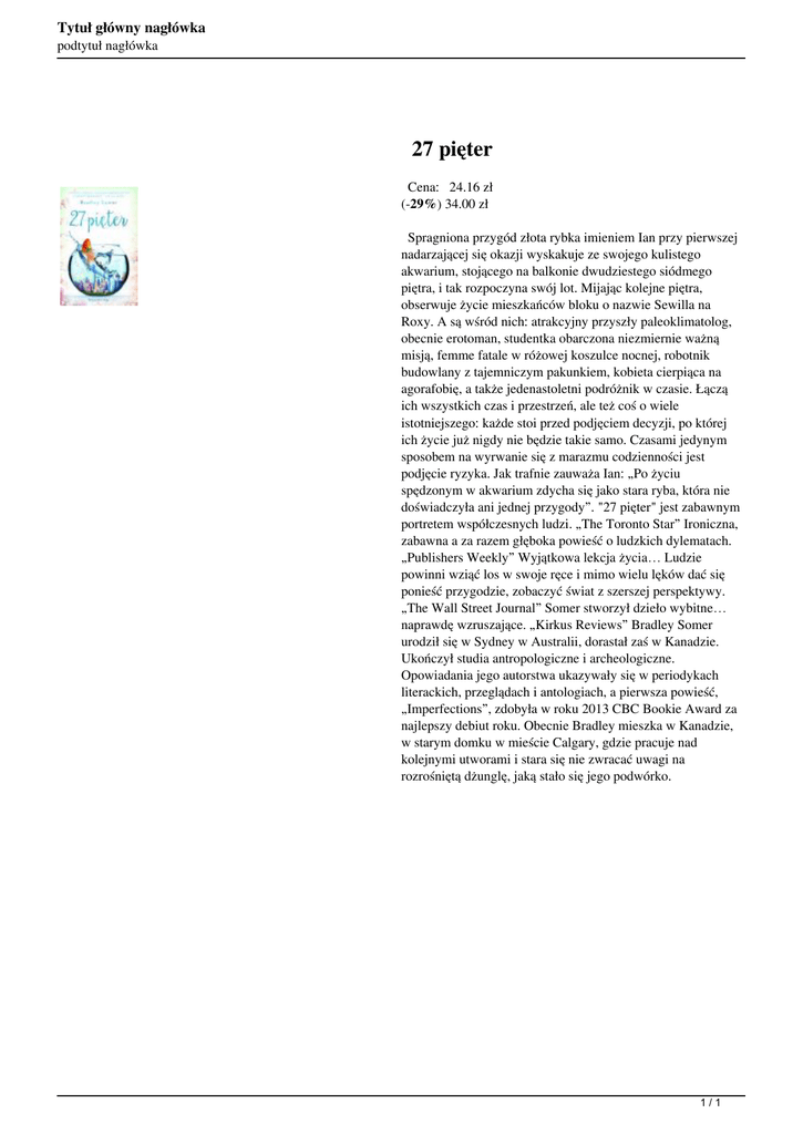 Tytuł główny nagłówka podtytuł nagłówka 27 pięter Cena: 24.16 zł (-29%) 34.00 zł Spragniona przygód złota rybka imieniem Ian przy pierwszej nadarzającej się okazji wyskakuje ze swojego kulistego akwarium, stojącego na balkonie dwudziestego siódmego piętra, i tak rozpoczyna swój lot. Mijając kolejne piętra, obserwuje życie mieszkańców bloku o nazwie Sewilla na Roxy. A są wśród nich: atrakcyjny przyszły paleoklimatolog, obecnie erotoman, studentka obarczona niezmiernie ważną misją, femme fatale w różowej koszulce nocnej, robotnik budowlany z tajemniczym pakunkiem, kobieta cierpiąca na agorafobię, a także jedenastoletni podróżnik w czasie. Łączą ich wszystkich czas i przestrzeń, ale też coś o wiele istotniejszego: każde stoi przed podjęciem decyzji, po której ich życie już nigdy nie będzie takie samo. Czasami jedynym sposobem na wyrwanie się z marazmu codzienności jest podjęcie ryzyka. Jak trafnie zauważa Ian: „Po życiu spędzonym w akwarium zdycha się jako stara ryba, która nie doświadczyła ani jednej przygody”. "27 pięter" jest zabawnym portretem współczesnych ludzi. „The Toronto Star” Ironiczna, zabawna a za razem głęboka powieść o ludzkich dylematach. „Publishers Weekly” Wyjątkowa lekcja życia… Ludzie powinni wziąć los w swoje ręce i mimo wielu lęków dać się ponieść przygodzie, zobaczyć świat z szerszej perspektywy. „The Wall Street Journal” Somer stworzył dzieło wybitne… naprawdę wzruszające. „Kirkus Reviews” Bradley Somer urodził się w Sydney w Australii, dorastał zaś w Kanadzie. Ukończył studia antropologiczne i archeologiczne. Opowiadania jego autorstwa ukazywały się w periodykach literackich, przeglądach i antologiach, a pierwsza powieść, „Imperfections”, zdobyła w roku 2013 CBC Bookie Award za najlepszy debiut roku. Obecnie Bradley mieszka w Kanadzie, w starym domku w mieście Calgary, gdzie pracuje nad kolejnymi utworami i stara się nie zwracać uwagi na rozrośniętą dżunglę, jaką stało się jego podwórko. 1/1 Powered by TCPDF (www.tcpdf.org)