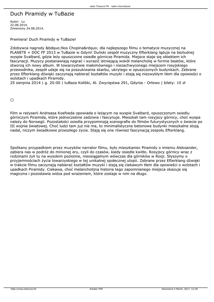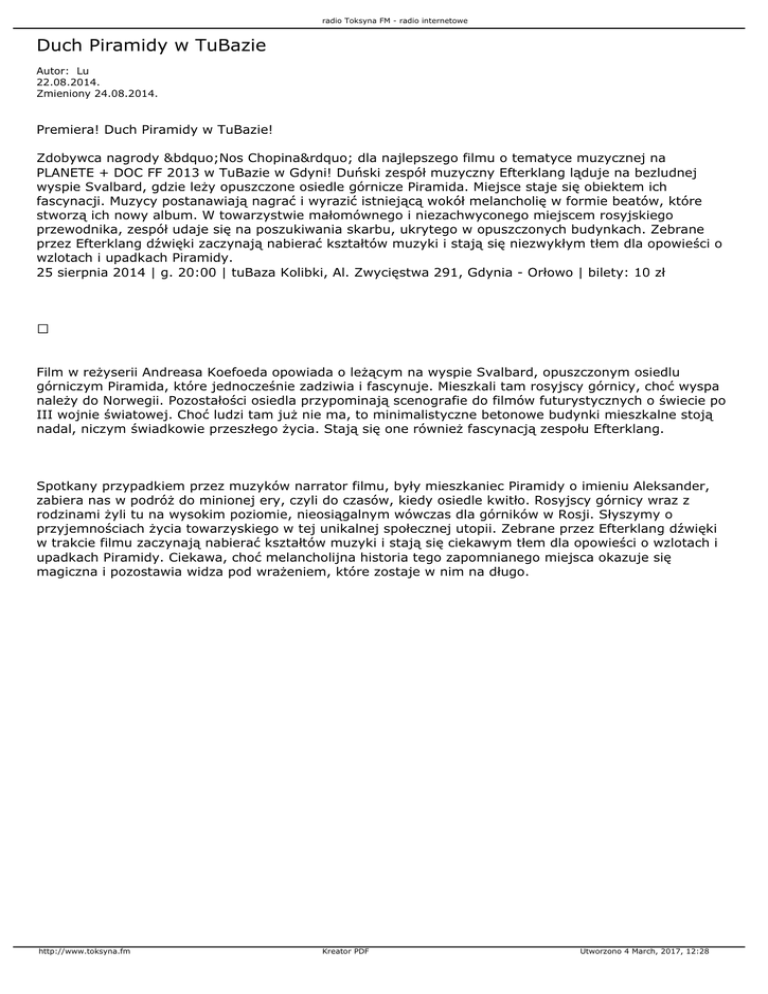 radio Toksyna FM - radio internetowe Duch Piramidy w TuBazie Autor: Lu 22.08.2014. Zmieniony 24.08.2014. Premiera! Duch Piramidy w TuBazie! Zdobywca nagrody „Nos Chopina” dla najlepszego filmu o tematyce muzycznej na PLANETE + DOC FF 2013 w TuBazie w Gdyni! Duński zespół muzyczny Efterklang ląduje na bezludnej wyspie Svalbard, gdzie leży opuszczone osiedle górnicze Piramida. Miejsce staje się obiektem ich fascynacji. Muzycy postanawiają nagrać i wyrazić istniejącą wokół melancholię w formie beatów, które stworzą ich nowy album. W towarzystwie małomównego i niezachwyconego miejscem rosyjskiego przewodnika, zespół udaje się na poszukiwania skarbu, ukrytego w opuszczonych budynkach. Zebrane przez Efterklang dźwięki zaczynają nabierać kształtów muzyki i stają się niezwykłym tłem dla opowieści o wzlotach i upadkach Piramidy. 25 sierpnia 2014 | g. 20:00 | tuBaza Kolibki, Al. Zwycięstwa 291, Gdynia - Orłowo | bilety: 10 zł Film w reżyserii Andreasa Koefoeda opowiada o leżącym na wyspie Svalbard, opuszczonym osiedlu górniczym Piramida, które jednocześnie zadziwia i fascynuje. Mieszkali tam rosyjscy górnicy, choć wyspa należy do Norwegii. Pozostałości osiedla przypominają scenografie do filmów futurystycznych o świecie po III wojnie światowej. Choć ludzi tam już nie ma, to minimalistyczne betonowe budynki mieszkalne stoją nadal, niczym świadkowie przeszłego życia. Stają się one również fascynacją zespołu Efterklang. Spotkany przypadkiem przez muzyków narrator filmu, były mieszkaniec Piramidy o imieniu Aleksander, zabiera nas w podróż do minionej ery, czyli do czasów, kiedy osiedle kwitło. Rosyjscy górnicy wraz z rodzinami żyli tu na wysokim poziomie, nieosiągalnym wówczas dla górników w Rosji. Słyszymy o przyjemnościach życia towarzyskiego w tej unikalnej społecznej utopii. Zebrane przez Efterklang dźwięki w trakcie filmu zaczynają nabierać kształtów muzyki i stają się ciekawym tłem dla opowieści o wzlotach i upadkach Piramidy. Ciekawa, choć melancholijna historia tego zapomnianego miejsca okazuje się magiczna i pozostawia widza pod wrażeniem, które zostaje w nim na długo. http://www.toksyna.fm Kreator PDF Utworzono 4 March, 2017, 12:28