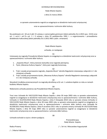 UCHWAŁA NR XVI/204/2016 Rady Miasta Sopotu z dnia 21 marca 2016r. w sprawie ustanowienia nagród za osiągnięcia w dziedzinie twórczości artystycznej oraz w upowszechnianiu i ochronie dóbr kultury. Na podstawie art. 18 ust.2 pkt 15 ustawy o samorządzie gminnym (tekst jednolity Dz.U.2015 poz. 1515) oraz art. 1 ust.4 i art.7a ust. 1 i 3 ustawy z dnia 25 października 1991 r. o organizowaniu i prowadzeniu działalności kulturalnej (tekst jednolity Dz.U.2012.406 z późn. zmianami) Rada Miasta Sopotu uchwala, co następuje: §1 Ustanawia się nagrody Prezydenta Miasta Sopotu za osiągnięcia w dziedzinie twórczości artystycznej oraz w upowszechnianiu i ochronie dóbr kultury: 1. „Sopocka Muza”, którą stanowi statuetka oraz nagroda pieniężna; 2. Tytuł „Mecenas Kultury Sopotu”, który jest nagrodą honorową. §2 1. Tryb i zasady przyznawania nagrody „Sopocka Muza” określa Regulamin stanowiący załącznik nr 1 do niniejszej uchwały. 2. Tryb i zasady przyznawania tytułu „Mecenas Kultury Sopotu” określa Regulamin stanowiący załącznik nr 2 do niniejszej uchwały. §3 Wysokość środków przeznaczonych na nagrodę określoną w §1 ust. 1 ustalona będzie co roku w ramach budżetu Miasta Sopotu. §4 Wykonanie uchwały powierza się Prezydentowi Miasta Sopotu. §5 Traci moc Uchwała Nr VIII/122/03 Rady Miasta Sopotu z dnia 30 maja 2003 roku w sprawie ustanowienia nagród za osiągnięcia w dziedzinie twórczości artystycznej oraz w upowszechnianiu i ochronie dóbr kultury, Uchwała nr XLII/555/2010 Rady Miasta Sopotu z dnia 5 listopada 2010 roku w sprawie zmiany Uchwały nr VIII/122/03 Rady Miasta Sopotu z dnia 30 maja 2003 roku w sprawie ustanowienia nagród za osiągnięcia w dziedzinie twórczości artystycznej oraz w upowszechnianiu i ochronie dóbr kultury oraz Uchwała Nr XI/109/2011 Rady Miasta Sopotu z dnia 9 września 2011 roku w sprawie zmiany Uchwały Nr VII/122/03 Rady Miasta Sopotu z dnia 30 maja 2003 roku w sprawie ustanowienia nagród za osiągnięcia w dziedzinie twórczości artystycznej oraz w upowszechnianiu i ochronie dóbr kultury. §6 Uchwała wchodzi w życie z dniem podjęcia. Przewodniczący Rady Miasta Sopotu Radca Prawny / - / Marta Falkiewicz / - / dr inż. Wieczesław Augustyniak Załącznik nr 1 do Uchwały NR XVI/204/2016 Rady Miasta Sopotu z dnia 21 marca 2016 Regulamin Nagrody Prezydenta Miasta Sopotu w dziedzinie kultury i sztuki pod nazwą „Sopocka Muza”. §1 Nagrodę Prezydenta Miasta Sopotu w dziedzinie kultury i sztuki pod nazwą „Sopocka Muza” stanowi statuetka oraz nagroda pieniężna , której wysokość ustalana jest corocznie w ramach budżetu Miasta Sopotu. §2 1. Nagrodę „Sopocka Muza” przyznaje się za wybitne osiągnięcia i zasługi w dziedzinie kultury i sztuki, a w szczególności za: - realizację w danym roku wybitnego dzieła z zakresu: choreografii, filmu, fotografii, literatury, muzyki, plastyki, publicystyki kulturalnej, teatru, telewizji itp.; - szczególne osiągnięcia w dziedzinie upowszechniania kultury oraz promocji miasta Sopotu; - długoletnią wybitną działalność społeczno – kulturalną. 2. W każdym roku przyznawana jest tylko jedna nagroda. 3. Nagroda może być przyznana tej samej osobie tylko raz. §3 1. Kandydatów do nagrody Prezydenta Miasta Sopotu – „Sopocka Muza” mogą zgłaszać do końca sierpnia każdego roku: - Prezydent Miasta Sopotu; - Wiceprezydenci Miasta Sopotu; - Radni Miasta Sopotu; - Komisja Kultury, Promocji i Współpracy Zagranicznej Rady Miasta Sopotu; - Naczelnik Wydziału Kultury i Sportu Urzędu Miasta Sopotu; - dyrektorzy sopockich instytucji kultury; - przedstawiciele sopockich organizacji pozarządowych działających w sferze kultury; - przedstawiciele związków twórczych. 2. Zgłoszenie , o którym mowa w ust. 1, powinno zawierać uzasadnienie oraz powinno być złożone w terminie określonym w ust. 1 w Kancelarii Ogólnej Urzędu Miasta Sopotu. W razie wątpliwości decydująca jest data wpływu zgłoszenia kandydata do Kancelarii Ogólnej Urzędu Miasta Sopotu. §4 1. We wrześniu każdego roku Prezydent Miasta Sopotu powołuje w formie zarządzenia Kapitułę Nagrody „Sopocka Muza”. 2. W skład Kapituły wchodzą przedstawiciele instytucji i komisji wymienionych w §3. 3. Kapituła nominuje kandydatów do nagrody „Sopocka Muza”. §5 Prezydent Miasta Sopotu dokonuje wyboru laureata spośród kandydatów nominowanych przez Kapitułę. §6 Wręczenie nagrody „Sopocka Muza” następuje w IV kwartale danego roku podczas uroczystości miejskiej. Załącznik nr 2 do Uchwały NR XVI/204/2016 Rady Miasta Sopotu z dnia 21 marca 2016r. Regulamin Nadania Tytułu „Mecenasa Kultury Sopotu” §1 Tytuł „Mecenasa Kultury Sopotu” przyznaje Prezydent Miasta Sopotu za najefektywniejszą i najciekawszą formę wsparcia sopockiej kultury. §2 1. „Mecenasem Kultury” może zostać podmiot nienależący do sektora finansów publicznych. 2. Wraz z tytułem „Mecenasa Kultury Sopotu” laureat otrzymuje dyplom i honorową plakietę. 3. Każdego roku może być przyznany tylko jeden tytuł „Mecenasa Kultury Sopotu”. 4. Tytuł Mecenasa Kultury może być przyznany temu samemu podmiotowi raz na 5 lat. §3 1. Kandydatów do Tytułu „Mecenasa Kultury Sopotu” zgłaszają: - Prezydent Miasta Sopotu; - Przewodniczący Rady Miasta Sopotu; - Wiceprezydenci Miasta Sopotu; - Przewodniczący Komisji Kultury, Promocji i Współpracy Zagranicznej Rady Miasta Sopotu; - Naczelnik Wydziału Kultury i Sportu Urzędu Miasta Sopotu; - dyrektorzy sopockich instytucji kultury; - związki, stowarzyszenia i fundacje działające w sferze kultury; - indywidualni twórcy. 2. Zgłoszenia powinny być złożone w Kancelarii Ogólnej Urzędu Miasta Sopotu, w formie pisemnej wraz z uzasadnieniem do końca sierpnia każdego roku. W razie wątpliwości decydująca jest data wpływu zgłoszenia kandydata do Kancelarii Ogólnej Urzędu Miasta Sopotu. §4 1. We 