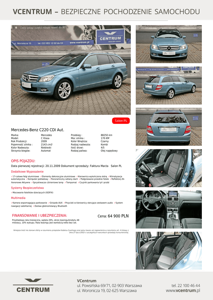 Mercedes-Benz C220 CDI Aut. Marka: Model: Rok Produkcji: Pojemność silnika : Kolor Nadwozia: Skrzynia biegów: Mercedes C Klasa 2009 2143 cm3 Niebieski Automat Przebieg : Moc silnika : Kolor Wnętrza: Rodzaj nadwozia: Ilość drzwi: Rodzaj paliwa: 88250 km 170 KM Czarny Kombi 4/5 Olej napędowy OPIS POJAZDU: Data pierwszej rejestracji: 20.11.2009 Dokument sprzedaży: Faktura Marża Salon PL Dodatkowe Wyposażenie ✓17-calowe felgi aluminiowe ✓Elementy dekoracyjne aluminiowe ✓Kierownica wykończona skórą ✓Klimatyzacja automatyczna ✓Komputer pokładowy ✓Panoramiczny szklany dach ✓Podgrzewane przednie fotele ✓Reflektory BiXenonowe Aktywne ✓Spryskiwacze ciśnieniowe lamp ✓Tempomat ✓Czujniki parkowania tył i przód Systemy Bezpieczeństwa ✓Mocowanie fotelików dziecięcych (ISOFIX) Multimedia ✓Kamera wspomagająca parkowanie ✓Gniazdo AUX ✓Przyciski w kierownicy sterujące zestawem audio ✓System nawigacji satelitarnej ✓Zestaw głośnomówiący Bluetooth FINANSOWANIE I UBEZPIECZENIA: Cena: 64 900 PLN Przykładowa rata miesięczna, wpłata 20%, okres leasingu/kredytu 48 miesięcy, 10% wykupu. Rata leasingu jest wartością netto bez vat. Niniejsza treść nie stanowi oferty w rozumieniu przepisów Kodeksu Cywilnego oraz opisu towaru ani zapewnienia w rozumieniu art. 4 Ustawy z dnia 27 lipca 2002r o szczególnych warunkach sprzedaży konsumenckiej. Powered by TCPDF (www.tcpdf.org)
