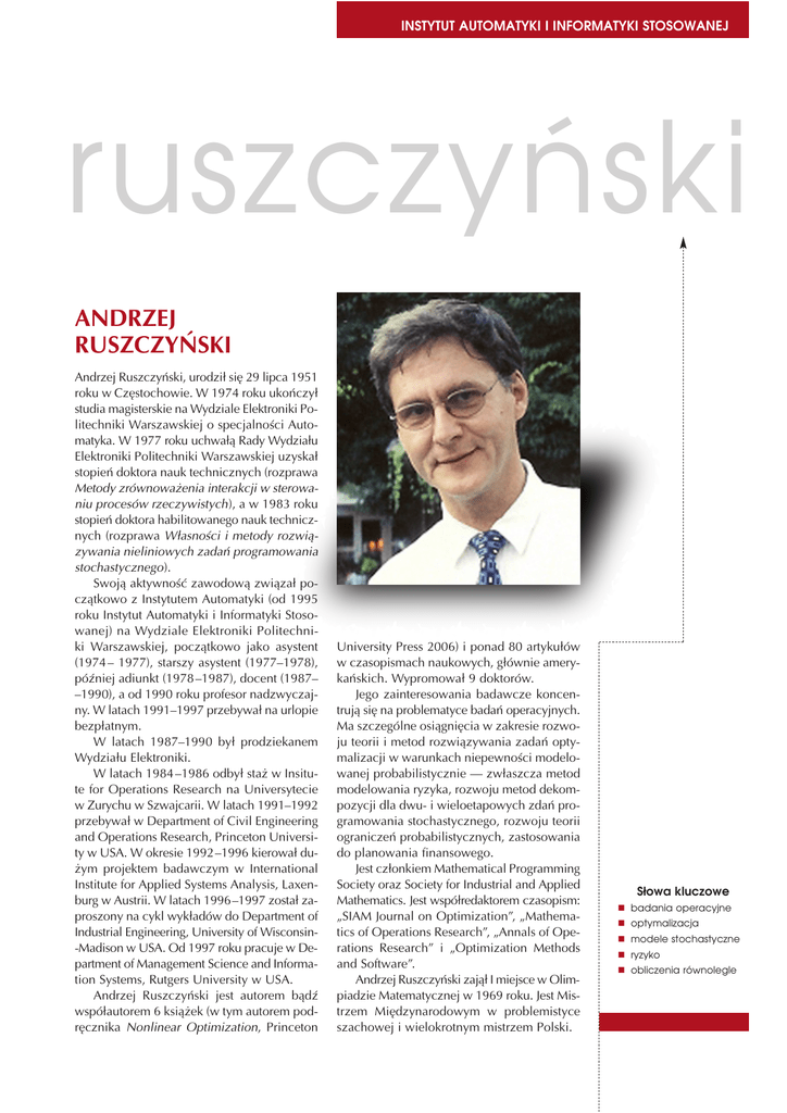 INSTYTUT AUTOMATYKI I INFORMATYKI STOSOWANEJ ruszczyński ANDRZEJ RUSZCZYŃSKI Andrzej Ruszczyński, urodził się 29 lipca 1951 roku w Częstochowie. W 1974 roku ukończył studia magisterskie na Wydziale Elektroniki Politechniki Warszawskiej o specjalności Automatyka. W 1977 roku uchwałą Rady Wydziału Elektroniki Politechniki Warszawskiej uzyskał stopień doktora nauk technicznych (rozprawa Metody zrównoważenia interakcji w sterowaniu procesów rzeczywistych), a w 1983 roku stopień doktora habilitowanego nauk technicznych (rozprawa Własności i metody rozwiązywania nieliniowych zadań programowania stochastycznego). Swoją aktywność zawodową związał początkowo z Instytutem Automatyki (od 1995 roku Instytut Automatyki i Informatyki Stosowanej) na Wydziale Elektroniki Politechniki Warszawskiej, początkowo jako asystent (1974 – 1977), starszy asystent (1977–1978), później adiunkt (1978 –1987), docent (1987– –1990), a od 1990 roku profesor nadzwyczajny. W latach 1991–1997 przebywał na urlopie bezpłatnym. W latach 1987–1990 był prodziekanem Wydziału Elektroniki. W latach 1984 –1986 odbył staż w Insitute for Operations Research na Universytecie w Zurychu w Szwajcarii. W latach 1991–1992 przebywał w Department of Civil Engineering and Operations Research, Princeton University w USA. W okresie 1992 –1996 kierował dużym projektem badawczym w International Institute for Applied Systems Analysis, Laxenburg w Austrii. W latach 1996–1997 został zaproszony na cykl wykładów do Department of Industrial Engineering, University of Wisconsin-Madison w USA. Od 1997 roku pracuje w Department of Management Science and Information Systems, Rutgers University w USA. Andrzej Ruszczyński jest autorem bądź współautorem 6 książek (w tym autorem podręcznika Nonlinear Optimization, Princeton University Press 2006) i ponad 80 artykułów w czasopismach naukowych, głównie amerykańskich. Wypromował 9 doktorów. Jego zainteresowania badawcze koncentrują się na problematyce badań operacyjnych. Ma szczególne osiągnięcia w zakresie rozwoju teorii i metod rozwiązywania zadań optymalizacji w warunkach niepewności modelowanej probabilistycznie — zwłaszcza metod modelowania ryzyka, rozwoju metod dekompozycji dla dwu- i wieloetapowych zdań programowania stochastycznego, rozwoju teorii ograniczeń probabilistycznych, zastosowania do planowania finansowego. Jest członkiem Mathematical Programming Society oraz Society for Industrial and Applied Mathematics. Jest współredaktorem czasopism: „SIAM Journal on Optimization”, „Mathematics of Operations Research”, „Annals of Operations Research” i „Optimization Methods and Software”. Andrzej Ruszczyński zajął I miejsce w Olimpiadzie Matematycznej w 1969 roku. Jest Mistrzem Międzynarodowym w problemistyce szachowej i wielokrotnym mistrzem Polski. Słowa kluczowe n badania operacyjne n optymalizacja n modele stochastyczne n ryzyko n obliczenia równolegle