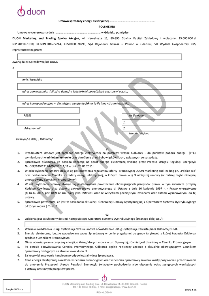 Umowa sprzedaży energii elektrycznej ……………………………………………………… POLSKIE RIO Umowa wygenerowana dnia ……………………………………………………… w Gdańsku pomiędzy: DUON Marketing and Trading Spółka Akcyjna, ul. Heweliusza 11, 80-890 Gdańsk Kapitał Zakładowy i wpłacony: 15 000 000 zł, NIP 7811861610, REGON 301677244, KRS 0000378299, Sąd Rejonowy Gdańsk – Północ w Gdańsku, VII Wydział Gospodarczy KRS, reprezentowaną przez: Zwaną dalej: Sprzedawcą lub DUON a Imię i Nazwisko adres zamieszkania: (ulica/nr domu/nr lokalu/miejscowość/kod pocztowy/ poczta) adres korespondencyjny – dla miejsca wysyłania faktur (o ile inny niż zamieszkania) PESEL Nr Dowodu 1. Adres e-mail 2. Numer telefonu zwanym/-ą dalej „ Odbiorcą” 1. 2. 3. 4. 5. 1. 2. 3. 4. 5. 6. 7. Parafka Odbiorcy §1 Przedmiotem Umowy jest sprzedaż energii elektrycznej na potrzeby własne Odbiorcy - do punktów poboru energii (PPE), wymienionych w niniejszej umowie oraz określenie praw i obowiązków Stron, związanych ze sprzedażą. Sprzedawca oświadcza, że posiada koncesję na obrót energią elektryczną wydaną przez Prezesa Urzędu Regulacji Energetyki Nr. OEE/629/19174/W/2/2011/IB w dniu 20.05.2011r. W celu wykonania umowy stosuje się postanowienia regulaminu oferty promocyjnej DUON Marketing and Trading pn. „Polskie Rio” oraz postanowienia Cennika sprzedaży energii elektrycznej, o którym mowa w § 9 niniejszej umowy (w dalszej części niniejszej umowy zwany Cennikiem Promocyjnym). W celu wykonania umowy stosuje się postanowienia powszechnie obowiązujących przepisów prawa, w tym zwłaszcza przepisy Kodeksu Cywilnego oraz aktów z zakresu prawa energetycznego tj. Ustawy z dnia 10 kwietnia 1997 r. - Prawo energetyczne (tj. Dz.U. 2012, poz.1059 ze zm. dalej jako Ustawa) wraz ze wszystkimi późniejszymi zmianami oraz aktami wykonawczymi do tej ustawy. Sprzedawca potwierdza, że jest w posiadaniu aktualnej Generalnej Umowy Dystrybucyjnej z Operatorem Systemu Dystrybucyjnego o którym mowa § 2 ust. 1. §2 Odbiorca jest przyłączony do sieci następującego Operatora Systemu Dystrybucyjnego (zwanego dalej OSD): Warunki świadczenia usługi dystrybucji określa umowa o Świadczenie Usług Dystrybucji, zawarta przez Odbiorcę z OSD. Energia elektryczna, będzie sprzedawana przez Sprzedawcę w cenie przypisanej do grupy taryfowej, z której korzysta Odbiorca, zgodnie z Cennikiem Promocyjnym. Okres obowiązywania cen/ceny energii, o której/których mowa w ust. 3 powyżej, również jest określony w Cenniku Promocyjnym. Po okresie obowiązywania Cennika Promocyjnego, Odbiorca będzie rozliczany zgodnie z aktualnie obowiązującym Cennikiem Sprzedawcy dostępnym na stronie www.duon.pl. Za koszty bilansowania handlowego odpowiedzialny jest Sprzedawca. Cena energii elektrycznej określona w Cenniku Promocyjnym oraz w Cenniku Sprzedawcy zawiera koszty pozyskania i przedstawienia do umorzenia Prezesowi Urzędu Regulacji Energetyki świadectw pochodzenia albo uiszczenia opłat zastępczych wynikających z Ustawy oraz innych przepisów prawa. DUON Marketing and Trading S.A., ul. Heweliusza 11, 80-890 Gdańsk, Polska tel. +48 58 58 58 690, e-mail: [email protected], www.duon.pl Strona 1 z 5 RIO v1.0/2014 8. 9. 1. 2. 3. 4. 5. 6. 7. 8. 9. 1. 2. 3. 4. Parafka Odbiorcy Cena energii określona w Cenniku Promocyjnym oraz w Cenniku Sprzedawcy zawiera podatek akcyzowy. W przypadku wejścia w życie zmian w prawie odnoszących się do kwestii, o których mowa ust. 7 i 8 powyżej Cena energii elektrycznej określona w Cenniku Promocyjnym Sprzedawcy oraz w Cenniku Sprzedawcy ulegnie zmianie w takim zakresie, w jakim wymagać tego będą zmienione przepisy z dniem wejścia w życie zmienionych przepisów. O zmianie Ceny energii elektrycznej Odbiorca zostanie powiadomiony pisemnie najpóźniej w chwili wejścia w życie zmienionych przepisów. W piśmie Odbiorca zostanie powiadomiony o zmienionych przepisach prawa i zmienionej cenie. §3 Odczyty rozliczeniowe układów pomiarowo-rozliczeniowych („Dane Pomiarowe”) i rozliczenia kosztów sprzedanej energii odbywać się będą w okresach stosowanych przez OSD („Okres Rozliczeniowy”), jednakże nie krótszych niż okresy półroczne, chyba że strony postanowią inaczej. Sprzedawca ma prawo do stosowania rozliczeń prognozowanych ustalonych na podstawie zużycia wyznaczonego w oparciu o rzeczywiste odczyty układu pomiarowo-rozliczeniowego, dokonane w analogicznym okresie poprzedniego roku kalendarzowego. W prognozach należy uwzględniać zgłoszone przez Odbiorcę istotne zmiany w poborze energii elektrycznej. Jeżeli w wyniku stosowania rozliczeń prognozowanych po zakończeniu okresu rozliczeniowego powstanie nadpłata lub niedopłata to: a) W przypadku niedopłaty, kwota niedopłaty doliczana jest do faktury za kolejny okres rozliczeniowy, b) W przypadku nadpłaty, kwota nadpłaty zaliczana jest na poczet faktury za kolejny okres rozliczeniowy, o ile Odbiorca nie zażąda jej zwrotu. Należności za sprzedaną energię elektryczną będą regulowane przez Odbiorcę zgodnie z terminem (lub terminami) płatności określonym(-i) na fakturze. W razie powstania zaległości w płatnościach (należności wynikające z faktur wraz z odsetkami lub odsetki od nieterminowo uregulowanych faktur), Sprzedawca może zarachować dokonane przez Odbiorcę wpłaty pieniężne w pierwszej kolejności na poczet odsetek od faktur uregulowanych z opóźnieniem, a następnie na poczet najdawniej wymagalnego długu. Za dzień spełnienia świadczenia uznaje się datę wpływu należności na rachunek bankowy Sprzedawcy. Reklamacja nie zwalnia Odbiorcy od terminowego regulowania płatności. W przypadku stwierdzenia przez którąkolwiek ze Stron i potwierdzenia przez OSD nieprawidłowego działania układu pomiaroworozliczeniowego bądź błędnego rozliczenia, które spowodowały zawyżenie lub zaniżenie należności,