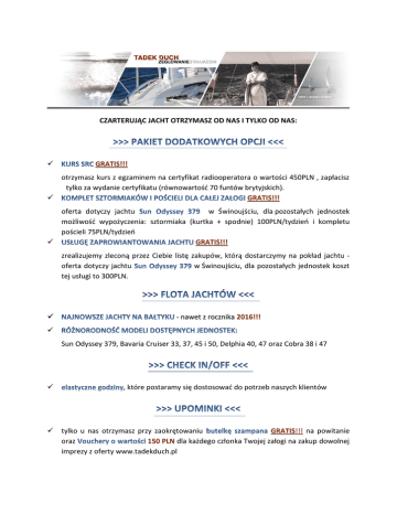CZARTERUJĄC JACHT OTRZYMASZ OD NAS I TYLKO OD NAS: GRATIS!!! otrzymasz kurs z egzaminem na certyfikat radiooperatora o wartości 450PLN , zapłacisz tylko za wydanie certyfikatu (równowartość 70 funtów brytyjskich). GRATIS!!! oferta dotyczy jachtu w Świnoujściu, dla pozostałych jednostek możliwość wypożyczenia: sztormiaka (kurtka + spodnie) 100PLN/tydzień i kompletu pościeli 75PLN/tydzień GRATIS!!! zrealizujemy zleconą przez Ciebie listę zakupów, którą dostarczymy na pokład jachtu oferta dotyczy jachtu w Świnoujściu, dla pozostałych jednostek koszt tej usługi to 300PLN. nawet z rocznika 2016!!! : Sun Odyssey 379, Bavaria Cruiser 33, 37, 45 i 50, Delphia 40, 47 oraz Cobra 38 i 47 , które postaramy się dostosować do potrzeb naszych klientów tylko u nas otrzymasz przy zaokrętowaniu GRATIS!!! na powitanie oraz 150 PLN dla każdego członka Twojej załogi na zakup dowolnej imprezy z oferty www.tadekduch.pl