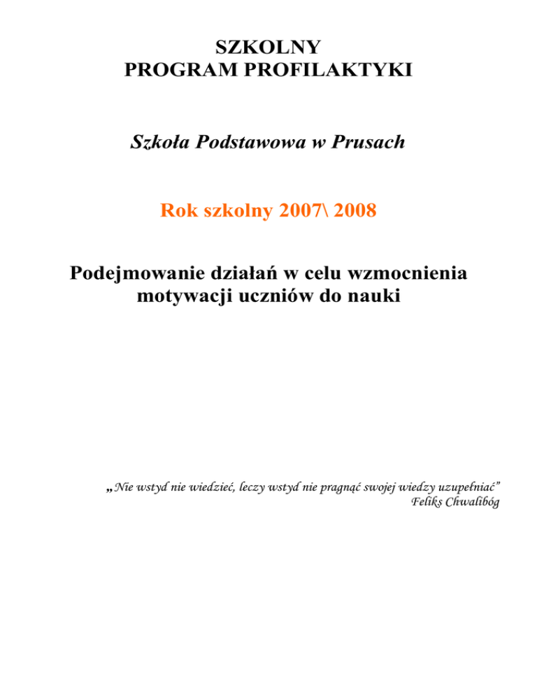 SZKOLNY PROGRAM PROFILAKTYKI Szkoła Podstawowa w Prusach Rok szkolny 2007\ 2008 Podejmowanie działań w celu wzmocnienia motywacji uczniów do nauki „Nie wstyd nie wiedzieć, leczy wstyd nie pragnąć swojej wiedzy uzupełniać” Feliks Chwalibóg Kroki tworzenia Szkolnego Programu Profilaktycznego: 1. Identyfikacja problemu. 2. Werbalizacja problemu. 3. Teoretyczna perspektywa rozumienia problemu. 4. Identyfikacja populacji badawczej. 5. Dobór metod badawczych. 6. Realizacja procedury badawczej. 7. Analiza wyników badań. 8. Werbalizacja zaleceń programu. 9. Określenie celu programu. 10. Określenie struktury, zawartości i sposobu realizacji programu: • działania ukierunkowane na uczniów, • działania ukierunkowane na rodziców , • działania ukierunkowane na nauczycieli. 11. Określenie strategii ewaluacyjnej. 2 KROK I INENTYFIKACJA PROBLEMU Treść Szkolnego Programu Profilaktycznego w roku szkolnym 2007/2008 będzie dotyczyła problemu braku motywacji uczniów do nauki oraz wskazania w jaki sposób to zmienić. Zgodnie z założeniami SPP na lata 2006- 2011 jest to jeden z ważnych tematów, który należy uwzględnić w planowaniu i opracować odpowiednie działania. Problem ten został zauważony na podstawie wyników sprawdzianu w klasie 6, rozmów, obserwacji przez wychowawców, nauczycieli, jak również sygnałów ze strony rodziców. KROK II WERBALIZACJA PROBLEMU Z obserwacji wychowawców, nauczycieli i rodziców wynika, że dzieci coraz mniej czasu poświęcają na naukę. Zauważa się, że uczniowie nie chcą się uczyć, nie lubią się uczyć, unikają wysiłku, nie zależy im na ocenach. Swój czas, który w domu powinien być przeznaczony na naukę spędzają w inny sposób: na oglądaniu programów telewizyjnych, grze na komputerze, jeździe na rowerze itp. Możemy stwierdzić, że większość uczniów, szczególnie klas starszych, zaniedbuje naukę w domu, nie odrabia prac domowych lub robią to w pośpiechu, często w szkole przed lekcjami. Część uczniów przyznaje się, że niektóre zadania ściągają z Internetu, jako gotowce. Z rozmów z uczniami wynika, że coraz mniej czasu poświęcają na pracę w domu, na rozwijanie zdolności i zainteresowań. Ponadto ulegają redukcji inne formy uczestnictwa dziecka w kulturze np. chodzenie do kina, teatru – zazwyczaj kończy się tylko na wyjściach zorganizowanych przez szkołę. Inne środki masowego przekazu, jak książka, czasopisma, radio schodzą na dalszy plan – prowadzi to do zubożenia osobowości dziecka. KROK III TEORETYCZNA PERSPEKTYWA ROZUMIENIA PROBLEMU Motyw – oznacza w psychologii swoisty stan organizmu pobudzający osobnika do działania, które ma zaspokoić jakąś potrzebę. Motyw jest to stan wewnętrznego napięcia, od którego zależy możliwość i kierunek aktywności organizmu. W słowniku pedagogicznym motywacja określana jest jako ogół motywów występujących aktualnie u danej jednostki. Motywacja może być wewnętrzna lub zewnętrzna. Wewnętrzna pobudza do działania, które ma wartości samo w sobie, jej przykładem jest zainteresowanie lub zamiłowanie do czegoś. Zewnętrzna zaś stwarza zachętę do działania, które jest w jakiś sposób nagradzane lub pozwala uniknąć kary. W szkole takiej motywacji sprzyja system nagród i kar oraz cały zbiór przepisów regulujących tok nauki. Motywy uczenia się, wynikają z uświadomienia celu, jaki pragną osiągnąć i ich potrzeb psychicznych. Najczęściej występującymi motywami uczenia się szkolnego są: motywy poznawcze, ambicyjne, lękowe i praktyczne. Rodzaje motywów uczenia się dzieci i młodzieży: 1. Uczenie się dla ucznia. 2. Uczenie się w celu korzyści osobistych. 3. Uczenie się ze względu na utożsamianie się z grupą. 4. Pragnienie osiągnięcia powodzenia i uniknięcia niepowodzenia. 5. Uczenie się ze względu na nacisk i przymus. 6. Poczucie obowiązku. 7. Praktyczne cele życiowe. 8. Uczenie się ze względu na potrzebę społeczną. 3 Szkolne uczenie się jest więc działalnością wielostronnie motywowaną. W przeciętnej grupie uczniów występują na ogół różne motywy na przykład: zainteresowania i dążenie do osiągnięcia powodzenia, nieco leku a także zrozumienie praktycznego znaczenia wiedzy i konieczność zdobycia wykształcenia – dla własnej przyszłości. Struktura motywacji i charakter działających motywów zmienia się z wiekiem, różnią się także u poszczególnych uczniów w zależności od czynników zewnętrznych środowiska, doświadczeń ucznia w uczeniu się i życiu pozaszkolnym, a także od poziomu pracy dydaktyczno- wychowawczej szkoły. Najlepszym sposobem na rozwijanie zainteresowań poznawczych oraz sposobem na podwyższenie wyników nauczania jest mobilizowanie aktywności uczniów, pobudzanie ich do wysiłku umysłowego tak, aby jego efektem było zrozumienie i niejako odkrycie rzeczy subiektywnie nowych. Sprzyja to dobremu przyswajaniu wiedzy oraz rozwojowi zainteresowań uczniów. Zainteresowania poznawcze, w tym także szkolenie, są pochodną, a zarazem źródłem samodzielnej aktywności poznawczej. I to właśnie stanowi o ich ogromnej rozwijającej rolo, a jednocześnie o ich wartości jako motywów uczenia się. Wywołują one postawę gotowości przyjmowania i asymilowania wiedzy, prowadzą do samouctwa i dociekliwości umysłu, tak ważnej w uczeniu się wszelkiej samodzielnej a zwłaszcza twórczej działalności umysłowej. Innym dość popularnym motywem uczenia się są dobre oceny, traktowane jako wyraz powodzenia w uczeniu się, oznaka dobrego wykonania zadania, zachęta do dalszego uczenia się. Oceny niedostateczne raczej zniechęcają do dalszego uczenia się, stanowią dużą przykrość dla uczniów, są powodem powstawania lęku. Duże znaczenie motywujące ma także pozytywna ocena rezultatów własnej pracy. Ponadto ważnym czynnikiem motywacyjnym jest organizacja środowiska dydaktycznego ucznia tzn. wyposażenie