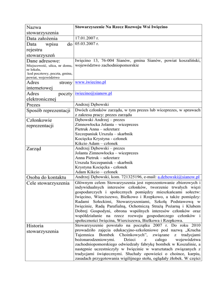 Nazwa stowarzyszenia Data założenia Data wpisu rejestru stowarzyszeń Dane adresowe: Stowarzyszenie Na Rzecz Rozwoju Wsi Iwięcino 17.01.2007 r. do 05.03.2007 r. Miejscowość, ulica, nr domu, nr lokalu, kod pocztowy, poczta, gmina, powiat, województwo Adres strony internetowej Adres poczty elektronicznej Prezes Sposób reprezentacji Członkowie reprezentacji Zarząd Osoba do kontaktu Cele stowarzyszenia Historia stowarzyszenia Iwięcino 13, 76-004 Sianów, gmina Sianów, powiat koszaliński, województwo zachodniopomorskie www.iwiecino.pl [email protected] Andrzej Dębowski Dwóch członków zarządu, w tym prezes lub wiceprezes, w sprawach z zakresu pracy: prezes zarządu Dębowski Andrzej – prezes Zimnowłocka Jolanta – wiceprezes Pietruk Anna – sekretarz Szczepaniuk Urszula – skarbnik Kocięcka Krystyna - członek Kikcio Adam – członek Andrzej Dębowski – prezes Jolanta Zimnowłocka – wiceprezes Anna Pietruk – sekretarz Urszula Szczepaniuk – skarbnik Krystyna Kocięcka - członek Adam Kikcio – członek Andrzej Dębowski, kom. 721325196, e-mail: [email protected] Głównym celem Stowarzyszenia jest reprezentowanie zbiorowych i indywidualnych interesów członków, tworzenie trwałych więzi gospodarczych i społecznych pomiędzy mieszkańcami sołectw: Iwięcino, Wierciszewo, Bielkowo i Rzepkowo, a także pomiędzy: Radami Sołeckimi, Stowarzyszeniami, Szkołą Podstawową w Iwięcinie, Radą Parafialną, Ochotniczą Strażą Pożarną i Klubem Dobrej Gospodyni, obrona wspólnych interesów członków oraz współdziałanie na rzecz rozwoju gospodarczego członków i społeczności Iwięcina, Wierciszewa, Bielkowa i Rzepkowa. Stowarzyszenie powstało na początku 2007 r. Do roku 2010 prowadziło zajęcia edukacyjno-szkoleniowe pod nazwą „Krucha Tajemnica Bombek Choinkowych”, związane z tradycjami bożonarodzeniowymi. Dzieci z całego województwa zachodniopomorskiego odwiedzały fabrykę bombek w Koszalinie, a następnie uczestniczyły w Iwięcinie w warsztatach związanych z tradycjami świątecznymi. Słuchały opowieści o choince, karpiu, zasadach przygotowania wigilijnego stołu, oglądały żłobek. W części praktycznej same lukrowały pierniki, wykonywały pamiątki, pisały stalówką i atramentem życzenia świąteczne. Nie zabrakło również wizyty w kościele, w którym dzieci śpiewały kolędy oraz mogły zobaczyć „Iwięciński Koniec Świata”. W warsztaty zaangażowanych było sześcioro członków Stowarzyszenia, którzy realizowali ofertę warsztatową wioski. Oprócz warsztatów świątecznych Stowarzyszenie wypracowało także ofertę warsztatową pod nazwą: „Misiowa Kraina Na Końcu Świata” oraz „Warsztaty rękodzielnicze w Wiosce Końca Świata”. Realizowało także projekt „Ekonomia Społeczna Na Szlaku Cysterskim”, na bazie którego powstała oferta turystyczna wykorzystująca dziedzictwo kulturowe do promocji Pomorskiego Szlaku Cysterskiego i Iwięcina jako wioski pocysterskiej. W lipcu 2009 i 2010 r. Stowarzyszenie zorganizowało w ramach projektu dużą imprezę plenerową pod nazwą „Targ Cysterski”, która pokazywała różne rzemiosła i aktywności średniowieczne. W Iwięcinie dzięki Stowarzyszeniu powstały dwa gospodarstwa edukacyjne: na bazie dawnej stodoły - „Galeria Pod Kogutem” oraz w dawnej oborze – „Podwórzec Czasu”. Stowarzyszenie przez cały rok przyjmuje grupy studyjne z całego kraju. Jeździ także na imprezy zewnętrzne, takie jak: Jarmark Jamneński, dożynki czy też Targi Ekonomii Społecznej do Nowego Warpna. Na cmentarzu parafialnym w Iwięcinie, w czerwcu 2009 r., dzięki złożonemu projektowi przez Stowarzyszenie i dofinansowaniu przez UGiM w Sianowie, zostało odsłonięte lapidarium – symboliczny pomnik o wspólnej pamięci, poświęcony tym, którzy zostali pochowani na miejscowej nekropolii. W uroczystości udział wzięła grupa kilkudziesięciu byłych mieszkańców Iwięcina i okolicznych wsi, którzy przyjechali z Niemiec. We wrześniu 2009 r. - po raz pierwszy w historii - dzięki porozumieniu Stowarzyszenia z UGiM w Sianowie oraz Parafią Dobiesław zabytkowy kościół w Iwięcinie był otwarty dla turystów przez cały dzień. W Iwięcinie dyżurowało dziesięć osób (członków Stowarzyszenia), które w byłej salce katechetycznej, przekształconej na warsztat kaligrafii i tkactwa, prowadziły zajęcia. Jedną z atrakcji dla zwiedzających były odlewy gipsowe dwóch pieczęci cysterskich: klasztoru matki w Dargunie i klasztoru w Bukowie Morskim – z XIV w., których repliki oryginałów są zdeponowane w Archiwum Państwowym w Szczecinie. W sumie lata 2009-2010 obfitowały w wiele aktywności i można je uznać za udane dla rozwoju miejscowej społeczności. Oferta Stowarzyszenie staje przed dużym wyzwaniem, jakim jest proces przejęcia miejscowej szkoły, której zagraża likwidacja. Jego członkowie włączyli się aktywnie w tworzenie szkoły społecznej widząc w tym szansę na uratowanie placówki oświatowej, która od ponad 65 lat służy miejscowej społeczności. Został zmieniony statut Stowarzyszenia tak, aby mogło ono prowadzić szkołę oraz rozszerzono zarząd o reprezentantów czterech wiosek przynależnych do miejscowego obwodu szkolnego. Szkoła zostanie przyjęta przez Stowarzyszenie z dniem 1 września 2011 r. . Zaprasza się wszystkich chętnych do zapisywania dzieci do Szkoły Podstawowej w Iwięcinie. NIP REGON Umowa podpisana z Burmistrzem Gminy i Miasta Sianów gwarantuje Szkole Podstawowej w Iwięcinie w okresie od 1 września 2011 r. do 31 sierpnia 2026 r. funkcjonowanie na obecnych zasadach. Szkoła będzie nadal szkołą publiczną. Dojazdy dzieci będą nadal bezpłatne, a podczas przejazdów dzieci będą miały zapewnioną opiekę. Szkoła będzie prowadzona przez Stowarzyszenie Na Rzecz Rozwoju Wsi Iwięcino. Z tego powodu w skład zarządu Stowarzyszenia weszli przedstawiciele wsi Bielkowo, Rzepkowo, Wierciszewo 