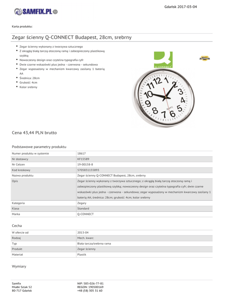 Gdańsk 2017-03-04 Karta produktu: Zegar ścienny Q-CONNECT Budapest, 28cm, srebrny Zegar ścienny wykonany z tworzywa sztucznego Z okrągłą białą tarczą otoczoną ramą i zabezpieczony plastikową szybką Nowoczesny design oraz czytelna typografia cyfr Dwie czarne wskazówki plus jedna - czerwona - sekundowa Zegar wyposażony w mechanizm kwarcowy zasilany 1 baterią AA Średnica: 28cm Grubość: 4cm Kolor srebrny Cena 43,44 PLN brutto Podstawowe parametry produktu Numer produktu w systemie 18617 Nr dostawcy KF15589 Nr Celcen 19-00158-8 Kod kreskowy 5705831155893 Nazwa produktu Zegar ścienny Q-CONNECT Budapest, 28cm, srebrny Opis Zegar ścienny wykonany z tworzywa sztucznego; z okrągłą białą tarczą otoczoną ramą i zabezpieczony plastikową szybką; nowoczesny design oraz czytelna typografia cyfr; dwie czarne wskazówki plus jedna - czerwona - sekundowa; zegar wyposażony w mechanizm kwarcowy zasilany 1 baterią AA; średnica: 28cm; grubość: 4cm; kolor srebrny Kategoria Zegary Klasa Standard Marka Q-CONNECT Cecha W ofercie od 2013-04 Rodzaj Mech. kwarc Typ Biała tarcza/srebrna rama Produkt Zegar ścienny Materiał Plastik Wymiary Samfix Miałki Szlak 52 80-717 Gdańsk NIP: 583-026-77-81 REGON: 190500169 +48 (58) 305 31 60 Gdańsk 2017-03-04 Karta katalogowa produktu cd. Zegar ścienny Q-CONNECT Budapest, 28cm, srebrny Rozmiar Śr 28cm Wspólny słownik zamówień CPV 39254120-4 Wyposażenie domowe Certyfikaty Nowy produkt w ofercie Standard Hit Standard Kolor Kolor Srebrny Serdecznie zapraszamy do współpracy Zespół Samfix. Samfix Miałki Szlak 52 80-717 Gdańsk NIP: 583-026-77-81 REGON: 190500169 +48 (58) 305 31 60